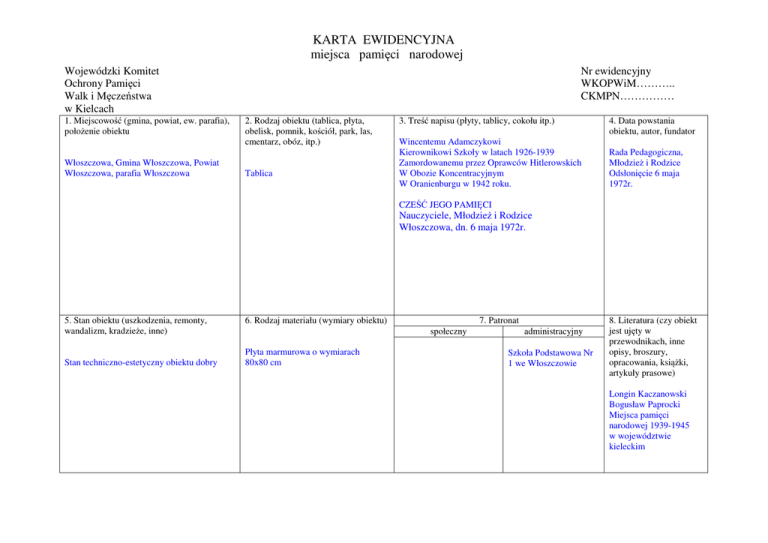 KARTA EWIDENCYJNA miejsca pamięci narodowej Wojewódzki Komitet Ochrony Pamięci Walk i Męczeństwa w Kielcach 1. Miejscowość (gmina, powiat, ew. parafia), położenie obiektu Włoszczowa, Gmina Włoszczowa, Powiat Włoszczowa, parafia Włoszczowa Nr ewidencyjny WKOPWiM……….. CKMPN…………… 2. Rodzaj obiektu (tablica, płyta, obelisk, pomnik, kościół, park, las, cmentarz, obóz, itp.) Tablica 3. Treść napisu (płyty, tablicy, cokołu itp.) Wincentemu Adamczykowi Kierownikowi Szkoły w latach 1926-1939 Zamordowanemu przez Oprawców Hitlerowskich W Obozie Koncentracyjnym W Oranienburgu w 1942 roku. 4. Data powstania obiektu, autor, fundator Rada Pedagogiczna, Młodzież i Rodzice Odsłonięcie 6 maja 1972r. CZEŚĆ JEGO PAMIĘCI Nauczyciele, Młodzież i Rodzice Włoszczowa, dn. 6 maja 1972r. 5. Stan obiektu (uszkodzenia, remonty, wandalizm, kradzieże, inne) Stan techniczno-estetyczny obiektu dobry 6. Rodzaj materiału (wymiary obiektu) 7. Patronat społeczny Płyta marmurowa o wymiarach 80x80 cm administracyjny Szkoła Podstawowa Nr 1 we Włoszczowie 8. Literatura (czy obiekt jest ujęty w przewodnikach, inne opisy, broszury, opracowania, książki, artykuły prasowe) Longin Kaczanowski Bogusław Paprocki Miejsca pamięci narodowej 1939-1945 w województwie kieleckim KARTA EWIDENCYJNA miejsca pamięci narodowej 9. Miejsce na fotografię 10. Dane historyczne dot. obiektu 11. Data zaprowadzenia karty Tablica poświęcona Kierownikowi Szkoły w latach 1926-1939 zamordowanemu przez hitlerowców w obozie koncentracyjnym 13. Lokalizacja obiektu (opis lub szkic planu położenia obiektu) Tablica znajduje się w środku budynku Szkoły Podstawowej Nr 1 we Włoszczowie im. J. Piłsudskiego, ul. Partyzantów. 14. Prowadzący kartę Izabela Juda-Proch (podpis) 12. Dodatkowe uwagi, uzupełnienia