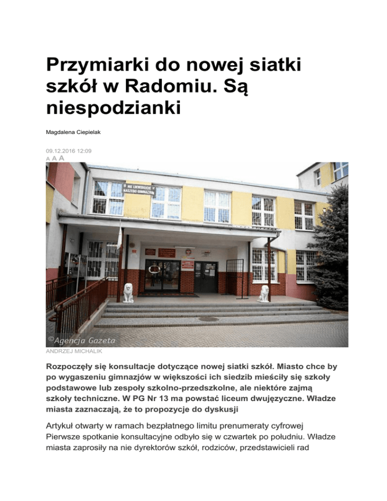 Przymiarki do nowej siatki szkół w Radomiu. Są niespodzianki Magdalena Ciepielak 09.12.2016 12:09 A AA ANDRZEJ MICHALIK Rozpoczęły się konsultacje dotyczące nowej siatki szkół. Miasto chce by po wygaszeniu gimnazjów w większości ich siedzib mieściły się szkoły podstawowe lub zespoły szkolno-przedszkolne, ale niektóre zajmą szkoły techniczne. W PG Nr 13 ma powstać liceum dwujęzyczne. Władze miasta zaznaczają, że to propozycje do dyskusji Artykuł otwarty w ramach bezpłatnego limitu prenumeraty cyfrowej Pierwsze spotkanie konsultacyjne odbyło się w czwartek po południu. Władze miasta zaprosiły na nie dyrektorów szkół, rodziców, przedstawicieli rad pedagogicznych i związków zawodowych działających w oświacie. W biurze prasowym zapowiedziano, że jest to spotkanie robocze i nie przewidziano w nim udziału mediów. Jak się dowiedzieliśmy nieoficjalnie wyjściowa propozycja miasta jest taka: siedziba Publicznego Gimnazjum Nr 5 przy Warszawskiej ma być częścią Publicznej Szkoły Podstawowej Nr 5 przy Sowińskiego (przy Warszawskiej mają się uczyć starsze dzieci). Do PG Nr 8 przy Piastowskiej ma się przenieść Zespół Szkół Specjalnych Nr 1 przy Armii Ludowej. Argumentowano, że dla dzieci niepełnosprawnych będzie to dobra zmiana - budynek gimnazjum na Michałowie jest parterowy i mieści się w nim basen. Do PG nr 3 przy Czarnoleskiej przenieść się ma zaś PSP Nr 17 z Wierzbickiej (jest plan, aby swoją siedzibę siedemnastka przekazała z kolei pobliskiej szkole integracyjnej). Siedzibę PG nr 6 przy Sadkowskiej ma zająć mieszczący się po sąsiedzku Elektronik, który narzeka na ciasnotę. PG Nr 1 przy Staromiejskiej zajmie z kolei Zespół Szkół Technicznych. Według propozycji miasta w budynku PG Nr 2 przy Gagarina będzie się mieściła szkoła podstawowa z oddziałami integracyjnymi, w PG Nr 4 przy Osiedlowej prawdopodobnie zespół szkolno-przedszkolny (w budynku jest gimnazjum i liceum sportowe, które nie miało w tym roku naboru), w PG Nr 10 przy Długojowskiej - zespół szkolno-przedszkolny, w PG Nr 11 przy Kujawskiej szkoła podstawowa, w PG Nr 12 przy Kruczej - szkoła podstawowa z możliwością tworzenia oddziałów przedszkolnych, w PG Nr 22 przy Rapackiego pomieszczenia zajmie PSP Nr 6, która dzieli z nim budynek. Miasto chce uwzględnić propozycję społeczności PG Nr 13 przy 25 Czerwca, by w tej szkole od nowego roku zaczęło działać liceum dwujęzyczne. - Ta szkoła zasłużyła by jej dać szansę, są w Radomiu licea, które nie mają naboru, a lepiej zainwestować w instytucję, która będzie wyrazista, bo będzie dwujęzyczna. Dla mnie ważne jest, że wszystkie siedziby gimnazjów zostały zagospodarowane na potrzeby szkół. Nie ma typowej likwidacji gimnazjów komentuje propozycje miasta Leszek Pożyczka, szef komisji edukacji w radzie miejskiej. Jak się dowiadujemy, ambicje na otworzenie liceum z klasami sportowymi (specjalność koszykówka) ma też PG Nr 3 na Południu. Co o propozycjach miasta sądzi szef ZNP w Radomiu Tomasz Korczak? Wciąż analizuję, entuzjazmem nie pałam, za wcześniej na ocenę - słyszymy. Kolejne spotkania 5 stycznia. Nie są jeszcze ustalone obwody szkół podstawowych. Zespół konsultacyjny ma przeanalizować przedstawioną propozycję miasta i zgłosić uwagi. Przypomnijmy, gminy mają przedstawić nową sieć szkół do 17 lutego, wcześniej pozytywnie musi ją zaopiniować kurator.