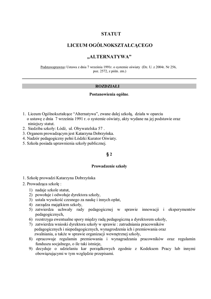STATUT LICEUM OGÓLNOKSZTAŁCĄCEGO „ALTERNATYWA” Podstawaprawna: Ustawa z dnia 7 września 1991r. o systemie oświaty (Dz. U. z 2004r. Nr 256, poz. 2572, z późn. zm.) ROZDZIAŁI Postanowienia ogólne. 1. Liceum Ogólnokształcące “Alternatywa”, zwane dalej szkołą, działa w oparciu o ustawę z dnia 7 września 1991 r. o systemie oświaty, akty wydane na jej podstawie oraz niniejszy statut. 2. Siedziba szkoły: Łódź, ul. Obywatelska 57 . 3. Organem prowadzącym jest Katarzyna Dobrzyńska. 4. Nadzór pedagogiczny pełni Łódzki Kurator Oświaty. 5. Szkoła posiada uprawnienia szkoły publicznej. §2 Prowadzenie szkoły 1. Szkołę prowadzi Katarzyna Dobrzyńska 2. Prowadząca szkołę : 1) nadaje szkole statut, 2) powołuje i odwołuje dyrektora szkoły, 3) ustala wysokość czesnego za naukę i innych opłat, 4) zarządza majątkiem szkoły, 5) zatwierdza uchwały rady pedagogicznej w sprawie innowacji i eksperymentów pedagogicznych, 6) rozstrzyga ewentualne spory między radą pedagogiczną a dyrektorem szkoły, 7) zatwierdza wnioski dyrektora szkoły w sprawie : zatrudniania pracowników pedagogicznych i niepedagogicznych, wynagrodzenia ich i premiowania oraz zwalniania, a także w sprawie organizacji wewnętrznej szkoły, 8) opracowuje regulamin premiowania i wynagradzania pracowników oraz regulamin funduszu socjalnego, o ile taki istnieje, 9) decyduje o udzielaniu kar porządkowych zgodnie z Kodeksem Pracy lub innymi obowiązującymi w tym względzie przepisami. ROZDZIAŁII Cele i zadania szkoły. 1. 2. 3. 4. 5. 6. §3 Celem szkoły jest umożliwienie słuchaczom zdobycie wykształcenia średniego oraz uzyskanie świadectwa dojrzałości po zdaniu egzaminu maturalnego. Szkoła zapewnia słuchaczom pełen rozwój intelektualny i społeczny zgodny z ich potrzebami, w warunkach poszanowania godności osobistej oraz wolności światopoglądowej i wyznaniowej. Szkoła zapewnia bezpieczne i higieniczne warunki nauki i pracy. Szkoła realizuje podstawę programową kształcenia ogólnego określoną rozporządzeniem ministra właściwego do spraw oświaty. Kształcenie w szkole ma na celu wszechstronny rozwój osobowości słuchaczy, uwzględniający indywidualne zainteresowania , uzdolnienia i predyspozycje psychofizyczne; Szkoła kieruje samodzielną nauką słuchaczy, uczy racjonalnej organizacji pracy, wskazuje metody i techniki samodzielnego zdobywania wiedzy, korzystania z nowoczesnych źródeł informacji. ROZDZIAŁIII Organy szkoły i ich kompetencje. §4 1. Organami szkoły są: - dyrektor szkoły ; - rada pedagogiczna. 2. Dyrektora powołuje osoba prowadząca szkołę. 3. Dyrektor kieruje szkołą i reprezentuje ją na zewnątrz. 4. Do obowiązków dyrektora należy: 1) organizowanie pracy szkoły, opracowanie dokumentów programowo-organizacyjnych; 2) wykonywanie innych zadań wynikających z przepisów szczególnych w tym właściwa organizacja egzaminów zewnętrznych ; 3) prowadzenie dokumentacji szkolnej określonej odrębnymi przepisami; 4) rekrutacja słuchaczy oraz prowadzenie ich spraw w oparciu o przepisy prawa oświatowego; 5) zapewnienie bezpieczeństwa i higieny pracy i nauki; 6) współpraca z przedstawicielami słuchaczy; 7) dbałość o powierzone przez prowadzącego mienie szkoły; 8) realizowanie zarządzeń właściciela oraz uchwał rady pedagogicznej podjętych w ramach jej kompetencji stanowiących; 9) wstrzymanie uchwał rady pedagogicznej podjętych z naruszeniem prawa oraz niezwłoczne poinformowanie osoby prowadzącej oraz organu nadzoru pedagogicznego; 10) terminowe składanie sprawozdań określonych odrębnymi przepisami; 11) okresowe informowanie prowadzącego szkołę o wyniku działania szkoły. 5. Dyrektor szkoły ma prawo: 2 1) wydawania poleceń służbowych wszystkim pracownikom szkoły w ramach swoich kompetencji; 2) wykorzystania, po konsultacji z radą pedagogiczną, środków finansowych przyznanych na bieżącą działalność szkoły; 3) reprezentowania szkoły na zewnątrz oraz podpisywania bieżących dokumentów i korespondencji. 6. Dyrektor szkoły odpowiada przed prowadzącym szkołę za: 1) prawidłową organizację procesu kształcenia 2) efekty kształcenia oraz osiągane przez słuchaczy wyniki; 3) zgodność funkcjonowania szkoły z przepisami prawa oświatowego i niniejszego statutu; 4) bezpieczeństwo osób znajdujących się w obiekcie szkoły i podczas zajęć organizowanych przez szkołę oraz za stan sanitarny i stan ochrony przeciwpożarowej obiektów szkolnych; 5) celowe wykorzystanie środków przeznaczonych na bieżącą działalność szkoły; 6) zgodne z przepisami prowadzenie dokumentacji szkolnej oraz pracowniczej; 7) bezpieczeństwo pieczęci i druków ścisłego zarachowania. 7. Dyrektor szkoły może być odwołany ze stanowiska: 1) przez prowadzącego szkołę, zgodnie z przepisami Kodeksu Pracy, 2) na własną prośbę. 8. W wypadku nieobecności dyrektora jego obowiązki pełni upoważniony pisemnie przez niego członek rady pedagogicznej. 9. Dyrektor za pełnienie obowiązków pobiera pensję stanowiącą trzykrotną wartość średniego wynagrodzenia ogłoszonego przez ZUS jako podstawa wymiaru składek na ubezpieczenia zdrowotne , jednak ma prawo wstrzymać powyższe wynagrodzenie w każdej chwili i na dowolny okres. §5 1. Rada pedagogiczna jest kolegialnym organem szkoły, w skład którego wchodzą wszyscy nauczyciele zatrudnieni w szkole. 2. Przewodniczącym rady pedagogicznej jest dyrektor szkoły. 3. Uchwały rady pedagogicznej zapadają zwykłą większością głosów w obecności co najmniej połowy jej członków. 4. Posiedzenia rady pedagogicznej są protokołowane. 5. W zebraniach rady pedagogicznej mogą brać udział z głosem doradczym osoby zapraszane przez jej przewodniczącego. 6. Członkowie rady pedagogicznej są zobowiązani do nie ujawniania spraw, które mogłyby naruszyć dobro osobiste słuchaczy, ich rodziców, a także nauczycieli i innych pracowników szkoły. 