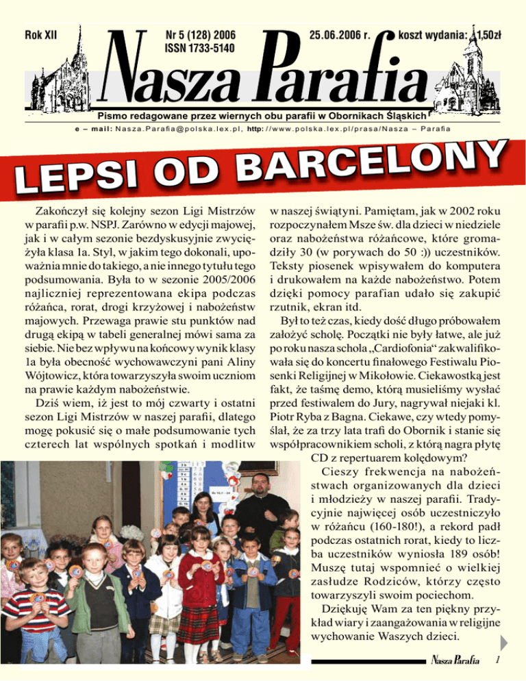 Rok XII Nr 5 (128) 2006 ISSN 1733-5140 25.06.2006 r. koszt wydania: 1,50 z³ Pismo redagowane przez wiernych obu parafii w Obornikach Œl¹skich e – m a i l : N a s z a . P a r a Þ a @ p o l s k a . l e x . p l , http: / / w w w . p o l s k a . l e x . p l / p r a s a / N a s z a – P a r a Þ a Y N O L E C R A B LE PS I O D Zakończył się kolejny sezon Ligi Mistrzów w paraÞi p.w. NSPJ. Zarówno w edycji majowej, jak i w całym sezonie bezdyskusyjnie zwyciężyła klasa 1a. Styl, w jakim tego dokonali, upoważnia mnie do takiego, a nie innego tytułu tego podsumowania. Była to w sezonie 2005/2006 najliczniej reprezentowana ekipa podczas różańca, rorat, drogi krzyżowej i nabożeństw majowych. Przewaga prawie stu punktów nad drugą ekipą w tabeli generalnej mówi sama za siebie. Nie bez wpływu na końcowy wynik klasy 1a była obecność wychowawczyni pani Aliny Wójtowicz, która towarzyszyła swoim uczniom na prawie każdym nabożeństwie. Dziś wiem, iż jest to mój czwarty i ostatni sezon Ligi Mistrzów w naszej paraÞi, dlatego mogę pokusić się o małe podsumowanie tych czterech lat wspólnych spotkań i modlitw w naszej świątyni. Pamiętam, jak w 2002 roku rozpoczynałem Msze św. dla dzieci w niedziele oraz nabożeństwa różańcowe, które gromadziły 30 (w porywach do 50 :)) uczestników. Teksty piosenek wpisywałem do komputera i drukowałem na każde nabożeństwo. Potem dzięki pomocy parafian udało się zakupić rzutnik, ekran itd. Był to też czas, kiedy dość długo próbowałem założyć scholę. Początki nie były łatwe, ale już po roku nasza schola „Cardiofonia“ zakwaliÞkowała się do koncertu Þnałowego Festiwalu Piosenki Religijnej w Mikołowie. Ciekawostką jest fakt, że taśmę demo, którą musieliśmy wysłać przed festiwalem do Jury, nagrywał niejaki kl. Piotr Ryba z Bagna. Ciekawe, czy wtedy pomyślał, że za trzy lata traÞ do Obornik i stanie się współpracownikiem scholi, z którą nagra płytę CD z repertuarem kolędowym? Cieszy frekwencja na nabożeństwach organizowanych dla dzieci i młodzieży w naszej paraÞi. Tradycyjnie najwięcej osób uczestniczyło w różańcu (160-180!), a rekord padł podczas ostatnich rorat, kiedy to liczba uczestników wyniosła 189 osób! Muszę tutaj wspomnieć o wielkiej zasłudze Rodziców, którzy często towarzyszyli swoim pociechom. Dziękuję Wam za ten piękny przykład wiary i zaangażowania w religijne wychowanie Waszych dzieci. 1 Podziękowania należą się także Tadziowi Olejniczakowi, który był pierwszym gitarzystą naszej scholi i niezawodnym współpracownikiem podczas pierwszych Mszy św. i nabożeństw dla dzieci. Dziękuję serdecznie MOIM KOCHANYM DZIEWCZYNOM Z „CARDIOFONII“! Dzięki Wam Liga Mistrzów była rozśpiewana i wesoła. Oprócz talentów wokalnych schola wielokrotnie prezentowała swoje umiejętności aktorskie. Tradycją stały się przedstawienia teatralne z okazji Świąt Bożego Narodzenia i Wielkanocy, prezentowane podczas Mszy św. o 12.30. Kończąc to moje sentymentalne podsumowanie, pragnę podziękować wszystkim, którzy pomagali mi w jakikolwiek sposób w sianiu ziarna Ewangelii w sercach dzieciątek w Obornikach. Szczególnie serdecznie dziękuję ks. Proboszczowi Edwardowi oraz moim współbraciom za to, że zawsze wspierali mnie czynem i modlitwą! Niech to zasiane ziarno radosnej i spontanicznej modlitwy wzrasta! Ks. Irek Kiełbasa SDS Tabela Majowej Ligi Mistrzów 2006: 1. 1a 2. 2b 3. J.st. 4. 2a 5. 3a 6. 3b 7. J.mł. 8. 5c 9. 1b 10. 4a 280 pkt. 196 pkt. 195 pkt. 194 pkt. 133 pkt. 117 pkt. 73 pkt. 66 pkt. 60 pkt. 58 pkt. 11. G.1f 12. 4b 13. 5a 14. G.1b 15. 6a 16. G.1c 17. G.1e 18. 6b 19. 5b 56 pkt. 54 pkt. 51 pkt. 29 pkt. 24 pkt. 23 pkt. 14 pkt. 12 pkt. 6 pkt. Tabela Ligi Mistrzów w paraÞi p.w. NSPJ w sezonie 2005/2006 1. 1a 2. Jun. St. 3. 3a 4. 2b 5. 2a 6. 3b 7. 4a 8. 6a 9. 5a 10. 6b 11. 1b 12. 5c 13. 4b 14. Jun. 951 pkt. 836 pkt. 744 pkt. 686 pkt.. 685 pkt 517 pkt. 483 pkt. 384 pkt. 308 pkt. 294 pkt. 279 pkt. 272 pkt. 253 pkt. Mł. 165 pkt. 15. G.1f 16. 5b 17. G.1c 18. G.2d 19. G.3e 20. G.1b 21. 3c+ 22. G.2e 23. G.2c 24. G.2f 25. G.1e 26. G.2a(P) 27. G.3d 28. 1b+ 163 pkt. 145 pkt. 122 pkt. 114 pkt. 82 pkt. 61 pkt. 59 pkt. 53 pkt. 45 pkt. 39 pkt. 38 pkt. 37 pkt. 24 pkt. 6 pkt. Ewangelizacja XXI wieku Wciąż na nowo staramy się odkrywać słowa duchowego testamentu, który pozostawił nam – swoim duchowym synom i córkom – O. Jordan. To, co stanowi o wyjątkowości jego słów, to nakaz głoszenia O. Franciszek Maria od Chrystusa, dopóki na Ziemi Krzyża Jordan nie pozostanie choćby jeden założyciel salwatorianów człowiek, który jeszcze nie Dopóki żyje na świecie choćby jeden tylko człowiek, który nie zna i nie kocha Jezusa Chrystusa Zbawiciela Świata – nie wolno ci spocząć! 2 pokochał Go całym sercem. W realizacji tego zadania nasz założyciel polecił kierować się wszystkimi sposobami, jakie tylko podyktuje Miłość Chrystusa. Już sam O. Jordan u początków zgromadzenia wysyłał pierwszych salwatorianów na misje do Indii, a z czasem za- Uroczystość Najświętszego Serca Pana Jezusa. Słowo na dziś …jeden z żołnierzy włócznią przebił Mu bok i natychmiast wypłynęła krew i woda. J 19, 35 Czerwiec to miesiąc poświęcony Najświętszemu Sercu Pana Jezusa. Centralną uroczystością jest piątek po zakończeniu oktawy Uroczystości Bożego Ciała, kiedy w sposób szczególny chcemy uczcić Najświętsze Serce Jezusa. W Tym Sercu otwartym dla nas na Golgocie znajdujemy prawdziwe źródło Miłości dla nas i całego świata. Serce, które otwarło się dla każdego człowieka, stało się naszą ostoją i miejscem schronienia. W Nim możemy znaleźć ukojenie dla naszych ciał i dusz. W Nim jest nasze zdrowie i nasze życie.To niezgłębiona tajemnica Miłości Boga do człowieka, która swoje spełnienie znalazła na Krzyżu i otworzyła nam drogę do Domu Ojca. Najświętsze Serce 
