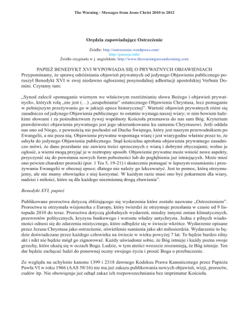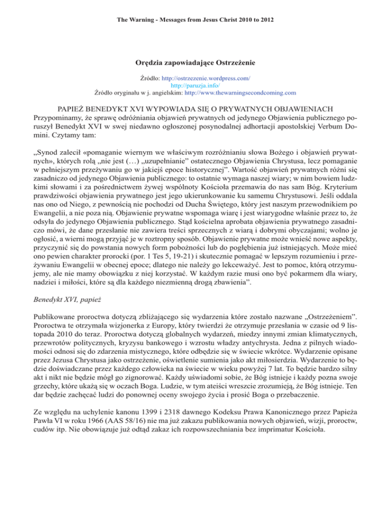 The Warning - Messages from Jesus Christ 2010 to 2012 Orędzia zapowiadające Ostrzeżenie Źródło: http://ostrzezenie.wordpress.com/ http://paruzja.info/ Źródło oryginału w j. angielskim: http://www.thewarningsecondcoming.com PAPIEŻ BENEDYKT XVI WYPOWIADA SIĘ O PRYWATNYCH OBJAWIENIACH Przypominamy, że sprawę odróżniania objawień prywatnych od jedynego Objawienia publicznego poruszył Benedykt XVI w swej niedawno ogłoszonej posynodalnej adhortacji apostolskiej Verbum Domini. Czytamy tam: „Synod zalecił «pomaganie wiernym we właściwym rozróżnianiu słowa Bożego i objawień prywatnych», których rolą „nie jest (…) „uzupełnianie” ostatecznego Objawienia Chrystusa, lecz pomaganie w pełniejszym przeżywaniu go w jakiejś epoce historycznej”. Wartość objawień prywatnych różni się zasadniczo od jedynego Objawienia publicznego: to ostatnie wymaga naszej wiary; w nim bowiem ludzkimi słowami i za pośrednictwem żywej wspólnoty Kościoła przemawia do nas sam Bóg. Kryterium prawdziwości objawienia prywatnego jest jego ukierunkowanie ku samemu Chrystusowi. Jeśli oddala nas ono od Niego, z pewnością nie pochodzi od Ducha Świętego, który jest naszym przewodnikiem po Ewangelii, a nie poza nią. Objawienie prywatne wspomaga wiarę i jest wiarygodne właśnie przez to, że odsyła do jedynego Objawienia publicznego. Stąd kościelna aprobata objawienia prywatnego zasadniczo mówi, że dane przesłanie nie zawiera treści sprzecznych z wiarą i dobrymi obyczajami; wolno je ogłosić, a wierni mogą przyjąć je w roztropny sposób. Objawienie prywatne może wnieść nowe aspekty, przyczynić się do powstania nowych form pobożności lub do pogłębienia już istniejących. Może mieć ono pewien charakter prorocki (por. 1 Tes 5, 19-21) i skutecznie pomagać w lepszym rozumieniu i przeżywaniu Ewangelii w obecnej epoce; dlatego nie należy go lekceważyć. Jest to pomoc, którą otrzymujemy, ale nie mamy obowiązku z niej korzystać. W każdym razie musi ono być pokarmem dla wiary, nadziei i miłości, które są dla każdego niezmienną drogą zbawienia”. Benedykt XVI, papież Publikowane proroctwa dotyczą zbliżającego się wydarzenia które zostało nazwane „Ostrzeżeniem”. Proroctwa te otrzymała wizjonerka z Europy, który twierdzi że otrzymuje przesłania w czasie od 9 listopada 2010 do teraz. Proroctwa dotyczą globalnych wydarzeń, miedzy innymi zmian klimatycznych, przewrotów politycznych, kryzysu bankowego i wzrostu władzy antychrysta. Jedna z pilnych wiadomości odnosi się do zdarzenia mistycznego, które odbędzie się w świecie wkrótce. Wydarzenie opisane przez Jezusa Chrystusa jako ostrzeżenie, oświetlenie sumienia jako akt miłosierdzia. Wydarzenie to będzie doświadczane przez każdego człowieka na świecie w wieku powyżej 7 lat. To będzie bardzo silny akt i nikt nie będzie mógł go zignorować. Każdy uświadomi sobie, że Bóg istnieje i każdy pozna swoje grzechy, które ukażą się w oczach Boga. Ludzie, w tym ateiści wreszcie zrozumieją, że Bóg istnieje. Ten dar będzie zachęcać ludzi do ponownej oceny swojego życia i prosić Boga o przebaczenie. Ze względu na uchylenie kanonu 1399 i 2318 dawnego Kodeksu Prawa Kanonicznego przez Papieża Pawła VI w roku 1966 (AAS 58/16) nie ma już zakazu publikowania nowych objawień, wizji, proroctw, cudów itp. Nie obowiązuje już odtąd zakaz ich rozpowszechniania bez imprimatur Kościoła. I Nr. Wiadomość: • • 300 301 302 303 304 305 306 307 308 309 310 311 312 313 314 315 316 317 318 319 320 321 322 323 324 325 326 Index Otrzymane: strona: O orędziach Ostrzeżenie by Dzieckonmp w dniu 07.11.2011 Telefoniczna rozmowa z Marią Miłosierdzia Bożego, Środa, 2 listopada wizjonerką odbierającą przekazy Ostrzeżenia Najświętsza Maria Panna: Tymczasowy pokój Niedziela, 1 stycznia 2012, godz. 15:00 na świecie, jeśli ciemne dusze nawrócą się Istnieje tylko jedna Prawda. Jedno Światło. Niedziela, 1 stycznia 2012, godz. 17:30 Cokolwiek innego jest kłamstwem. Najświętsza Maria Panna: Czas triumfu Mojego Poniedziałek, 2 stycznia 2012 Niepokalanego Serca nie jest daleki Bóg Ojciec: Dwa miliardy dusz nawróci się, Wtorek, 3 stycznia 2012, godz. 15:30 jako rezultat tych orędzi Bardzo niedługo dam się poznać Środa, 4 stycznia 2012, godz. 18:15 Usiłowanie wojny nuklearnej na Wschodzie Środa, 4 stycznia 2012, godz.19:20 Osądzając i przeklinając innych w Moim Imieniu, Sobota, 7 stycznia 2012, godz. 15:40 plujecie Mi w twarz Bóg Ojciec – Wy, Moje ukochane dzieci, Niedziela, 8 stycznia 2012, godz.14:04 macie przed sobą chwalebną przyszłość Jezus woła do dzieci na całym świecie Niedziela, 8 stycznia 2012, godz.15:30 Po Globalnej Spowiedzi przygotuję Poniedziałek, 9 stycznia 2012 Moje Powtórne Przyjście Najświętsza Maria Panna: Tak wiele dusz Wtorek, 10 stycznia 2012, godz. 20:30 wybiera ignorowanie znaków, które daję Największa okropność od czasu Holokaustu Środa, 11 stycznia 2012, godz. 15:00 knuta jest przeciwko Żydom Módlcie się za dusze w stanie grzechu śmiertelnego, Czwartek, 12 stycznia 2012 które być może nie będą miały szansy poproszenia o odkupienie win Najświętsza Maria Panna: Krucjata Modlitwy (19) Piątek, 13 stycznia 2012, godz.08:00 – Modlitwa za młodych ludzi Najświętsza Maria Panna – Moje dziecko, Piątek, 13 stycznia 2012, godz.20:15 wkrótce na ziemi zapanuje pokój Naukowcy publicznie zaprzeczą, Piątek, 13 stycznia 2012,, godz. 21:35 że ten Cud miał miejsce Bóg Ojciec: Ostatni posłaniec, aby zapowiedzieć Poniedziałek, 16 stycznia 2012 Powtórne Przyjście Wyświęceni słudzy, będziecie prowadzeni Wtorek, 17 stycznia 2012, godz.14.00 w stronę fałszywego proroka Najświętsza Maria Panna: Nikczemny plan wewnątrz Środa, 18 stycznia 2012, godz. 9:50 Watykanu w celu zniszczenia Kościoła Katolickiego Antychryst, który ukryty jest za kulisami, Czwartek, 19 stycznia 2012 wkr
