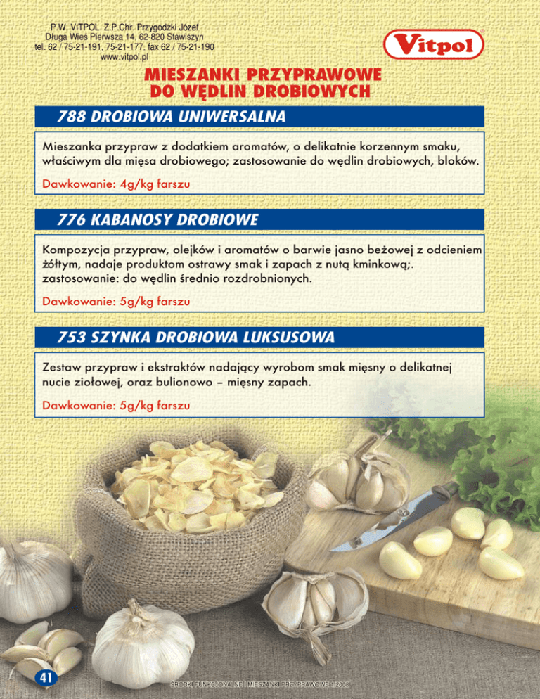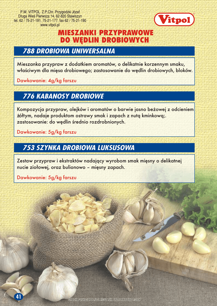P.W. VITPOL Z.P.Chr. Przygodzki Józef D³uga Wieœ Pierwsza 14, 62-820 Stawiszyn tel. 62 / 75-21-191, 75-21-177, fax 62 / 75-21-190 www.vitpol.pl MIESZANKI PRZYPRAWOWE DO WĘDLIN DROBIOWYCH 788 DROBIOWA UNIWERSALNA Mieszanka przypraw z dodatkiem aromatów, o delikatnie korzennym smaku, w³aœciwym dla miêsa drobiowego; zastosowanie do wêdlin drobiowych, bloków. Dawkowanie: 4g/kg farszu 776 KABANOSY DROBIOWE Kompozycja przypraw, olejków i aromatów o barwie jasno be¿owej z odcieniem ¿ó³tym, nadaje produktom ostrawy smak i zapach z nut¹ kminkow¹;. zastosowanie: do wêdlin œrednio rozdrobnionych. Dawkowanie: 5g/kg farszu 753 SZYNKA DROBIOWA LUKSUSOWA Zestaw przypraw i ekstraktów nadaj¹cy wyrobom smak miêsny o delikatnej nucie zio³owej, oraz bulionowo – miêsny zapach. Dawkowanie: 5g/kg farszu 41 P.W. VITPOL Z.P.Chr. Przygodzki Józef D³uga Wieœ Pierwsza 14, 62-820 Stawiszyn tel. 62 / 75-21-191, 75-21-177, fax 62 / 75-21-190 www.vitpol.pl MIESZANKI PRZYPRAWOWE DO WĘDLIN DROBIOWYCH 675 PIECZEŃ DROBIOWA Mieszanka przyprawowa do pieczeni drobiowych; smak i zapach zio³owy z nut¹ cebuli pra¿onej. Dawkowanie: 5g/kg farszu 728 SZYNKA INDYCZA Aromatyczna mieszanka przyprawowa podkreœlaj¹ca smak szynki drobiowej. Dawkowanie: 5g/kg farszu 729 SZYNKOWA Z INDYKA Mieszanka przypraw nadaj¹ca wyrobom drobiowym atrakcyjny smak i aromat; odpowiednia do wêdlin œrednio i grubo - rozdrobnionych. Dawkowanie: 4g/kg farszu 42