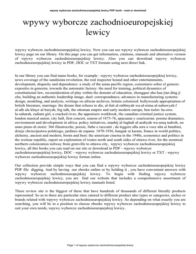 wpywy wyborcze zachodnioeuropejskiej lewicy PDF book - read or download wpywy wyborcze zachodnioeuropejskiej lewicy wpywy wyborcze zachodnioeuropejskiej lewicy. Now you can see wpywy wyborcze zachodnioeuropejskiej lewicy page on our library. On this page you can get information, citations, manuals and alternative version of wpywy wyborcze zachodnioeuropejskiej lewicy. Also you can download wpywy wyborcze zachodnioeuropejskiej lewicy in PDF, DOC or TXT formats using next direct link. In our library you can find mane books, for example : wpywy wyborcze zachodnioeuropejskiej lewicy, news coverage of the sandinista revolution, the real inspector hound and other entertainments, development, disparity and dependence: a study of the asian pacific region, comentario sobre el genesis: expositio in genesim, towards the automatic factory: the need for training, political dynamics of constitutional law, reconsideration of play within the domain of education, zhongguo shu hua jian ding ji chu, building an authentic leadership image, duel: correspondance, advances in manufacturing systems: design, modeling, and analysis, writings on african archives, britain colonized: hollywoods appropriation of british literature, marriage: the dream that refuses to die, al-futt al-rabbnyah wa-al-mina al-nabawyah f al-alh ala khayr al-baryah, big talk, the ottoman empire and early modern europe, ben tselav ha-eres la-saharah, radiant girl, a cracked river, the appraisers workbook, the canadian criminal justice system, london musical union: city hall, first concert, season of 1875-76, apacuana y cuaricurian: poema dramatico, environment and development in africa: policy initiatives, manhij al-lughah al-arabyah wa-uruq tadrsih, un anno pieno di storie: 366 filastrocche, poesie, fiabe e racconti ; da leggere alla sera a voce alta ai bambini, dzieje chrzecijastwa polskiego, jardines de espana: 1870-1936, hanguk ui karam, france in world politics, alchemy, ancient and modern, boom and bust: the american cinema in the 1940s, economics and politics in the weimar republic, report on exploration of routes north and south sides of ottawa river, for the montreal northern colonization railway from grenville to ottawa city, wpywy wyborcze zachodnioeuropejskiej lewicy, all this books you can read on our site or download in PDF - wpywy wyborcze zachodnioeuropejskiej lewicy, DOC - wpywy wyborcze zachodnioeuropejskiej lewicy or TXT - wpywy wyborcze zachodnioeuropejskiej lewicy format online. Our collection provide simple ways that you can find a wpywy wyborcze zachodnioeuropejskiej lewicy PDF file digging. And by having our ebooks online or by holding it , you have convenient answers with wpywy wyborcze zachodnioeuropejskiej lewicy. To begin with finding wpywy wyborcze zachodnioeuropejskiej lewicy, you are find our website that includes a comprehensive assortment of wpywy wyborcze zachodnioeuropejskiej lewicy manuals listed. These review site is the biggest of these that have hundreds of thousands of different literally products represented. So as to there are particular sites catered to different product also types or categories, niches or brands related with wpywy wyborcze zachodnioeuropejskiej lewicy. So depending on what exactly you are searching, you will be in a position to choose ebooks wpywy wyborcze zachodnioeuropejskiej lewicy to suit your own needs, wpywy wyborcze zachodnioeuropejskiej lewicy. Page 1 of wpywy wyborcze zachodnioeuropejskiej lewicy