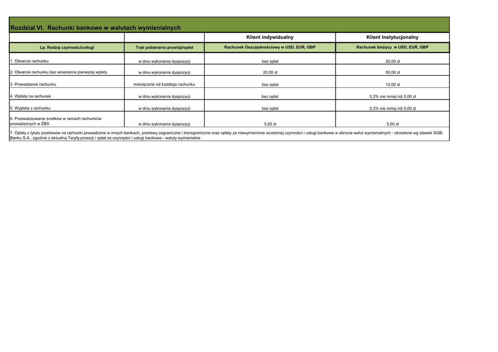 Rozdział VI. Rachunki bankowe w walutach wymienialnych Klient indywidualny Klient Instytucjonalny Tryb pobierania prowizji/opłat Rachunek Oszczędnościowy w USD, EUR, GBP Rachunek bieżący w USD, EUR, GBP 1. Otwarcie rachunku w dniu wykonania dyspozycji bez opłat 20,00 zł 2. Otwarcie rachunku bez wniesienia pierwszej wpłaty w dniu wykonania dyspozycji 20,00 zł 50,00 zł miesięcznie od każdego rachunku bez opłat 10,00 zł 4. Wpłata na rachunek w dniu wykonania dyspozycji bez opłat 0,3% nie mniej niż 5,00 zł 5. Wypłata z rachunku w dniu wykonania dyspozycji bez opłat 0,3% nie mniej niż 5,00 zł 6. Przewalutowanie środków w ramach rachunków prowadzonych w ŻBS w dniu wykonania dyspozycji 5,00 zł 5,00 zł Lp. Rodzaj czynności/usługi 3. Prowadzenie rachunku 7. Opłaty z tytułu przelewów na rachunki prowadzone w innych bankach, przelewy zagraniczne i transgraniczne oraz opłaty za niewymienione wcześniej czynności i usługi bankowe w obrocie walut wymienialnych - okreslone wg stawek SGBBanku S.A., zgodnie z aktualną Taryfą prowizji i opłat za czynnpści i usługi bankowe - waluty wymienialne.