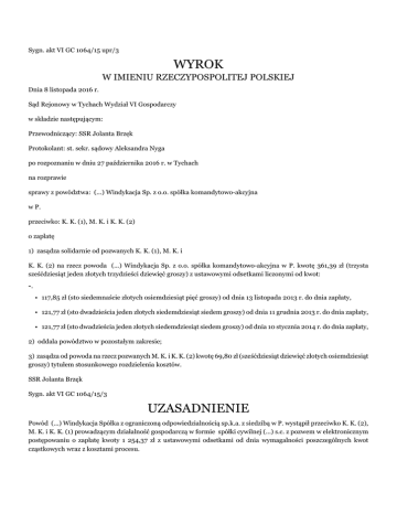 Sygn. akt VI GC 1064/15 upr/3 WYROK W IMIENIU RZECZYPOSPOLITEJ POLSKIEJ Dnia 8 listopada 2016 r. Sąd Rejonowy w Tychach Wydział VI Gospodarczy w składzie następującym: Przewodniczący: SSR Jolanta Brzęk Protokolant: st. sekr. sądowy Aleksandra Nyga po rozpoznaniu w dniu 27 października 2016 r. w Tychach na rozprawie sprawy z powództwa: (...) Windykacja Sp. z o.o. spółka komandytowo-akcyjna w P. przeciwko: K. K. (1), M. K. i K. K. (2) o zapłatę 1) zasądza solidarnie od pozwanych K. K. (1), M. K. i K. K. (2) na rzecz powoda (...) Windykacja Sp. z o.o. spółka komandytowo-akcyjna w P. kwotę 361,39 zł (trzysta sześćdziesiąt jeden złotych trzydzieści dziewięć groszy) z ustawowymi odsetkami liczonymi od kwot: -. • 117,85 zł (sto siedemnaście złotych osiemdziesiąt pięć groszy) od dnia 13 listopada 2013 r. do dnia zapłaty, • 121,77 zł (sto dwadzieścia jeden złotych siedemdziesiąt siedem groszy) od dnia 11 grudnia 2013 r. do dnia zapłaty, • 121,77 zł (sto dwadzieścia jeden złotych siedemdziesiąt siedem groszy) od dnia 10 stycznia 2014 r. do dnia zapłaty, 2) oddala powództwo w pozostałym zakresie; 3) zasądza od powoda na rzecz pozwanych M. K. i K. K. (2) kwotę 69,80 zł (sześćdziesiąt dziewięć złotych osiemdziesiąt groszy) tytułem stosunkowego rozdzielenia kosztów. SSR Jolanta Brzęk Sygn. akt VI GC 1064/15/3 UZASADNIENIE Powód (...) Windykacja Spółka z ograniczoną odpowiedzialnością sp.k.a. z siedzibą w P. wystąpił przeciwko K. K. (2), M. K. i K. K. (1) prowadzącym działalność gospodarczą w formie spółki cywilnej (...) s.c. z pozwem w elektronicznym postępowaniu o zapłatę kwoty 1 254,37 zł z ustawowymi odsetkami od dnia wymagalności poszczególnych kwot cząstkowych wraz z kosztami procesu. W uzasadnieniu powód wskazał, że pozwani prowadzą działalność gospodarczą w formie spółki cywilnej i byli związani umową o świadczenie usług telekomunikacyjnych z (...) S.A. w W. jako następcą prawnym (...) Sp. z o.o. w W. na podstawie, których wystawiono faktury VAT oraz notę obciążeniową, które to wierzytelności zakupione zostały od cedenta (...) S.A. w W. przez spółkę (...) sp. z o.o. z siedzibą w P., na podstawie umowy cesji zawartej w dniu 22 lipca 2014 r. W związku z niedotrzymaniem warunków umowy przez pozwanych w okresie promocyjnym, umowa została rozwiązana przez cedenta z przyczyn leżących po stronie pozwanych i cedent wystawił notę obciążeniową obejmującą wszystkie udzielone przy zawieraniu umów upusty przy zakupie sprzętu, rabaty abonamentowe oraz rabaty za usługi dodatkowe. Wysokość noty obciążeniowej została obliczona jako iloczyn wysokości przyznanych ulg i liczby pełnych miesięcy pozostałych do końca okresu promocyjnego, podzielony przez liczbę miesięcy okresu promocyjnego, na który zostały zawarte umowy. Pozwani nie uregulowali należności wskazanych w nocie obciążeniowej i fakturze VAT. Pismem z dnia 30 stycznia 2015 r. pozwani zostali zawiadomieni o zawartej umowie cesji oraz wezwani do zapłaty dochodzonych należności. W dniu 14 maja 2015 r. w sprawie o sygn. VI Nc-e 789421/15 Sąd Rejonowy Lublin – Zachód w Lublinie wydał nakaz zapłaty w postępowaniu upominawczym. Pozwana K. K. (3) wniosła sprzeciw od nakazu zapłaty. Pozwana wskazała, że z dniem 25 września 2013 r. wspólnicy spółki cywilnej (...) wypowiedzieli swój udział w spółce w trybie natychmiastowym. Od sierpnia 2013 r. pozwana nie miała dostępu do jakiejkolwiek dokumentacji spółki cywilnej z powodu uniemożliwienia jej tego przez pozostałych wspólników, nie ma również dostępu do majątku spółki, który nie został z nią rozliczony. Postanowieniem z dnia 12 czerwca 2015 r. Sąd Rejonowy Lublin – Zachód w Lublinie przekazał sprawę do rozpoznania do Sądu Rejonowego w Tychach. W dalszym piśmie procesowym powód wskazał, iż pozwana nie podważyła skutecznie żądania pozwu. Pozwana nie zaprzeczyła, iż była wspólnikiem spółki cywilnej (...) s.c. wraz z K. K. (2) i M. K.. Nie zaprzeczyła również, że jako osoba upoważniona zawarła w imieniu spółki umowę o świadczenie usług telekomunikacyjnych z operatorem (...) S.A. jako następcą prawnym (...) sp. z o.o. z siedzibą w W.. Na zawartych przez spółkę umowach widnieją podpisy pozwanej, która zawarła umowę o świadczenie usług telekomunikacyjnych w imieniu spółki, która to umowa wiąże wszystkich wspólników. Na rozprawie w imieniu pozwanej M. K. i K. K. (2) pełnomocnik wniósł o oddalenie powództwa i o zasądzenie kosztów według norm przepisanych. Na uzasadnienie podał, że pozwani nie wiedzieli, że pozwana K. K. (1) zawierała umowy na telefony w imieniu spółki. Ponadto wskazał, że z dniem 25 września 2013 r. jego mocodawcy wypowiedzieli udziały w spółce i nie wiedzieli o rosnącym zadłużeniu za telefony. Sąd ustalił co następuje: Bezspornym było, że K. K. (1) w imieniu spółki cywilnej (...) s.c. zawarła z (...) Sp. z o.o. w W. w dniu 21 lipca 2011 r. umowę o świadczenie usług telekomunikacyjnych na czas oznaczony 24 miesięcy. Następnie w dniu 16 stycznia 2012 r. K. K. (1) również w imieniu spółki cywilnej (...) s.c. zawarła z (...) Sp. z o.o. w W. umowę o świadczenie usług telekomunikacyjnych na czas oznaczony 36 miesięcy dowód: umowy o świadczenie usług telekomunikacyjnych (k. 72-77, 78-87). (...) Sp. z o.o. w W. wystawiła na rzecz K. K. (1), M. K. i K. K. (2) tytułem usług telekomunikacyjnych faktury VAT nr: - (...) w dniu 26 października 2013 r., za okres od dnia 26 września 2013 r. do dnia 25 października 2013 r. na kwotę 121,77 zł, płatną do dnia 12 listopada 2013 r., - (...) w dniu 26 listopada 2013 r., za okres od dnia 26 października 2013 r. do dnia 25 listopada 2013 r. na kwotę 121,77 zł , płatną do dnia 10 grudnia 2013 r., - (...) w dniu 26 grudnia 2013 r., za okres od dnia 26 listopada 2013 r. do dnia 25 grudnia 