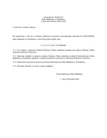 Uchwała Nr VII/042/07 Rady Miejskiej w Drezdenku z dnia 26 kwietnia 2007 roku w sprawie: wyboru sołtysa Na podstawie § 26 ust. 4 Statutu Sołectwa Czartowo uchwalonego Uchwałą Nr XXXI/238/04 Rady Miejskiej w Drezdenku z dnia 28 grudnia 2004 roku u c h w a l a się, co następuje: § 1. W związku z upływem kadencji Sołtysa i Rady sołeckiej zarządza się wybory Sołtysa i Rady sołeckiej sołectwa Czartowo. § 2. Zebranie wiejskie w sprawie wyboru Sołtysa i Rady sołeckiej zwołuje Przewodniczący Rady Miejskiej w Drezdenku zgodnie z postanowieniami zawartymi w Statucie Sołectwa Czartowo. § 3. Wykonanie uchwały powierza się Przewodniczącemu Rady Miejskiej w Drezdenku. § 4. Uchwała wchodzi w życie z dniem podjęcia. Przewodniczący Rady Miejskiej /-/ Jerzy Skrzypczyński