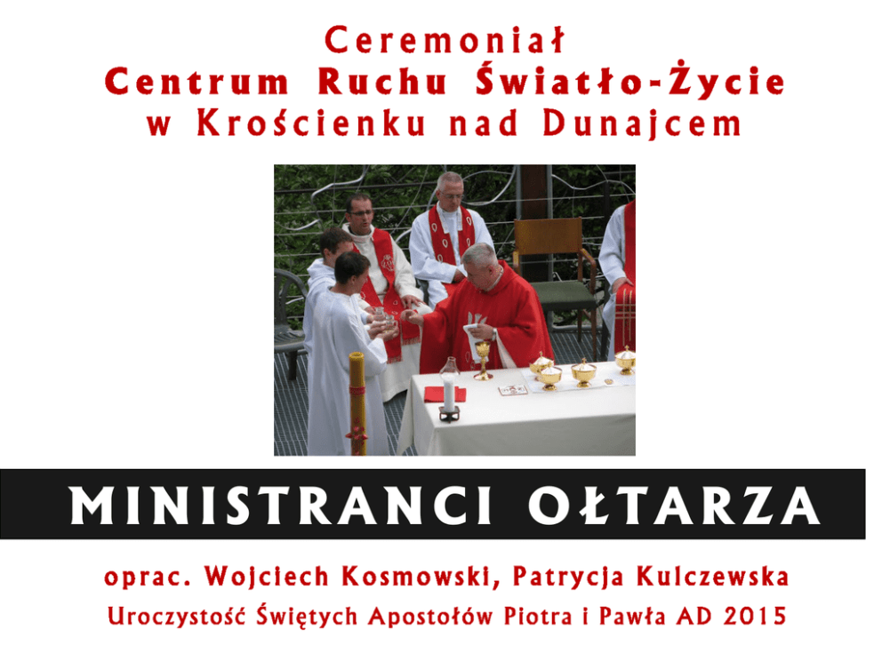 Wskazówki praktyczne MINISTRANCI OŁTARZA OGÓLNE ZASADY Każdy posługujący w liturgii: • pamięta, że uczestniczy w misterium i ma innych do niego prowadzić • przygotowuje się do swoich zadań poprzez modlitwę, refleksję nad swoimi czynnościami, udział w próbie służby liturgicznej • wszystko przygotowuje przed celebracją i po niej zanosi wszystko do zakrystii (lub zostawia na swoich miejscach w prezbiterium) Współpracuje z ... ceremoniarzem, który podaje szczegółowe wskazówki dotyczące sposobu wypełniania funkcji zakrystianem, który przedmioty liturgiczne przygotowuje niezbędne diakonem i akolitą – uzgadniając z nimi sposób wykonania swojej funkcji osobami niosącymi dary - pomaga im zanieść na stolik z darami odpowiednie przedmioty (pateny, ampułki) DO PRZYGOTOWANIA kielich (z puryfikaterzem, palką, korporałem i welonem) lawaterz, ręczniczek pateny świeca i welon na stoliku z darami: • puszki z komunikantami • patena z hostiami dla kapłanów • ampułki z winem i wodą • inne dary (w razie potrzeby nalezy przygotować dla tych darów odpowiednie miejsce np. wazon na kwiaty, stolik przed ołtarzem na inne dary materialne) POSŁUGA W CZASIE LITURGII Tak jak w każdej Mszy św.: • zanoszą kielich (z puryfikaterzem, palką i korporałem) po zakończeniu modlitwy wiernych, a nie w jej trakcie (wtedy bowiem zaczyna się przygotowanie darów) • rozkładają na ołtarzu korporały i kładą kielich, palkę i puryfikaterz - jak na fotografiach (może to czynić diakon) POSŁUGA W CZASIE LITURGII • pomagają odebrać dary współpracując z diakonami (jeśli są) i z ceremoniarzem • dary kładą w odpowiednim miejscu • podają wino i wodę • przed posługą lavabo jest okadzenie ołtarza i C • Komunię św. przyjmują wraz z innymi posługującymi w prezbiterium, ustawiając się na początku procesji komunijnej • jeśli mają pateny pierwsi przyjmują Komunię, a następnie posługują stojąc po prawej stronie celebransa (inna możliwość: Komunia pod dwiema postaciami przez zanurzenie – w środku kapłan trzyma kielich z Krwią Pańską, po bokach kapłani rozdzielający Ciało Pańskie, a po zewnętrznej stronie posługujący do paten) POSŁUGA W CZASIE LITURGII POSŁUGA W CZASIE LITURGII • puryfikacja zasadniczo następuje na kredensie – dokonuje jej diakon, akolita albo kapłan, ministranci ołtarza przenoszą korporał i palkę na kredens, wyświęceni szafarze niosą naczynia liturgiczne • po ucałowaniu ołtarza przez GC ustawia się wraz z innymi posługującymi przed ołtarzem. Następnie po właściwym oddaniu czci (albo ołtarzowi – Wieczernik, albo Najświętszemu Sakramentowi – kaplica) wychodzą do zakrystii wraz z innymi posługującymi w sposób procesjonalny USTAWIENIE W PROCESJACH I ZAJMOWANIE MIEJSC PRZEZ POSŁUGUJĄCYCH STOSOWANE SKRÓTY: GC – główny celebrans MŚ – ministrant światła Kns – koncelebrans OŁ – ministrant ołtarza C – ceremoniarz L 1, 2 – lektor (1 i 2 czytanie) K (lub +) – ministrant krzyża MW – modlitwa wiernych T – turyferariusz Kom – komentator N – nawikulariusz Ps – psałterzysta MK – ministrant księgi MM i MP – ministranci mitry i pastorału … – miejsca do wykorzystania przez innych posługujących MIEJSCA W PROCESJACH GDY CELEBRACJI PRZEWODNICZY BISKUP: * procesja wyjścia ma ten sam porządek, z tym, że T i N nie niosą kadzidła, idą więc za krzyżem i za MŚ ** drugi Dk (jeśli jest) idzie przy Bp ZAJMOWANIE MIEJSC PRZEZ POSŁUGUJĄCYCH Na kolejnych stronach znajdują się schematy zajmowania miejsc przez poszczególnych posługujących. Mają one charakter orientacyjny – w zależności od liczby wiernych oraz liczby koncelebransów miejsca te mogą się zmieniać. Należy jednak zachować ogólną zasadę, by posługujący siedzieli w pobliżu miejsca spełniania swoich funkcji. Na wszystkich schematach zaznaczono miejsca dla MM i MP – dotyczą one celebracji, którym przewodniczy biskup. ZAJMOWANIE MIEJSC PRZEZ POSŁUGUJĄCYCH KAPLICA CHRYSTUSA SŁUGI ZAJMOWANIE MIEJSC PRZEZ POSŁUGUJĄCYCH NAMIOT ŚWIATŁA ZAJMOWANIE MIEJSC PRZEZ POSŁUGUJĄCYCH WIECZERNIK ŚW. JANA PAWŁA II ZAJMOWANIE MIEJSC PRZEZ POSŁUGUJĄCYCH KOŚCIÓŁ PARAFIALNY "DOLNY" MODLITWY PRZED POSŁUGĄ I PO NIEJ DO INDYWIDUALNEGO ODMAWIANIA (W STOSOWNYM MIEJSCU I CZASIE) Przyjdź, Duchu Święty! Udziel mi łaski godnego posługiwania przy świętym ołtarzu, a wszystkim zgromadzonym udziel daru ofiarnej miłości. Naucz nas siebie samych składać w ofierze za braci. Dzięki Ci, Duchu Święty, za powołanie mnie do posługiwania przy świętym ołtarzu. Spraw, abym umiał służyć braciom we wszystkich ich potrzebach. MODLITWY DLA WSZYSTKICH POSŁUGUJĄCYCH PRZED LITURGIĄ I PO NIEJ DLA POSŁUGUJĄCYCH W PREZBITERIUM PROWADZI CELEBRANS W ZAKRYSTII Oto za chwilę przystąpię do ołtarza Bożego, do Boga, który rozwesela młodość moją; do świętej przystępuję służby, chcę ją dobrze pełnić. Proszę Cię, Panie Jezu, o łaskę skupienia, by myśli moje były przy Tobie, by oczy moje były zwrócone na ołtarz, a serce moje oddane tylko Tobie. Amen. Boże, którego dobroć powołała mnie do Twojej służby, spraw, bym uświęcony uczestnictwem w Twych tajemnicach, przez dzień dzisiejszy i całe me życie szedł tylko drogą zbawienia, przez Chrystusa, Pana naszego. Amen. ŹRÓDŁA • Dokumenty Kościoła: www.kkbids.episkopat.pl • Ogólne Wprowadzenie do Mszału Rzymskiego oraz Wskazania Episkopatu Polski po wprowadzeniu nowego OWMR • Ceremoniał Posług Liturgicznych • Katechizm Służby Liturgicznej