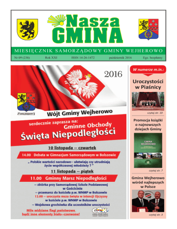 MIESIĘCZNIK SAMORZĄDOWY GMINY WEJHEROWO Nr 09 (238) Rok XXI ISSN 14-26-1472 październik 2016 Egz. bezpłatny W numerze m.in.: Uroczystości w Piaśnicy czytaj str. 10 Promocja książki o najnowszych dziejach Gminy czytaj str. 7 Gmina Wejherowo wśród najlepszych w Polsce czytaj str. 3 NASZA GMINA Galeria Jubilatów Aniela Szreder, Orle, 94 lata Janina Wykowska, Bolszewo, 92 lata Maria Wiśniewska, Bolszewo, 92 lata Wanda Piernicka, Bolszewo, 90 lat Zofia Tetzlaff, Orle, 102 lata Zakończyliśmy cykl jesiennych zebrań sołeckich! Dwa sołectwa zdecydowały o wyborze sołtysa C ykl jesiennych zebrań sołeckich zakończył się z nadejściem października. Z Wójtem Henrykiem Skwarło, Zastępcą Wójta Maciejem Milewskim i Sekretarzem Gminy Ryszardem Stachurskim spotkali się mieszkańcy wszystkich sołectw Gminy Wejherowo. W trakcie ich trwania przedstawiciele Gminy poznali bieżące potrzeby sołectw. Sami mieszkańcy zdecydowali natomiast o podziale środków z funduszu sołeckiego oraz innych kwestiach dotyczących funkcjonowania wsi. Dodatkowo, w dwóch miejscowościach zebrani zdecydowali o wyborze sołtysa. 19 września 2016 r. w wyniku wyborów przeprowadzonych w ramach zebrania sołeckiego, sołtysem Nowego Dworu Wejherowskiego ponownie została p. Bożena Holka. Wszelkie pytania do sołtysa kierować można pod nr tel.: (58) 672 84 22. Miesiąc później, 19 października zgodnie z decyzją mieszkańców nowym sołtysem Bieszkowic został p. Marek Nadolski. Pytania do nowego sołtysa kierować można pod nr tel.: 608 446 236. Gratulujemy! 2 | Miesięcznik Samorządowy Gminy Wejherowo MarekNadolski Bożena Holka nr 08 (237) Darmowe zajęcia rozwijające dla uczniów, energooszczędne lampy i dwa Gryfy Kaszubskie, czyli relacja z XXIII Sesji Rady Gminy Wejherowo 12 października odbyła się kolejna Sesja Rady Gminy Wejherowo. XXIII obrady zorganizowano w nowej sali konferencyjnej mieszczącej się w budynku Urzędu przy ul. Transportowej 1 w Wejherowie. Czyli w tym samym miejscu, gdzie znajdują się Referaty Finansowy oraz Spraw Obywatelskich, a docelowo przeniesione zostać mają też pozostałe. W przestronnej Sali, tuż po dokonanym przez Wójta sprawozdaniu z działalności międzysesyjnej radni przystąpili do podjęcia uchwał. Wśród przyjętych znalazły się uchwały dotyczące przystąpienia do sporządzenia zmiany miejscowego planu zagospodarowania przestrzennego dla fragmentu Gościcina „Przy granicy”; dwie uchwały dot. wyrażenia zgody na zawarcie umów dzierżawy na okres powyżej 3 lat; rozpatrzenie wezwania do usunięcia naruszenia prawa oraz nieodpłatnego nabycia nieruchomości położonej we wsi Gowino i oddania nieruchomości gminnej w bezpłatne użytkowanie. Tego dnia podjęto także uchwałę dot. statusów sołeckich. Osiem lat stosowania dotychczasowo obowiązujących statutów sołectw sprawiło, że pojawiły się wątpliwości interpretacyjne i związana z tym konieczność zmian zapisów dotyczących: czasu trwania kadencji sołtysa i rady sołeckiej, uprawnionych do głosowania na zebraniach wiejskich, prawa wybierania sołtysa oraz terminu odbycia kolejnego zebrania wiejskiego w przypadku nieuzyskania quorum w pierwszym terminie. Urealniono także zapis dotyczący liczby mieszkańców sołectwa niezbędnych do złożenia wniosku o odwołanie sołtysa. Zdecydowano także zmianie budżetu na rok 2016 i co ważniejsze – zawarciu umowy partnerskiej na rzecz wspólnej realizacji projektu pn.: „Ograniczenie niskiej emisji na terenie Gminy Wejherowo i Gminy Choczewo poprzez modernizację oświetlenia przestrzeni publicznej” w ramach Regionalnego Programu Operacyjnego Województwa Pomorskiego na lata 2014 – 2020. Planowany w ramach partnerstwa projekt będzie ubiegał się o dotacje w ramach ogłoszonego naboru wniosków do działania 10.4 Redukcja emisji. W ramach zaplanowanego projektu poszczególne gminy otrzymają wsparcie finansowe na modernizację oświetlenia zewnętrznego i jego wymiany na energooszczędne. Radni przyjęli też projekt uchwały dot. przystąpienia do realizacji innego równie istotnego projektu. „Nowe horyzonty - zachęcenie dzieci z terenu Wiejskiej Gminy Wejherowo do rozpoczęcia studiów technicznych” to projekt o wartości blisko 2,5 mln zł realizowany dzięki pozyskanym środkom unijnym. Beneficjentami są uczniowie szkół podstawowych i gimnazjum. Jego celem jest rozwijanie wśród uczniów kompetencji kluczowych niezbędnych na rynku pracy, a w przyszłości do podjęcia studiów technicznych. W projekcie łącznie weźmie udział 1264 uczniów, którzy w roku szkolnym 2016/2017 oraz 2017/2018 będą uczestniczyli w dodatkowych zajęciach m.in. językowych, przyrodniczych, informatycznych, chemicznych, fizycznych czy choćby zajęciach z robotyki. Ważne jest, że obok zajęć rozwijających oferta obejmuje także zajęcia wyrównujące oraz skierowane do dzieci ze szczególnymi potrzebami. Także nauczyciele biorący udział w projekcie objęci zostaną szeregiem szkoleń doskonalących ich umiejętności. Warto także nadmienić, że w ramach projektu zakupione zostaną pomoce dydaktyczne, narzędzia i sprzęt do prowadzenia w/w zajęć. Miło nam poinformować, że podczas Sesji radni podjęli decyzję o przyznaniu najwyższego wyróżnienia gminnego – Statuetki Gryfa Kaszubskiego – aż dwóm mieszkańcom Gminy. Do grona wyróżnionych dołączą ks. kan. Jerzy Osowicki oraz pan Jerzy Groth. Ks. Jerzy Osowicki jest proboszczem parafii pw. św. Mateusza Apostoła w Górze od 1988 roku. Od samego początku starał się o zachowanie dziedzictwa kulturalnego i sakralnego naszej Gminy. Do najważniejszych dokonań należą z pewnością: wpis kościoła parafialnego do rejestru zabytków Województwa Pomorskiego i zdobycie środków na prace konserwacyjno – remontowe. Pan Jerzy Groth jest natomiast znany głownie dzięki swoim zasługom dla OSP, w której służy od ponad pięćdziesięciu lat. 