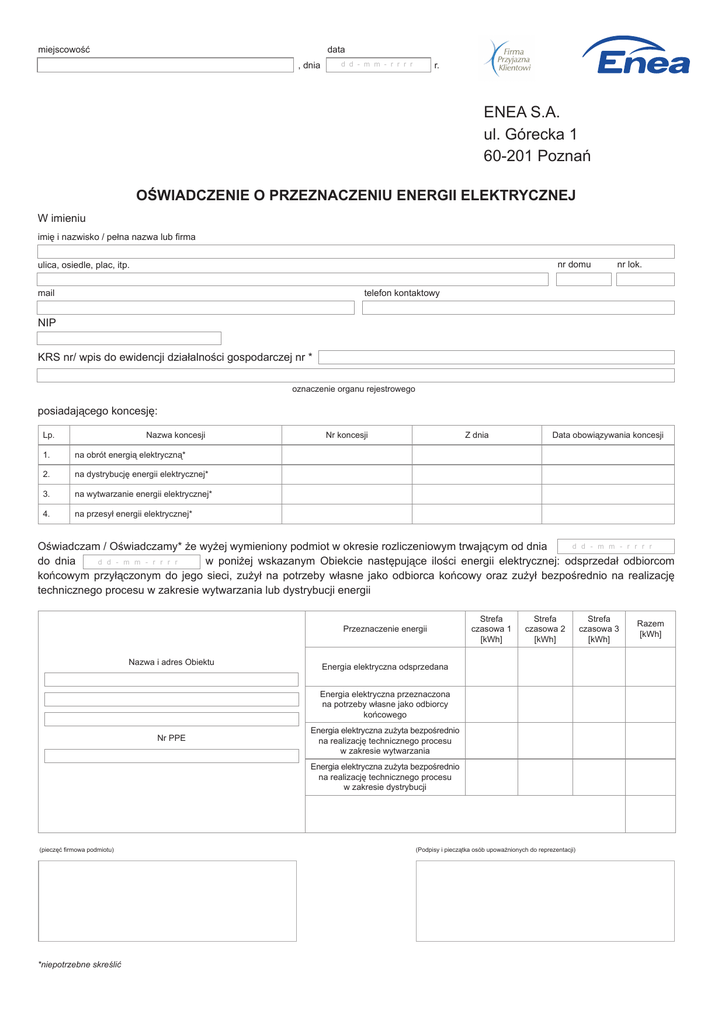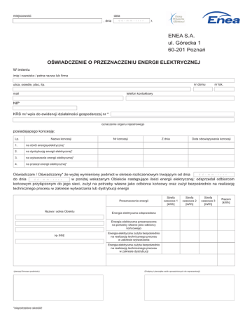 miejscowość miejscowość data data , dnia d d - m m - r r r r r. d d - m m - r r r r , dnia r. ENEA S.A. ul. Górecka 1 60-201 Poznań OŚWIADCZENIE O PRZEZNACZENIU ENERGII ELEKTRYCZNEJ W imieniu imię i nazwisko / pełna nazwa lub rma nr domu ulica, osiedle, plac, itp. mail nr lok. telefon kontaktowy NIP KRS nr/ wpis do ewidencji działalności gospodarczej nr * oznaczenie organu rejestrowego posiadającego koncesję: Lp. Nazwa koncesji 1. na obrót energią elektryczną* 2. na dystrybucję energii elektrycznej* 3. na wytwarzanie energii elektrycznej* 4. na przesył energii elektrycznej* Nr koncesji Z dnia Data obowiązywania koncesji d d - m m - r r r r Oświadczam / Oświadczamy* że wyżej wymieniony podmiot w okresie rozliczeniowym trwającym od dnia d d - m m - r r r r do dnia w poniżej wskazanym Obiekcie następujące ilości energii elektrycznej: odsprzedał odbiorcom końcowym przyłączonym do jego sieci, zużył na potrzeby własne jako odbiorca końcowy oraz zużył bezpośrednio na realizację technicznego procesu w zakresie wytwarzania lub dystrybucji energii Przeznaczenie energii Nazwa i adres Obiektu Strefa czasowa 1 [kWh] Strefa czasowa 2 [kWh] Energia elektryczna odsprzedana Energia elektryczna przeznaczona na potrzeby własne jako odbiorcy końcowego Nr PPE Energia elektryczna zużyta bezpośrednio na realizację technicznego procesu w zakresie wytwarzania Energia elektryczna zużyta bezpośrednio na realizację technicznego procesu w zakresie dystrybucji (pieczęć rmowa podmiotu) *niepotrzebne skreślić (Podpisy i pieczątka osób upoważnionych do reprezentacji) Strefa czasowa 3 [kWh] Razem [kWh]