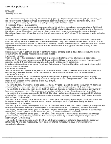Jaworznicki Serwis Informacyjny Kronika policyjna Autor: (ipra) 09.09.2008. Zmieniony 09.09.2008. Jak w każdy wtorek prezentujemy spis interwencji jakie podejmowała jaworznicka policja. Niestety, po raz kolejny wiele miejsca zajmują zatrzymania pijanych kierowców zarówno samochodów, jak i rowerów.Tylko między 3, a 8 września policja zatrzymała 8 takich osób! 8 września – poniedziałek Jaworznicka policja została powiadomiona o pobiciu 50-letniego mieszkańca naszego miasta. Policjanci ustalili, że pokrzywdzony 1 września około godz. 21:00 został zaatakowany na jednej z ulic w Dąbrowie Narodowej przez 22-letniego mężczyznę i jego brata. Mężczyzna przebywa na leczeniu w Szpitalu Miejskim w Jaworznie. W wyniku pobicia doznał poważnych obrażeń głowy. W tej sprawie trwają policyjne czynności. W środku nocy policjanci sekcji prewencji na ul. Cegielnianej zatrzymali dwóch 19-latków, którzy kilka minut wcześniej skradli kołpaki oraz oderwali emblemat z logo samochodu marki Seat Cordoba. W toku czynności stróże prawa ustalili, iż zatrzymani sprawcy skradli również kołpaki i emblematy z kilku innych zaparkowanych samochodów. Mężczyźni zostali umieszczeni w policyjnym areszcie. Straty w toku ustalania. 7 września - niedziela Nieznany sprawca w jednym z lokali w centrum miasta skradł plecak z dowodem osobistym i innymi dokumentami na szkodę mieszkańca naszego miasta. 6 września - sobota Około godz. 20:40 w Szczakowej patrol policji podczas udzielania asysty dla kuratora sądowego, zatrzymał 31-letniego mężczyznę oraz 21-letnią kobietę, którzy w stanie nietrzeźwym (mężczyzna 2,5 promila, matka 0,5 promila) sprawowali opiekę nad 4-miesięcznym dzieckiem. Dziecko zostało umieszczone przez Pogotowie Ratunkowe w Szpitalu Miejskim, natomiast nierozsądni rodzice trafili do aresztu. 4 września - czwartek Wieczorem nieznany sprawca na jednym z parkingów w Os. Stałym, dokonał włamania do samochodu dostawczego Renault Master i skradł akumulator . Straty właściciel oszacował na około 2000 zł. 2 września - wtorek Kilka dni wcześniej na ul. Grunwaldzkiej nieznany sprawca w przejściu podziemnym pobił idącego nietrzeźwego 36-letniego mężczyznę. Sprawca następnie skradł pokrzywdzonemu telefon komórkowy marki Sony Ericsson K800 wartości około 300 złotych. Nietrzeźwi kierowcy: - w poniedziałek, 8 września, około godz. 11:00 ul. Wygoda - patrol drogówki zatrzymał 49-letniego mieszkańca Jaworzna, który jechał na rowerze będąc w stanie nietrzeźwym (2, 3 promila); - w niedziele, 7 września, około godz. 1:30 ul. Ludowa – patrol ruchu drogowego zatrzymał 37letniego mężczyznę, który kierując rowerem znajdował się w stanie nietrzeźwym (1,4 promila); - w sobotę, 6 września, około godz. 22:35 ul. Darwina - patrol policji drogowej zatrzymał 32-letniego mieszkańca Mysłowic, który kierował samochodem osobowym marki Volkswagen Golf, będąc w stanie nietrzeźwym (2,6 promila); - w sobotę, 6 września, kilka minut po godz. 22:00 na ul. Paderewskiego - patrol policji zatrzymał 68letniego mężczyznę, który kierował samochodem osobowym marki Opel Astra będąc w stanie nietrzeźwym (2,5 promila); - w sobotę, 6 września, około godz. 2:00 na ul. Grunwaldzkiej - policjanci sekcji prewencji zatrzymali 42letniego mieszkańca Jaworzna, który będąc w stanie nietrzeźwym (1,5 promila) kierował rowerem; - w piątek, 5 września, około godz. 4:50 na ul. Wojska Polskiego - patrol policji zatrzymał 39-letniego mężczyznę, który będąc w stanie nietrzeźwym (1, 6 promila) kierował rowerem; - w piątek, 5 września, około godz. 1:40 na ul. Armii Krajowej - patrol policji zatrzymał 26-letniego jaworznianina, który kierując samochodem osobowym marki Opel Vectra znajdował się w stanie nietrzeźwym (1,0 promil); - w środę, 3 września, około godz. 14:15 na ul. Dąbrowszczaków policjanci jaworznickiej drogówki zatrzymali 71-letniego mężczyznę, który będąc w stanie nietrzeźwym (2,8 promila) kierował samochodem Polonez. http://old.jaworznianin.pl Kreator PDF Utworzono 7 March, 2017, 00:02