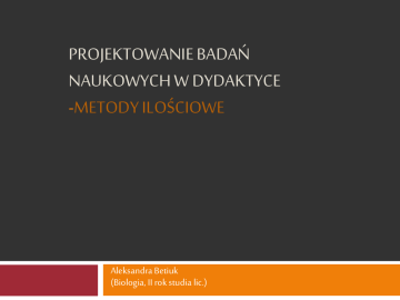 PROJEKTOWANIE BADAŃ NAUKOWYCH W DYDAKTYCE -METODY ILOŚCIOWE Aleksandra Betiuk (Biologia, II rok studia lic.) Podstawowe pojęcia Pedagogika Dydaktyka Metodologia Metoda badań Podział metod badań naukowych Metody ilościowe eksperyment pedagogiczny monografia pedagogiczna metoda indywidualnych przypadków metoda sondażu diagnostycznego Metody jakościowe wywiad pogłębiony metoda biograficzna jakościowa analiza tekstu obserwacja Etapy badania pedagogicznego 1. Sytuacja problemowa 6. Empiryczne weryfikowania hipotezy 7. Sprawdzenie słuszności rozwiązań 2. Formułowanie problemu 5.Przygotowania weryfikacji hipotezy roboczej 8. Wnioskowanie końcowe 3. Formułowanie hipotezy roboczej 4. Przewidywania skutków Eksperyment naukowy 1.Wybór zbiorowości 2.Wprowadzenie zmiennej niezależna 3.Przewidywane zmiany 4. Wzrost efektywności pracy Technika: jednej grupy grup równoległych rotacji Monografia pedagogiczna Instytucja wychowawcza Ulepszenia i prognozy rozwojowe Diagnoza Rozpoznanie struktury Efektywność działań Techniki: Obserwacja Wywiady Ankieta Analiza dokumentów Metoda sondażu diagnostycznego „Tym czym dla studium indywidualnych przypadków są losy jednostek ludzkich, tym dla sondażu diagnostycznego jest określone zjawisko.” A. Kamiński Jak również: stan świadomości społecznej, opinie i poglądy, dynamika zjawisk Techniki: Wywiad Ankieta Analiza dokumentów Grupa reprezentacyjna!!! Metoda indywidualnych przypadków Biografia ludzka Diagnoza przypadku Wg. Marry Richmond, Tadeusza Pilcha Działania terapeutyczne Podsumowanie Żadna metoda nie występuje w stanie czystym ( konieczność mieszania) Literatura 1. Creswell J., Projektowanie badań naukowych. Metody jakościowe ilościowe i mieszane, Wyd. UJ 2009, s. 161-188 2. Pilch T., Zasady badań pedagogicznych, Wrocław- Warszawa-Kraków- Gdańsk 1977, s. 117-180 3. Rubacha K., Metodologia badań nad edukacją, Warszawa 2008