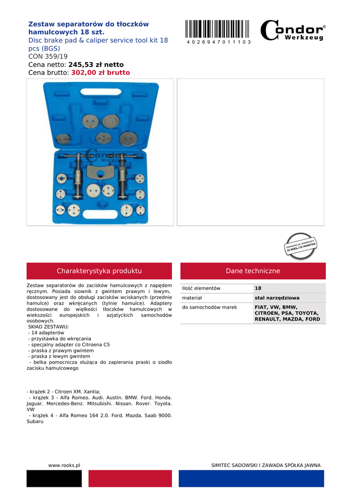 Zestaw separatorów do tłoczków hamulcowych 18 szt. Disc brake pad & caliper service tool kit 18 pcs (BGS) CON 359/19 Cena netto: 245,53 zł netto Cena brutto: 302,00 zł brutto 4 0 2 6 9 4 7 0 1 1 1 0 3 Charakterystyka produktu Zestaw separatorów do zacisków hamulcowych z napędem ręcznym. Posiada siownik z gwintem prawym i lewym, dostosowany jest do obsługi zacisków wciskanych (przednie hamulce) oraz wkręcanych (tylnie hamulce). Adaptery dostosowane do więlkości tłoczków hamulcowych w wiekszości europejskich i azjatyckich samochodów osobowych. SKłAD ZESTAWU: - 14 adapterów - przystawka do wkręcania - specjalny adapter co Citroena C5 - praska z prawym gwintem - praska z lewym gwintem - belka pomocnicza służąca do zapierania praski o siodło zacisku hamulcowego Dane techniczne Ilość elementów 18 materiał stal narzędziowa do samochodów marek FIAT, VW, BMW, CITROEN, PSA, TOYOTA, RENAULT, MAZDA, FORD - krążek 2 - Citroen XM. Xantia; - krążek 3 - Alfa Romeo. Audi. Austin. BMW. Ford. Honda. Jaguar. Mercedes-Benz. Mitsubishi. Nissan. Rover. Toyota. VW - krążek 4 - Alfa Romeo 164 2.0. Ford. Mazda. Saab 9000. Subaru www.rooks.pl SIMITEC SADOWSKI I ZAWADA SPÓŁKA JAWNA - krążek 5 - Adapter z wewnętrznym czworokątem 3/8 " - krążek 6 - Nissan Primera. VW golf IV; - krążek 7 - Audi 80. 90. V8 + 100. Ford Sierra ABS + Scorpio ab 85. Honda Prelude. www.rooks.pl SIMITEC SADOWSKI I ZAWADA SPÓŁKA JAWNA