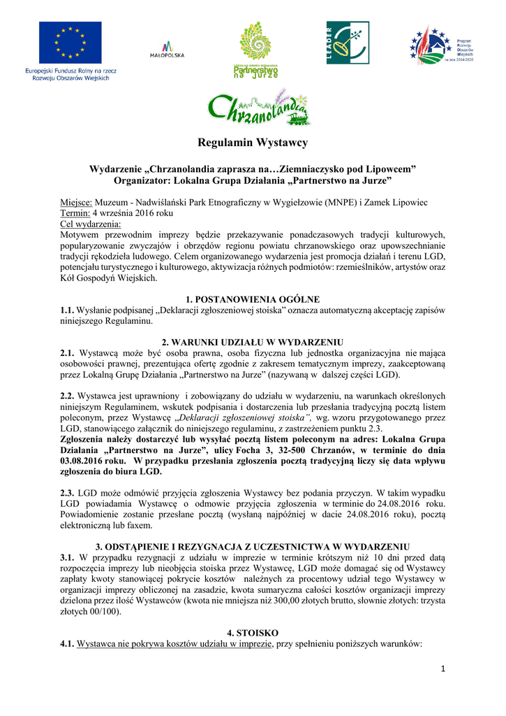 Regulamin Wystawcy Wydarzenie „Chrzanolandia zaprasza na…Ziemniaczysko pod Lipowcem” Organizator: Lokalna Grupa Działania „Partnerstwo na Jurze” Miejsce: Muzeum - Nadwiślański Park Etnograficzny w Wygiełzowie (MNPE) i Zamek Lipowiec Termin: 4 września 2016 roku Cel wydarzenia: Motywem przewodnim imprezy będzie przekazywanie ponadczasowych tradycji kulturowych, popularyzowanie zwyczajów i obrzędów regionu powiatu chrzanowskiego oraz upowszechnianie tradycji rękodzieła ludowego. Celem organizowanego wydarzenia jest promocja działań i terenu LGD, potencjału turystycznego i kulturowego, aktywizacja różnych podmiotów: rzemieślników, artystów oraz Kół Gospodyń Wiejskich. 1. POSTANOWIENIA OGÓLNE 1.1. Wysłanie podpisanej „Deklaracji zgłoszeniowej stoiska” oznacza automatyczną akceptację zapisów niniejszego Regulaminu. 2. WARUNKI UDZIAŁU W WYDARZENIU 2.1. Wystawcą może być osoba prawna, osoba fizyczna lub jednostka organizacyjna nie mająca osobowości prawnej, prezentująca ofertę zgodnie z zakresem tematycznym imprezy, zaakceptowaną przez Lokalną Grupę Działania „Partnerstwo na Jurze” (nazywaną w dalszej części LGD). 2.2. Wystawca jest uprawniony i zobowiązany do udziału w wydarzeniu, na warunkach określonych niniejszym Regulaminem, wskutek podpisania i dostarczenia lub przesłania tradycyjną pocztą listem poleconym, przez Wystawcę „Deklaracji zgłoszeniowej stoiska”, wg. wzoru przygotowanego przez LGD, stanowiącego załącznik do niniejszego regulaminu, z zastrzeżeniem punktu 2.3. Zgłoszenia należy dostarczyć lub wysyłać pocztą listem poleconym na adres: Lokalna Grupa Działania „Partnerstwo na Jurze”, ulicy Focha 3, 32-500 Chrzanów, w terminie do dnia 03.08.2016 roku. W przypadku przesłania zgłoszenia pocztą tradycyjną liczy się data wpływu zgłoszenia do biura LGD. 2.3. LGD może odmówić przyjęcia zgłoszenia Wystawcy bez podania przyczyn. W takim wypadku LGD powiadamia Wystawcę o odmowie przyjęcia zgłoszenia w terminie do 24.08.2016 roku. Powiadomienie zostanie przesłane pocztą (wysłaną najpóźniej w dacie 24.08.2016 roku), pocztą elektroniczną lub faxem. 3. ODSTĄPIENIE I REZYGNACJA Z UCZESTNICTWA W WYDARZENIU 3.1. W przypadku rezygnacji z udziału w imprezie w terminie krótszym niż 10 dni przed datą rozpoczęcia imprezy lub nieobjęcia stoiska przez Wystawcę, LGD może domagać się od Wystawcy zapłaty kwoty stanowiącej pokrycie kosztów należnych za procentowy udział tego Wystawcy w organizacji imprezy obliczonej na zasadzie, kwota sumaryczna całości kosztów organizacji imprezy dzielona przez ilość Wystawców (kwota nie mniejsza niż 300,00 złotych brutto, słownie złotych: trzysta złotych 00/100). 4. STOISKO 4.1. Wystawca nie pokrywa kosztów udziału w imprezie, przy spełnieniu poniższych warunków: 1 Wystawca jest zobowiązany do zapewnienia sobie wyposażenia stoiska: namiot/zadaszenie, stół, krzesła – namioty oraz wyposażenie nie mogą mieć oznaczeń innych niż związanych z danym Wystawcą, Obowiązuje zakaz umieszczania na stoisku reklam niezwiązanych z danym Wystawcą. Reklamy Wystawcy nie mogą być większe niż 3 metry na 1 metr. Wystawca jest zobowiązany do zapewnienia wystroju stoiska w formie nawiązującej do wystawianego rzemiosła (eksponaty nawiązujące do charakteru sprzedawanych rzeczy), lub nawiązującej do wzornictwa ludowego, Wystawca jest zobowiązany do zapewnienia na stoisku, atrakcji w godzinach od 13.00 do 19.00 w formie: - bezpłatnej degustacji dla minimum 50 osób do wyboru: lokalna potrawa / ekologiczne wypieki/ produkty związane z wystawcą (w formularzu deklaracji należy zaznaczyć co będzie do degustacji oraz gramaturę porcji) lub - warsztatów tematycznych dla minimum 30 osób – o każdej pełnej godzinie 5 osób (opis, co uczestnik otrzyma, na ilu uczestników warsztatów wystawca zabezpieczy materiał) lub - innych atrakcji dla dzieci i dorosłych, wymagających interakcji z uczestnikami imprezy np. malowanie twarzy, pokazy sztuczek, zabawy – chodzenie na szczudłach, tatuaże, konkursy, loterie, itd. Atrakcja MUSI mieć związek z tematem stoiska lub tematem imprezy (tradycja, kultura, rękodzieło, ekologia). Atrakcje nie mogą się powtarzać, dlatego Wystawca, który jako kolejny przyśle formularz z podobną do już zgłoszonej atrakcji zostanie poproszony o dokonanie zmiany atrakcji i przesłanie propozycji nowej atrakcji w wyznaczonym przez LGD terminie – w przypadku braku aktualizacji atrakcji, Wystawca zostanie automatycznie skreślony z listy Wystawców bez odrębnego powiadamiania. 4.2. W przypadku braku atrakcji na stoisku, spełniających wymagania określone w pkt. 4.1 zgłoszenie Wystawcy do udziału w wydarzeniu nie zostanie przyjęte. 4.3. Wystawca ponosi pełną odpowiedzialność za działania własne, oraz za działania osób, którymi się posługuje przy uczestnictwie w imprezie, w tym za przestrzeganie przepisów LGD, p.poż. i BHP obowiązujących na terenie na terenie MNPE w Wygiełzowie. 4.4. LGD zastrzega sobie prawo zmiany przyznanej pierwotnie lokalizacji stoiska. 5. EKSPONATY 5.1. Eksponaty nie mogą być umieszczane w ciągach komunikacyjnych, a pokazy sprzętu nie mogą ograniczać, utrudniać lub uniemożliwiać bezpiecznego poruszania się uczestników i publiczności ani naruszać ich spokoju, jak również utrudniać działania czy zakłócać porządku innym Wystawcom. 6. SPEDYCJA 6.1. Wystawca ma możliwość wjechania na teren skansenu w dniu imprezy w celu rozładowania stoiska, z zastrzeżeniem, iż samochód musi opuścić teren na godzinę przed rozpoczęciem imprezy, lub musi zostać przestawiony na miejsce wskazane przez LGD. 6.2. Za przednią szybą samochodu należy umieścić „Etykietę wystawcy” przekazaną przez LGD. Samochody bez oznaczeń nie będą wpuszczane na teren skansenu. 6.3. Wystawca może wjechać samochodem na teren skansenu po zakończeniu impre