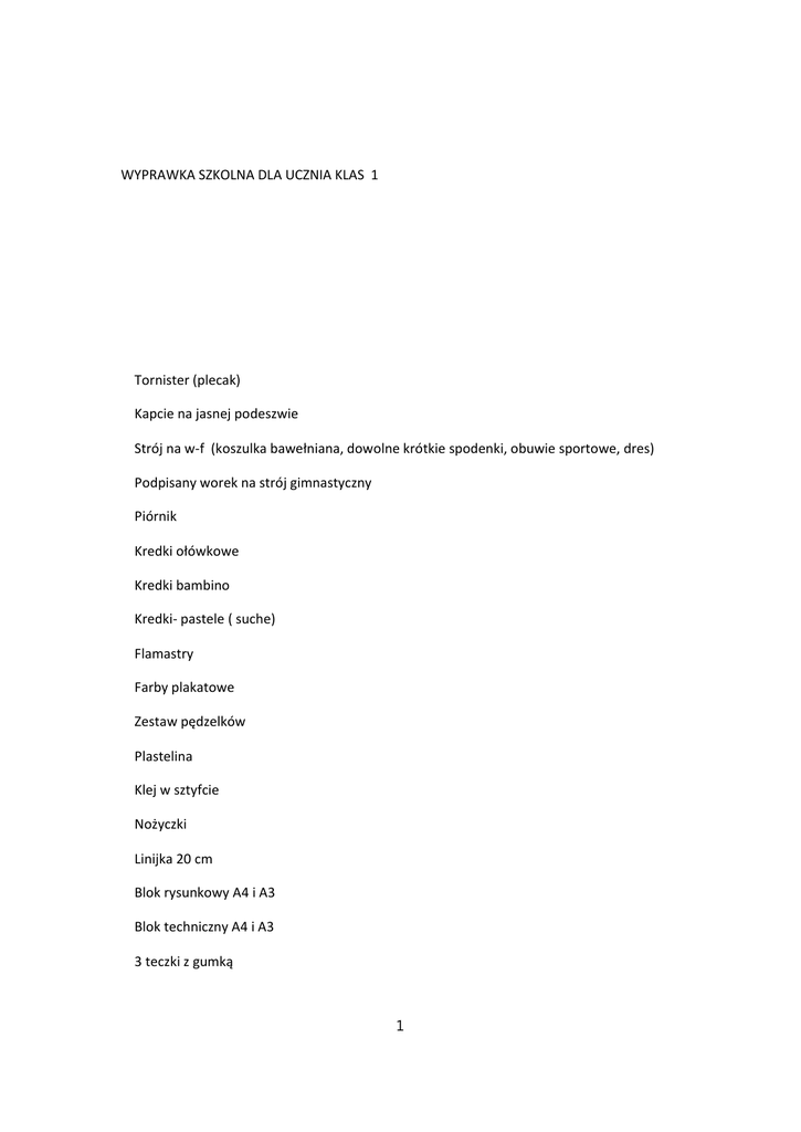 WYPRAWKA SZKOLNA DLA UCZNIA KLAS 1 Tornister (plecak) Kapcie na jasnej podeszwie Strój na w-f (koszulka bawełniana, dowolne krótkie spodenki, obuwie sportowe, dres) Podpisany worek na strój gimnastyczny Piórnik Kredki ołówkowe Kredki bambino Kredki- pastele ( suche) Flamastry Farby plakatowe Zestaw pędzelków Plastelina Klej w sztyfcie Nożyczki Linijka 20 cm Blok rysunkowy A4 i A3 Blok techniczny A4 i A3 3 teczki z gumką 1 Papier kolorowy 4 zeszyty 16- kartkowe w kratkę 4 zeszyty 16- kartkowe w trzy linię Dzienniczek ucznia- zeszyt 16- kart. w kratkę Zeszyt A-4 w kratkę 3 ołówki miękkie B ( do pisania) Gumka Temperówka 2