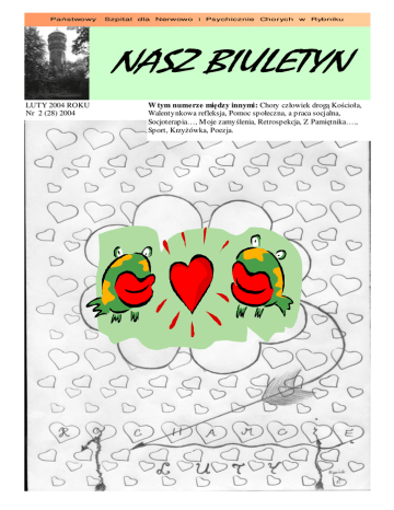 Państwowy Szpital dla Nerwowo i Psychicznie Chorych w Rybniku NASZ BIULETYN LUTY 2004 ROKU Nr 2 (28) 2004 W tym numerze między innymi: Chory człowiek drogą Kościoła, Walentynkowa refleksja, Pomoc społeczna, a praca socjalna, Socjoterapia…, M oje zamyślenia, Retrospekcja, Z Pamiętnika…., Sport, Krzyżówka, Poezja. S t r. 2 N AS Z BI UL E TYN Lu ty 20 0 4 r . N ajserdeczniejsze życzenia dla lutowych solenizantów z oddziału IX. Życzymy powrotu do zdrowia, spełnienia planów oraz wszelkiej pomyślności Panom: Jarosławowi S., Jerzemu Z., Bogusławowi J. Redakcja KALENDARIUM 02.02. - Dzień Handlowca. 11.02. - NM P z Lourdes. Dzień Chorego. 14.02. - Dzień Zakochanych, tzw. Walentynki. 25.02. - Popielec. W. W. Posłuchaj trochę Kiedy czas jest dla ciebie trudny Kiedy robi Ci się żal i jesteś smutny Pamiętaj, że złość, radość, smutek i śmiech Potrzebne są aby wziąć głęboki wdech. I od nowa śmiać się i radować A przed złością głęboko się chować. Może wzrus zać Cię będzie ludzkie bohat erstwo Jak kiedyś dawno temu dzielne rycerstwo, Nie miej siły obojętnie patrzeć na czyjś ból Jak dobry aktor nie odmawia dobrych ról. Pomóż każdemu kto Cię potrzebuje Bo życie rachunki wyrównuje. Śmiej się często, aby ludzie się śmiali Poważny bądź aby Cię nie wyśmiali Smutek odrzuć, radość dorzuć Wypal chciwość, kopnij zazdrość Śpiewaj głośno Tańcz wesoło Słuchaj uważnie, gdy chcesz wyglądać poważni e Miej nadzieję gdy słuchasz Kaznodzieje. Na miłość jedyną Na miłość wielką Wierz w sumienie swoje. Nie słuchaj głupoty, bo to nie twoje Autor nieznany Chory człowiek drogą Kościoła Jan Paweł II w swojej pierwszej encyklice Redemp tor hom inis napisał, że drogą Kościoła jest człowiek, każdy człowiek. Powołał się wtedy na Konstytucję duszpasterską o Kościele w świecie współczesnym Gaudium et spes. Najpierw zacytował, że człowiek, “ będąc słabym i grzesznym, nierzadko czyni to, czego nie chce, nie zaś to, co chciałby czynić. Stąd cierpi rozdarcie w samym sobie, z czego z kolei tyle i tak wielkich rozdźwięków rodzi się w społeczeństwie”, by następnie napisać: “T en człowiek jest drogą Kościoła – drogą, która prowadzi niejako u podstawy tych wszystkich dróg, jakimi Kościół kroczyć powinien, ponieważ człowiek – każdy bez wyjątku – został odkupiony przez Chrystusa, ponieważ z człowiekiem – każdym bez wyjątku – Chrystus jest w jakiś sposób zjednoczony, nawet gdyby człowiek nie zdawał sobie z tego sprawy”. Nieco dalej w tej encyklice Papież napisał: “ Jeśli bowiem człowiek jest drogą codziennego życia Kościoła, musi ten Kościół nieustannie być świadomy tej godności syna Bożego przybrania, jaką człowiek ma w Chrystusie od Ducha Świętego, jakie stało się jego udziałem poprzez wszystko, co składa się na jego życie na tej ziemi”. Ojciec św. w liście apostolski Salvifici doloris, dokładniej określił, że: “ W sposób szczególny człowiek staje się drogą Kościoła, wówczas, gdy w jego życie wchodzi cierpienie (...) Kościół, który wyrasta z tajemnicy Odkupienia w Krzyżu Chrystusa, winien w szczególny sposób szukać spotkania z człowiekiem na drodze jego cierpienia. W spotkaniu takim człowiek staje się <drogą Kościoła> - a jest to jedna z najważniejszych dróg”. Powierzmy tę trudną drogę naszego Kościoła opiece Maryi, obchodząc Światowy Dzień Chorego, w dniu patronki chorych Matki Bożej z Lourdes, 11 lutego. Duszpasterz POSŁUGA DUSZPASTERSKA W KOŚCIELE - KAPLICY Msza Święta: Niedzie le i święta : 9.00 i 10.30 W tygodniu: codzie nnie o 15.30 /oprócz czwartku/ Okazja do spowiedzi: 20 min przed każdą Mszą św. Serdecznie zapraszam! ks. Zygmunt Wiśniowski S t r. 3 N AS Z BIUL E TYN Lu t y 2 0 04 r. S t r. 3 Walentynkowa Refleksja WITAMY Witamy Panią Doktor na naszym oddziale, Chcemy, by na nas dobrym okiem patrzyła, Dobro w nas zawsze i wszędzie zobaczyła. Nie wstydzę się mówić i pisać o miłości, umiem przyznawać się do własnych uczuć i wzruszeń. Miłość cenię nade wszystko, gdyż Ona czyni nam z swych ramion puchową kołyskę i daje ukojenie. O Niej poeci śpiewają swą pieśń, starając się jakoś nazwać to uczuci e. A my czytamy, słuchamy, wzdychamy i tęsknimy z uśmiechem i marząco oczekując jej od świata. Wreszcie bywa, że zjawia się jasna i piękna niczym dotrzymana obietnica. Woła nas do siebie śpiewem syren, nęci i czaruje swym powabem kreśląc miraże szczęścia i wizje ideału, a uwielbienie dla drugiej osoby wyraża dźwiękiem zachwytu. Miłość idzie śladem uniesienia i emocji. Ta odmiana psychozy, w pozytywnym wydaniu, sprawia że otoczenie przybiera bajeczną aurę, wnosząc w nasze życie wiele tęczowych barw i dużo uśmiechów w szmerze harf. Dążenie do taki ego stanu i trwanie w nim wytycza cel i sens naszego życia, wyzwala potęgę sił i motywację naszych działań. Moc umysłu i serca jest niczym wulkan, którego nijak nie można okiełznać, z niebywałym uporem dąży do swych t ęsknot celu. Miłość jest też świetną nauczycielką psychologii, poruszającą czuł ą sferę myśli. Z doświadczeń cudzych i własnych wyniosłem tę naukę. A na dowód trafności mej oceny stawiam Twoje Czytelniku odczucia, który w tej chwili czytasz te słowa. Dlatego zdarza się, że mężczyzna w swoim życiu spotyka kogoś bliskiego – kobietę. Rodzi się między nimi przyjaźń i ludzka miłość. Bo tak człowiek został stworzony i takie prawo wpisał w ludzką naturę Bóg – “ Nie jest dobrze żeby mężczyzna był sam, uczynię dla niego odpowiednią pomoc”- Księga Rodz. 2-18. Moją miłość lubię wyrażać poprzez piękno poezji, gdyż ona bogaci mą duszę, uwrażliwia na piękno i czyni delikatniejszym, lepszym w postępowaniu z drugą osobą. Pomaga wzrastać we wzajemnej miłości i bezpieczniej pł