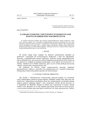Nr 117 Studia i Materiały Prace Naukowe Instytutu Górnictwa Politechniki Wrocławskiej Nr 117 Nr 32 2006 turystyka podziemna, obiekty techniczne, uatrakcyjnienie obiektów turystycznych Karol MARTIN* UATRAKCYJNIENIE I NIETYPOWE WYKORZYSTANIE DAWNYCH OBIEKTÓW POGÓRNICZYCH W artykule omówiono problem jaki stanowią niezagospodarowane obiekty pogórnicze. Duża część dawnych kopalń, jak i pozostałości niegdysiejszego przemysłu górniczego jest dziś ruiną stanowiącą zagrożenie lub niszczejącą w zapomnieniu. Przedstawiono pomysły, które mogą pomóc zmienić porastające chwastami ruiny w miejsca chętnie odwiedzane. Obiekty dawnej aktywności przemysłu górniczego, po odpowiedniej adaptacji i odrestaurowaniu ich w ciekawej formie mogą stać się dużą atrakcją turystyczną, czy też rozrywkową. 1. WSTĘP Na terenie całego kraju znajduje się mnóstwo podziemnych pamiątek po górnictwie i przemyśle mu towarzyszącym. Większość z nich stoi zapomniana, niszczeje, a niejednokrotnie stanowi zagrożenie. Nieliczne zostały zagospodarowane, lub są zabezpieczone, zazwyczaj źle, przed wtargnięciem postronnych osób. Dzieje się tak zapewne ze względu na panujące przekonanie, że nie opłaca się inwestować w te obiekty. Jednakże jest to błędne spojrzenie, gdyż są one swoistą atrakcją turystyczną i dobrze wykorzystane mogą przynosić zysk. Od niedawna na świecie rośnie zainteresowanie dawnymi obiektami przemysłowymi. Jednym z powodów jest popularyzacja tzw. turystyki technicznej. Istnieją także niekonwencjonalne sposoby ich wykorzystania. 2. UATRAKCYJNIENIE OBIEKTÓW Aby myśleć o alternatywnym wykorzystaniu dawnych kopalni czy naziemnej części infrastruktury górniczej trzeba najpierw dokładnie zbadać jakie dają nam one możliwości. Najprostszym przykładem może być uatrakcyjnienie zwiedzania danego miejsca poprzez adaptację legend z nim związanych. Każdy słyszał przecież, że w kopalniach żył Skarbnik, dlatego też dobrze jest wykorzystać tę postać. Można znaleźć wiele sposobów na to aby legenda tego ducha pracowała na naszą korzyść, a nowoczesna technika daje nam lepsze możliwości niż seans spirytystyczny. Dobrze * Politechnika Wrocławska, Instytut Górnictwa, 50-051 Wrocław, pl. Teatralny 2 212 zamaskowany głośnik, z którego co jakiś czas będzie dolatywał dźwięk kucia, czy sprytnie umieszczona lampka, lub żarówka symulująca błędne świetliki może wystarczyć. Możemy także pokusić się o zatrudnienie charyzmatycznej osoby, która grałaby rolę żywej legendy. Ostatnie rozwiązanie zastosowano w kopalni złota w Złotym Stoku, gdzie na turystów czai się sympatyczny gnom [6]. Inną kwestią jest odejście od prezentowania starych wyrobisk jako muzeum i zamiana ich w swoisty skansen. Oczywiście wymaga to większych nakładów, ale może przynieść nieporównywalnie większe zyski. Świetnym przykładem takiego muzeum jest Deutsche Bergbau-Museum w Bochum gdzie stworzono cały kompleks wyrobisk podziemnych z ustawionymi w nim maszynami i wyposażeniem jakie było stosowane na terenie Zagłębia Ruhry. Możemy tam zobaczyć nawet zautomatyzowaną ścianę węglową [4]. Dobrym przykładem takiej działalności może być także muzeum w Zlatych Horah, gdzie powstały rekonstrukcje napędzanych wodą kruszarek (tzw. stęp) [8]. Rekonstrukcje ożywiają maszyny jakie zamieścił na swoich rycinach Agricola. O ileż ciekawiej jest nie tylko usłyszeć od przewodnika, że takie urządzenie istniało, ale zobaczyć jak wyglądało i jak pracowało. W naszym kraju w tym kierunku zmierza kopalnia złota w Złotym Stoku. Na początku istniał tam tylko kompleks wyrobisk górniczych, a dziś możemy zobaczyć laboratorium alchemiczne, mennicę, a czasem spotkać jednego z Gwarków, którego opowieści o dawnej pracy górników będą na pewno ciekawsze niż napis na kartce w zwykłym muzeum [6]. Należy oczywiście wspomnieć o muzeum w Wieliczce, jednak ten obiekt sam z siebie wymusza odpowiednią ekspozycję zabytków techniki i cały czas prowadzone są tam starania aby go jeszcze bardziej uatrakcyjnić. Dobrym sposobem na zwiększenie zainteresowanie obiektem jest stworzenie dodatkowych atrakcji. Podziemne przejażdżki łódkami, oczywiście wymagające odpowiedniego zaplecza, stanowić będą zapewne ciekawy dodatek. Wspomniana już kopalnia w Złotym Stoku umożliwia turystom spróbowanie swoich sił w płukaniu złota [6]. Oczywiście najchętniej korzystają z tego dzieci, ale czy większość z nas nie miała ochoty spróbować jak to jest szukać bogactwa w piasku? Oczywiście nie ma sensu organizowanie stanowiska do płukania złota w kopalniach gdzie nigdy nie było ono wydobywane, zawsze jednak istnieje jakiś sposób na wykorzystanie istniejącego potencjału. Można chociażby zrekonstruować proste ręczne narzędzia i pozwolić na próbę „wydobycia” pamiątkowego kamyka, czy też umożliwić zwiedzenie odcinka kopalni przy świetle kaganków lub starych lampek górniczych. Powyżej omówiono kilka sposobów nietypowego uatrakcyjnienia dawnych kopalń, istnieje też jednak mnóstwo obiektów, niekoniecznie związanych z górnictwem, lub nie znajdujących się stricte pod ziemią. Za przykład posłużyć mogą chociażby wszelkie obiekty militarne pozostawione na terenie Polski takie jak sztolnie Walimskie, które były wykonywane za pomocą prac i techniki górniczej, a także wykorzystując kadrę górniczą [1, 2]. Mimo, że legendy otaczające armie Hitlera powinny wzbudzać zainteresowanie tymi obiektami, co prowadziłoby do 213 odpowiedniego ich wykorzystania i uchronienia przed zapomnieniem i zniszczeniem to tylko część z nich jest obecnie zagospodarowana. Wielu ludzi boi się zainwestować w rekonstrukcję historyczną takich miejsc ze względu na wspomnienia, jakie budzą i ogólne niezrozumienie społeczne. Istnieje mnóstwo sposobów na uatrakcyjnienie podobnych obiektó