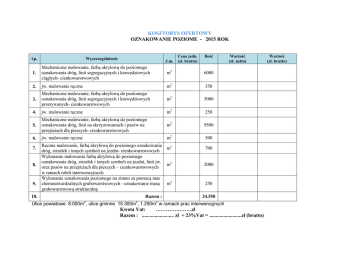 KOSZTORYS OFERTOWY OZNAKOWANIE POZIOME - 2015 ROK l.p. Wyszczególnienie J.m. Cena jedn. (zł. brutto) Ilość 1. Mechaniczne malowanie, farbą akrylową do poziomego oznakowania dróg, linii segregacyjnych i krawędziowych ciągłych- cienkowarstwowych m2 6000 2. jw. malowanie ręczne m2 350 3. Mechaniczne malowanie, farbą akrylową do poziomego oznakowania dróg, linii segregacyjnych i krawędziowych przerywanych- cienkowarstwowych m2 5000 4. jw. malowanie ręczne m2 250 5. Mechaniczne malowanie, farbą akrylową do poziomego oznakowania dróg, linii na skrzyżowaniach i pasów na przejściach dla pieszych- cienkowarstwowych m2 9500 6. jw. malowanie ręczne m2 500 Ręczne malowanie, farbą akrylową do poziomego oznakowania dróg, strzałek i innych symboli na jezdni- cienkowarstwowych Wykonanie malowania farbą akrylową do poziomego oznakowania dróg, strzałek i innych symboli na jezdni, linii jw. oraz pasów na przejściach dla pieszych – cienkowarstwowych w ramach robót interwencyjnych Wykonanie oznakowania poziomego na zimno za pomocą mas chemoutwardzalnych grubowarstwowych - oznakowanie masą grubowarstwową strukturalną m2 700 m2 2000 m2 250 7. 8. 9. 10. Razem : 2 2 Wartość (zł. netto) 24.550 2 Ulice powiatowe 8.000m , ulice gminne 15.300m , 1.250m w ramach prac interwencyjnych Kwota Vat: …………………zł Razem : ......................... zł + 23%Vat = .........................zł (brutto) Wartość (zł. brutto)