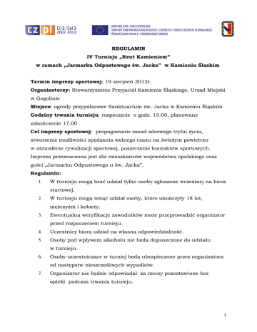 REGULAMIN IV Turnieju „Rzut Kamieniem” w ramach „Jarmarku Odpustowego św. Jacka” w Kamieniu Śląskim Termin imprezy sportowej: 19 sierpień 2012r. Organizatorzy: Stowarzyszenie Przyjaciół Kamienia Śląskiego, Urząd Miejski w Gogolinie Miejsce: ogrody przypałacowe Sanktuarium św. Jacka w Kamieniu Śląskim Godziny trwania turnieju: rozpoczęcie o godz. 15.00, planowane zakończenie 17.00 Cel imprezy sportowej: propagowanie zasad zdrowego trybu życia, stworzenie możliwości spędzania wolnego czasu na świeżym powietrzu w atmosferze rywalizacji sportowej, poszerzenie kontaktów sportowych. Impreza przeznaczona jest dla mieszkańców województwa opolskiego oraz gości „Jarmarku Odpustowego u św. Jacka”. Regulamin: 1. W turnieju mogą brać udział tylko osoby zgłoszone wcześniej na liście startowej. 2. W turnieju mogą wziąć udział osoby, które ukończyły 18 lat, mężczyźni i kobiety. 3. Ewentualną weryfikację zawodników może przeprowadzić organizator przed rozpoczęciem turnieju. 4. Uczestnicy biorą udział na własną odpowiedzialność. 5. Osoby pod wpływem alkoholu nie będą dopuszczone do udziału w turnieju. 6. Osoby uczestniczące w turniej będą ubezpieczone przez organizatora od następstw nieszczęśliwych wypadków. 7. Organizator nie będzie odpowiadał za rzeczy pozostawione bez opieki podczas trwania turnieju. 1 8. Organizator podczas trwania turnieju obejmuję funkcję sędziego technicznego oraz zastrzega sobie również wyłączną interpretację regulaminu. 9. Wszystkie sporne kwestie podczas rozgrywek rozstrzygają sędziowie prowadzący turniej. 10. Kamień przeznaczony do rzutu ma wagę 6,5 kg. 11. Rzut musi być wykonany jednorącz przodem do linii rzutu. 12. Przekroczenie linii rzutu nawet po rzucie jest „rzutem spalonym”, który nie będzie zaliczony. 13. Każdy z uczestników ma prawo do dwóch rzutów, z których lepszy jest klasyfikowany. 14. Podczas zawodów wszyscy uczestnicy turnieju przebywają za linią rzutu w odległości co najmniej 3 m. 15. Najlepszy wynik w poszczególnych kategoriach będzie jednocześnie rekordem widniejącym na stronie internetowej www.kamienslaski.pl do czasu jego pobicia. Termin przyjmowania zgłoszeń: reprezentacje sołectw do 16 sierpnia 2012r. zawodnicy indywidualni w dniu zawodów od godz. 14.00. Wszelkie informacje oraz zgłoszenia do udziału w turnieju przyjmowane są pod adresem [email protected], lub Zbigniew Kawa tel. 506 063 455, Tomasz Sochański tel. 502 598 635. ……………………………………………………………………….……………………. Projekt jest współfinansowany ze środków Europejskiego Funduszu Rozwoju Regionalnego oraz ze środków budżetu państwa. PRZEKRACZAMY GRANICE 2