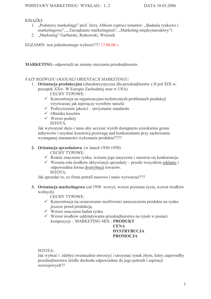 Podstawy Marketingu wykłady: 1,2 (18.03.06)