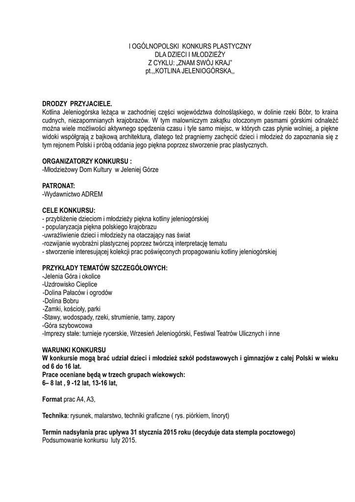 I OGÓLNOPOLSKI KONKURS PLASTYCZNY DLA DZIECI I MŁODZIEŻY Z CYKLU: „ZNAM SWÓJ KRAJ” pt.,,KOTLINA JELENIOGÓRSKA,, DRODZY PRZYJACIELE. Kotlina Jeleniogórska leżąca w zachodniej części województwa dolnośląskiego, w dolinie rzeki Bóbr, to kraina cudnych, niezapomnianych krajobrazów. W tym malowniczym zakątku otoczonym pasmami górskimi odnaleźć można wiele możliwości aktywnego spędzenia czasu i tyle samo miejsc, w których czas płynie wolniej, a piękne widoki współgrają z bajkową architekturą, dlatego też pragniemy zachęcić dzieci i młodzież do zapoznania się z tym rejonem Polski i próbą oddania jego piękna poprzez stworzenie prac plastycznych. ORGANIZATORZY KONKURSU : -Młodzieżowy Dom Kultury w Jeleniej Górze PATRONAT: -Wydawnictwo ADREM CELE KONKURSU: - przybliżenie dzieciom i młodzieży piękna kotliny jeleniogórskiej - popularyzacja piękna polskiego krajobrazu -uwrażliwienie dzieci i młodzieży na otaczający nas świat -rozwijanie wyobraźni plastycznej poprzez twórczą interpretację tematu - stworzenie interesującej kolekcji prac poświęconych propagowaniu kotliny jeleniogórskiej PRZYKŁADY TEMATÓW SZCZEGÓŁOWYCH: -Jelenia Góra i okolice -Uzdrowisko Cieplice -Dolina Pałaców i ogrodów -Dolina Bobru -Zamki, kościoły, parki -Stawy, wodospady, rzeki, strumienie, tamy, zapory -Góra szybowcowa -Imprezy stałe: turnieje rycerskie, Wrzesień Jeleniogórski, Festiwal Teatrów Ulicznych i inne WARUNKI KONKURSU W konkursie mogą brać udział dzieci i młodzież szkół podstawowych i gimnazjów z całej Polski w wieku od 6 do 16 lat. Prace oceniane będą w trzech grupach wiekowych: 6– 8 lat , 9 -12 lat, 13-16 lat, Format prac A4, A3, Technika: rysunek, malarstwo, techniki graficzne ( rys. piórkiem, linoryt) Termin nadsyłania prac upływa 31 stycznia 2015 roku (decyduje data stempla pocztowego) Podsumowanie konkursu luty 2015. Przewiduje się przyznanie nagród, wyróżnień i dyplomów. Każda praca powinna być opisana czytelnie, według wzoru, pismem drukowanym. NAZWISKO......................................................................................................................................... . IMIĘ...................................................................................................................................................... WIEK............. TYTUŁ PRACY ............................................................................................... .................................... ADRES : SZKOŁY / INSTYTUCJI ....................................................................................................... ULICA .................................................................................................................................................. MIASTO (KOD) ................................................................................................................................... IMIĘ I NAZWISKO NAUCZYCIELA .................................................................................................... E-MAIL: SZKOŁY/ INSTYTUCJI ........................................................................................................ - Każda praca może mieć tylko jednego autora – w konkursie nie mogą brać udziału prace zbiorowe. - Nadesłane na konkurs prace nie mogą być zrolowane. - Organizatorzy nie odpowiadają za zniszczenie prac podczas ich przewozu. - Prace można również przesyłać indywidualnie. - Nadesłanie prac na konkurs oznacza zapoznanie się z regulaminem i jest równoznaczne z wyrażeniem zgody na przetwarzanie danych osobowych - Nadesłane na konkurs prace nie będą zwracane ich autorom, pozostaną własnością organizatorów, którzy zastrzegają sobie możliwość ich publikowania. - Protokół konkursu zostanie umieszczony na stronie internetowej www.mdkjelonek.pl PRACE PROSIMY PRZESYŁAĆ NA ADRES : Młodzieżowy Dom Kultury ul. M. Skłodowskiej - Curie 12 58-500 Jelenia Góra tel. 75-64 24 460 , e-mail:[email protected] www.mdkjelonek.pl z dopiskiem “Kotlina jeleniogórska” Z A P R A S Z A M Y!