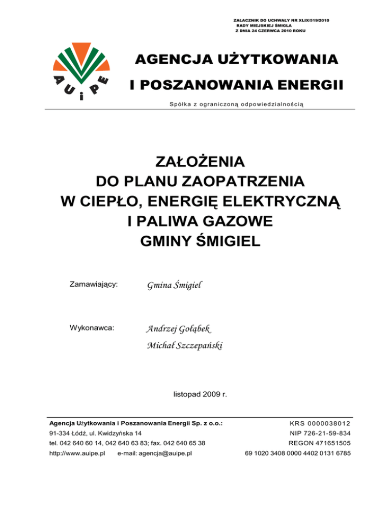 ZAŁACZNIK DO UCHWAŁY NR XLIX/519/2010 RADY MIEJSKIEJ ŚMIGLA Z DNIA 24 CZERWCA 2010 ROKU AGENCJA UśYTKOWANIA I POSZANOWANIA ENERGII Spółka z ogranic zoną od po wied zialnością ZAŁOśENIA DO PLANU ZAOPATRZENIA W CIEPŁO, ENERGIĘ ELEKTRYCZNĄ I PALIWA GAZOWE GMINY ŚMIGIEL Zamawiający: Gmina Śmigiel Wykonawca: Andrzej Gołąbek Michał Szczepański listopad 2009 r. Agencja UŜytkowania i Poszanowania Energii Sp. z o.o.: KR S 0000038012 91-334 Łódź, ul. Kwidzyńska 14 NIP 726-21-59-834 tel. 042 640 60 14, 042 640 63 83; fax. 042 640 65 38 REGON 471651505 http://www.auipe.pl e-mail: [email protected] 69 1020 3408 0000 4402 0131 6785 1 PODSTAWA OPRACOWANIA ................................................................................................... 4 1.1 1.2 2 PODSTAWA PRAWNA OPRACOWANIA ....................................................................4 PODSTAWA ŹRÓDŁOWA ...........................................................................................5 OGÓLNA CHARAKTERYSTYKA GMINY ŚMIGIEL................................................................. 5 2.1 OGÓLNE INFORMACJE O GMINIE...........................................................................5 2.1.1 POŁOśENIE.......................................................................................................... 5 2.1.2 FORMY UśYTKOWANIA TERENU.................................................................... 8 2.1.3 LUDNOSĆ I śYCIE GOSPODARCZE ................................................................ 8 2.2 ISTNIEJĄCE UTRUDNIENIA NA TERENIE GMINY MAJĄCE WPŁYW NA ROZWÓJ SYSTEMÓW ENERGETYCZNYCH...........................................................10 2.2.1 AKWENY I CIEKI WODNE................................................................................. 11 2.2.2 TRASY KOMUNIKACYJNE................................................................................ 11 2.2.3 RZEŹBA TERENU .............................................................................................. 12 2.2.4 OBSZARY LEŚNE ............................................................................................... 12 2.2.5 OBSZARY OBJĘTE OCHRONĄ......................................................................... 12 3 OCENA AKTUALNEGO ZAPOTRZEBOWANIA NA CIEPŁO, ENERGIĘ ELEKTRYCZNĄ I PALIWA GAZOWE .................................................................................... 13 3.1 3.2 3.3 4 PROGNOZA ZAPOTRZEBOWANIA NA NOŚNIKI ENERGETYCZNE DO 2030 R. ….……17 4.1 4.2 4.3 5 OGÓLNA CHARAKTERYSTYKA SYSTEMU CIEPŁOWNICZEGO ..........................13 OGÓLNA CHARAKTERYSTYKA SYSTEMU ELEKTRO ENERGETYCZNEGO................................................................................................14 OGÓLNA CHARAKTERYSTYKA SYSTEMU GAZOWNICZEGO ............................15 PROGNOZA ZAPOTRZEBOWANIA NA ENERGIĘ CIEPLNĄ ................................18 PROGNOZA ZAPOTRZEBOWANIA NA ENERGIĘ ELEKTRYCZNĄ ....................19 PROGNOZA ZAPOTRZEBOWANIA NA GAZ ZIEMNY ..........................................20 PRZEDSIĘWZIĘCIA RACJONALIZUJĄCE ZUśYCIE CIEPŁA, ENERGII ELEKTRYCZNEJ I PALIW GAZOWCH ................................................................................ 20 5.1 5.2 5.3 6 DZIAŁANIA TERMOMODERNIZACYJNE ...............................................................20 INWESTYCJE MODERNIZACYJNE ........................................................................21 ZWIĘKSZENIE SPRAWNOŚCI WYTWARZANIA I SPRAWNOŚCI PRZESYŁU................................................................................................................21 5.4 OSZCZĘDNE GOSPODAROWANIE ENERGIĄ ELEKTRYCZNĄ ..........................22 MOśLIWOŚĆ WYKORZYSTANIA ISTNIEJĄCYCH NADWYśEK ENERGII.................... 26 6.1 6.2 OGÓLNA CHARAKTERYSTYKA ŹRÓDEŁ ODNAWIALNYCH..............................26 DZIAŁANIA SPRZYJAJĄCE WZROSTOWI WYKORZYSTANIA ODNAWIALNYCH ŹRÓDEŁ ENERGII ..................................................................................................29 6.3 OCENA MOśLIWOSCI WYKORZYSTANIA ODNAWIALNYCH ŹRÓDEŁ ENERGII W GMINIE ŚMIGIEL ...............................................................................................31 6.3.1 ODPADÓW KOMUNALNYCH ........................................................................ 31 6.3.2 BIOMASY .......................................................................................................... 33 6.3.3 POMPY CIEPŁA............................................................................................... 35 ZałoŜenia do planu zaopatrzenia w ciepło, energię elektryczną i paliwa gazowe dla Gminy Śmigiel. 2 6.3.4 6.3.5 6.3.6 6.3.7 ENERGII WIATRU ............................................................................................ 36 ENERGIA GEOTERMALNA ............................................................................. 37 ENERGIA SŁONECZNA.................................................................................... 37 PODSUMOWANIE ............................................................................................ 37 7 ZAKRES WSPÓŁPRACY Z INNYMI GMINAMI .....................................................................38 8 WYKAZ ZAŁĄCZNIKÓW ....................................................................................................... 40 ZałoŜenia do planu zaopatrzenia w ciepło, energię elektryczną i paliwa gazowe dla Gminy Śmigiel. 3 1 PODSTAWA OPRACOWANIA Podstawę niniejszego opracowania stanowi Umowa nr WI.HS/6/09 zawarta w dniu 24.03.0009 r. pomiędzy Gminą Śmigiel a Agencją UŜytkowania i Poszanowania Energii Sp. z o.o. z siedzibą przy ul. Kwidzyńskiej 14, 91 334 Łódź 1.1 PODSTAWA PRAWNA OPRACOWANIA Podstawę prawną niniejszego opracowania stanowi Ustawa Prawo Energetyczne z dnia 10 kwietnia 1997 r. (Dz. U. z 2006 r. Nr 89, poz. 625, Nr 104 poz. 708 i Nr 158 poz. 1123 i Nr 170 poz. 1217 oraz z 2007 r. Nr