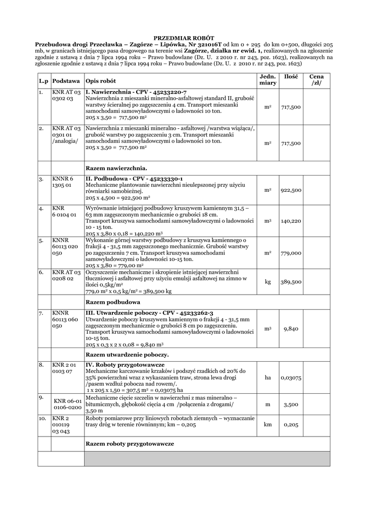 PRZEDMIAR ROBÓT Przebudowa drogi Przecławka – Zagórze – Lipówka, Nr 321016T od km 0 + 295 do km 0+500, długości 205 mb, w granicach istniejącego pasa drogowego na terenie wsi Zagórze, działka nr ewid. 1, realizowanych na zgłoszenie zgodnie z ustawą z dnia 7 lipca 1994 roku – Prawo budowlane (Dz. U. z 2010 r. nr 243, poz. 1623), realizowanych na zgłoszenie zgodnie z ustawą z dnia 7 lipca 1994 roku – Prawo budowlane (Dz. U. z 2010 r. nr 243, poz. 1623) L.p Podstawa 1. 2. Opis robót KNR AT 03 I. Nawierzchnia - CPV - 45233220-7 0302 03 Nawierzchnia z mieszanki mineralno-asfaltowej standard II, grubość warstwy ścieralnej po zagęszczeniu 4 cm. Transport mieszanki samochodami samowyładowczymi o ładowności 10 ton. 205 x 3,50 = 717,500 m2 KNR AT 03 Nawierzchnia z mieszanki mineralno - asfaltowej /warstwa wiążąca/, 0301 01 grubość warstwy po zagęszczeniu 3 cm. Transport mieszanki /analogia/ samochodami samowyładowczymi o ładowności 10 ton. 205 x 3,50 = 717,500 m2 Jedn. miary Ilość m2 717,500 m2 717,500 m2 922,500 m3 140,220 m2 779,000 kg 389,500 m3 9,840 ha 0,03075 m 3,500 km 0,205 Razem nawierzchnia. 3. 4. 5. 6. KNNR 6 1305 01 II. Podbudowa - CPV - 45233330-1 Mechaniczne plantowanie nawierzchni nieulepszonej przy użyciu równiarki samobieżnej. 205 x 4,500 = 922,500 m2 KNR 6 0104 01 Wyrównanie istniejącej podbudowy kruszywem kamiennym 31,5 – 63 mm zagęszczonym mechanicznie o grubości 18 cm. Transport kruszywa samochodami samowyładowczymi o ładowności 10 - 15 ton. 205 x 3,80 x 0,18 = 140,220 m3 KNNR Wykonanie górnej warstwy podbudowy z kruszywa kamiennego o 60113 020 frakcji 4 - 31,5 mm zagęszczonego mechanicznie. Grubość warstwy 050 po zagęszczeniu 7 cm. Transport kruszywa samochodami samowyładowczymi o ładowności 10-15 ton. 205 x 3,80 = 779,00 m2 KNR AT 03 Oczyszczenie mechaniczne i skropienie istniejącej nawierzchni 0208 02 tłuczniowej i asfaltowej przy użyciu emulsji asfaltowej na zimno w ilości 0,5kg/m2 779,0 m2 x 0,5 kg/m2 = 389,500 kg Razem podbudowa 7. KNNR 60113 060 050 III. Utwardzenie poboczy - CPV - 45233262-3 Utwardzenie poboczy kruszywem kamiennym o frakcji 4 - 31,5 mm zagęszczonym mechanicznie o grubości 8 cm po zagęszczeniu. Transport kruszywa samochodami samowyładowczymi o ładowności 10-15 ton. 205 x 0,3 x 2 x 0,08 = 9,840 m3 Razem utwardzenie poboczy. 8. 9. 10. IV. Roboty przygotowawcze Mechaniczne karczowanie krzaków i podszyć rzadkich od 20% do 35% powierzchni wraz z wykaszaniem traw, strona lewa drogi /pasem wzdłuż pobocza nad rowem/. 1 x 205 x 1,50 = 307,5 m2 = 0,03075 ha Mechaniczne cięcie szczelin w nawierzchni z mas mineralno – KNR 06-01 bitumicznych, głębokość cięcia 4 cm /połączenia z drogami/ 0106-0200 3,50 m KNR 2 Roboty pomiarowe przy liniowych robotach ziemnych – wyznaczanie 010119 trasy dróg w terenie równinnym; km – 0,205 03 043 KNR 2 01 0103 07 Razem roboty przygotowawcze Cena /zł/