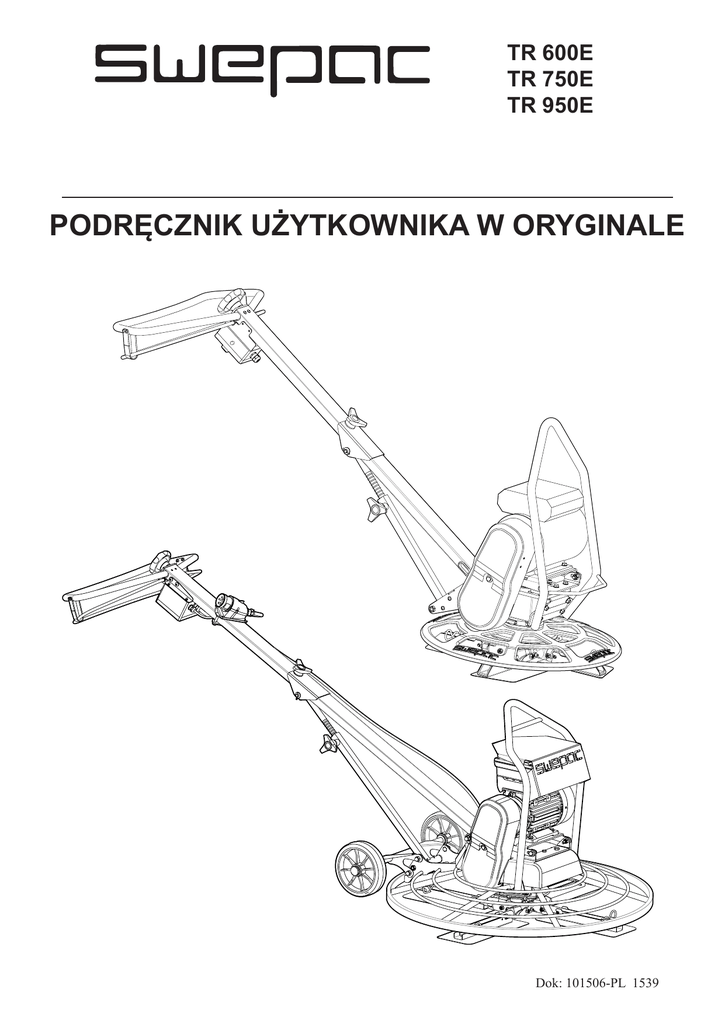 TR 600E TR 750E TR 950E PODRĘCZNIK UŻYTKOWNIKA W ORYGINALE Dok: 101506-PL 1539 TR600E / TR 750E / TR 950E SPIS TREŚCI Dok: 101506-PL 1539 INSTRUKCJE DOTYCZĄCE BEZPIECZEŃSTWA.............3 EKSPLOATACJA, ŚRODKI OSTROŻNOŚCI....................... 3, 4, 5, 6 TRANSPORT I BEZPIECZEŃSTWO MASZYNY................ 6 KONSERWACJA I BEZPIECZEŃSTWO MASZYNY..........6 DANE TECHNICZNE.............................................................. 7 OPIS.......................................................................................... 8 OZNACZENIA I SYMBOLE................................................... 9 OPIS SILNIK I UKŁAD ELEKTRYCZNY............................. 10 REGULARNA KONTROLA .................................................. 10 URUCHOMIENIE I ZATRZYMANIE ...................................11 EKSPOATACJA........................................................................ 11, 12, 13 PODNOSZENIE I TRANSPORT............................................. 14 WYMIARY............................................................................... 15 ROZWIĄZYWANIE PROBLEMÓW TR750E / TR950E.......16, 18 SCHEMAT OKABLOWANIA TR750E / TR950E.................. 17 SKŁADOWANIE I UTYLIZACJA...........................................19 UWAGI..................................................................................... 19, 20, 21, 22 DEKLARACJA ZGODNOŚCI WE......................................... 23 2 TR600E / TR 750E / TR 950E INSTRUKCJA BEZPIECZEŃSTWA W celu uniknięcia poważnych obrażeń a nawet śmierci, przed przystąpieniem do pracy z urządzeniem, obsługą, konserwacją, wymianą lub montażem wyposażenia dodatkowego, przeczytaj dokładnie i ze zrozumieniem instrukcję bezpieczeństwa i obsługi maszyny. Upewnij się, że każda osoba na stanowisku pracy przed rozpoczęciem użytkowania lub serwisowania zapoznała się z instrukcją bezpieczeństwa i obsługi maszyny. Instrukcja musi być dostępna w miejscu pracy urządzenia. Dodatkowo operator lub jego pracodawca musi ocenić możliwość ryzyka zagrożenia spowodowanego przez każdorazowe użytkowanie tej maszyny. Dodatkowe instrukcje bezpieczeństwa związane z silnikiem napędowym znajdują się w instrukcji bezpieczeństwa i obsługi producenta silnika. Środki ochrony osobistej i kwalifikacje Urządzenie może być obsługiwane i użytkowane tylko i wyłącznie przez wykwalifikowany i przeszkolony personel. Operatorzy muszą być w stanie właściwie ocenić swoje możliwości fizyczne dotyczące obsługi w zakresie masy, wagi i mocy urządzenia. Zawsze należy kierować się zdrowym rozsądkiem i właściwym osądem sytuacji. Środki ochrony osobistej Używaj tylko i wyłącznie atestowanego sprzętu ochrony osobistej. Operatorzy oraz wszystkie pozostałe osoby znajdujące się w zakresie pracy urządzenia muszą posiadać sprzęt ochrony osobistej zawierający przynajmniej: Kask ochronny, ochronniki słuchu, odporne na uderzenia okulary ochronne z osłonami bocznymi, maskę przeciwpyłową, rękawice ochronne, właściwe obuwie robocze, właściwe ubranie robocze zakrywające ramiona i nogi Narkotyki, alkohol oraz leki Narkotyki, alkohol oraz leki mogą mieć wpływ na Twoją koncentrację i ocenę sytuacji. Niewłaściwa ocena sytuacji oraz zła koncentracja mogą prowadzić do uszkodzenia ciała a nawet utraty życia. W przypadku kontaktu gorących elementów urządzenia lub układu wydechowego z materiałami wybuchowymi istnieje zagrożenie wybuchem. Podczas pracy urządzeniem na różnym materiale może dojść do iskrzenia lub zapłonu. Każdy wybuch lub eksplozja może doprowadzić do poważnych zranień lub śmierci. Nigdy nie używaj urządzenia w środowisku wybuchowym, w pobliżu materiałów łatwopalnych, oparów lub pyłów. Sprawdź, czy w pobliżu nie ma niewykrytych źródeł gazu lub materiałów wybuchowych. Unikaj kontaktu z elementami układu wydechowego oraz dolną częścią maszyny. NIEBEZPIECZEŃSTWO Pożaru Pożar maszyny może być przyczyną poważnego zranienia. W razie pożaru maszyny, stosuj gaśnice proszkowe klasy ABE. NIEBEZPIECZEŃSTWO Zagrożenia paliwem Paliwa silnikowe są materiałem bardzo łatwo palnym a jego opary mogą wybuchnąć podczas zapłonu powodując poważne zranienia lub śmierć. Unikaj kontaktu paliwa ze skórą. W przypadku kontaktu skóry z paliwem natychmiast skontaktuj się z lekarzem lub wykwalifikowaną służbą medyczną. Nigdy nie odkręcaj korka wlewu paliwa oraz nie napełniaj zbiornika paliwa, gdy maszyna jest gorąca. Zbiornik paliwa napełniaj na wolnym powietrzu lub w pomieszczeniach z bardzo dobrą wentylacją z dala od źródeł otwartego ognia. Uzupełniaj paliwo w odległości minimum 10 metrów od miejsca użytkowania maszyny. Korek paliwa odkręcaj powoli w celu usunięcia nadciśnienia ze zbiornika. Nigdy nie przelewaj zbiornika paliwa. Przed użyciem maszyny sprawdź, czy korek wlewu paliwa jest dokręcony. Unikaj rozlewania paliwa i natychmiast usuń wszystkie jego pozostałości. Regularnie sprawdzaj, czy nie ma wycieków paliwa z silnika maszyny. Nigdy nie używaj maszyny w pobliżu materiałów iskrzących. Przed uruchomieniem maszyny usuń wszystkie gorące lub iskrzące urządzenia. Dok: 101506-PL 1539 Nigdy nie używaj maszyny, jeżeli jesteś zmęczony, spożywałeś alkohol, narkotyki lub leki. Nikt, kto jest pod wpływem alkoholu, narkotyków lub leków nie może obsługiwać maszyny. OBSŁUGA, ŚRODKI OSTROŻNOŚCI. Zagrożenie wybuchem 3 TR600E / TR 750E / TR 950E Nigdy nie pal podczas napełniania zbiornika paliwa, pracy z maszyną lub jej serwisowania. Paliwo przechowuj tylko i wyłącznie w pojemnikach do tego przeznaczonych. Zużyte pojemniki po paliwach i olejach muszą być zwrócone do dostawcy lub firm utylizacyjnych. Nigdy nie używaj palców w celu sprawdzenia nieszczelności. UWAGA Nieoczekiwany ruch maszyny Podczas pracy maszyna narażona jest na duże obciążenia. Po zatrzymaniu maszyny lub jej zablokowa