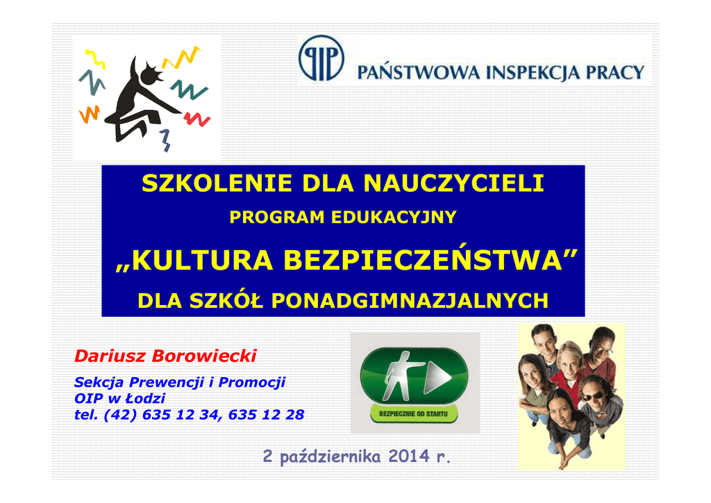SZKOLENIE DLA NAUCZYCIELI PROGRAM EDUKACYJNY „KULTURA BEZPIECZEŃSTWA” DLA SZKÓŁ PONADGIMNAZJALNYCH Dariusz Borowiecki Sekcja Prewencji i Promocji OIP w Łodzi tel. (42) 635 12 34, 635 12 28 2 października 2014 r. PROGRAM • Dlaczego program „Kultura Bezpieczeństwa” • Założenia programu, cele i realizacja • Nowości • Prezentacja materiału dydaktycznego • Bezpieczeństwo pracy przy obsłudze maszyn i urządzeń technicznych PIERWSZA PRACA - ZAGROŻENIA Młodzi pracownicy ofiarami wypadków!!! Jedna trzecia spośród osób poszkodowanych w wypadkach przy pracy, to pracownicy zatrudnieni krócej niż rok Jedna czwarta nie ukończyła 30 roku życia PRACOWNIK, KTÓRY ROZPOCZYNA PRACĘ CZĘŚCIEJ NIŻ INNI MOŻE… …narazić na niebezpieczeństwo wypadku siebie współpracowników osoby postronne ZAGROŻENIA „MŁODEGO WIEKU” brak dostatecznej wiedzy o pracy i zagrożeniach nieznajomość własnych cech charakteru reakcji w sytuacjach stresowych odmienne niż u ludzi starszych i bardziej doświadczonych pojmowanie śmierci CELE PROGRAMU kształtowanie świadomości zagrożeń występujących w środowisku pracy wśród nauczycieli, uczniów szkół ponadgimnazjalnych oraz studentów podniesienie poziomu wiedzy w zakresie prawnej ochrony pracy i zasad zapewniania bezpiecznych warunków pracy wśród młodzieży szkolnej (w szczególności w szkołach o profilu zawodowym) i akademickiej PROGRAM EDUKACYJNY Opracowanie i druk materiałów dla nauczycieli i informatora dla uczniów Podczas lekcji nauczyciele przekazują wiedzę z zakresu prawa pracy i bhp lekcja z udziałem inspektora pracy OIP rekrutują nauczycieli Szkolenie dla nauczycieli w OIP, przekazanie materiałów CO DAJEMY… Materiały pomocnicze dla nauczycieli dla szkół ponadgimnazjalnych pn. „Kultura bezpieczeństwa” (z płytą DVD) Poradnik z zakresu prawa pracy dla młodych ludzi podejmujących pierwszą pracę i inne wydawnictwa PIP Ekspercką wiedzę z zakresu prawa pracy i bhp inspektorów pracy, którzy są do Państwa dyspozycji podczas realizacji programu inspektorzy pracy Psycholog – Marta Kwiatkowska – 42 635 12 35 Zaświadczenie o udziale w programie edukacyjnym www.lodz.oip.pl CZEGO OCZEKUJEMY… Przekazania innym nauczycielom w Państwa szkole (np. wykorzystując radę pedagogiczną, szkolenia okresowe bhp) idei podejmowania z młodzieżą tematyki z zakresu bhp Przeprowadzenia co najmniej 2 lekcji dla uczniów na bazie przekazanego Państwu materiału edukacyjnego (do marca 2015 r.) Przesłania informacji i ankiety - do końca marca 2015 r. Optymizmu i zaangażowania www.lodz.oip.pl REALIZACJA PROGRAMU W SZKOŁACH Dwa podejścia do realizacji programu „Kultura bezpieczeństwa” Odrębny przedmiot „Kultura bezpieczeństwa” „BHP i ergonomia” Poprzez treści zawarte w programach nauczania poszczególnych przedmiotów i w ramach zajęć pozalekcyjnych NOWOŚCI 2013/2014/2015 Dyplomy dla szkół Identyfikacja wizualna Podręcznik dla uczniów Ogólnopolski konkurs wiedzy Międzyszkolny konkurs plastyczny – III edycja lodz.pip.gov.pl www.pip.gov.pl/start/ PODZIĘKOWANIE DLA SZKOŁY IDENTYFIKACJA WIZUALNA programu edukacyjnego w roku 2013/2014 NOWY PORADNIK DLA UCZNIÓW I STUDENTÓW NOWY PORADNIK DLA UCZNIÓW I STUDENTÓW NOWY PORADNIK DLA UCZNIÓW I STUDENTÓW OGÓLNOPOLSKI KONKURS DLA UCZNIÓW SZKÓŁ PONADGIMNAZJALNYCH • Pierwsza edycja w roku szkolnym 2013/2014 • Dla szkół biorących udział w programie edukacyjnym • Trzy etapy: • • • szkolny (wrzesień-listopad) regionalny (grudzień-luty) ogólnopolski (kwiecień) • Ogólnopolska baza pytań • Ważne daty: • • 31.10.2014 (25) 30.11.2014 „KULTURA BEZPIECZEŃSTWA” Materiały edukacyjne dla szkół I etap edukacyjny (klasy I – III szkoły podstawowej) Moduły: II etap edukacyjny (klasy IV – VI szkoły podstawowej) 1. III etap edukacyjny: Szkoły gimnazjalne Bezpieczna droga do szkoły i domu – 10 godzin lekcyjnych Moduły: 2. IV etap edukacyjny: ponadgimnazjalne Moduły: Zasady bezpiecznego zachowania się w szkole - 10 godzin lekcyjnych 1. W świecie zagrożeń – 10Szkoły godzin lekcyjnych 3. Higiena pracy w zachowania domu i szkole 10 godzin lekcyjnych Moduły: 1. Zasady higienicznego trybu życia – 5 godzin lekcyjnych 2. Bezpieczne w– domu – 6 godzin lekcyjnych 4. Bezpieczeństwo pożarowe – –5 6 godzin lekcyjnych 2. Zagrożenia jednostki ze strony przyrody, minimalizacja tych 3. Człowiek i jego zdrowie godzin 1. Prawna ochrona pracy – 6lekcyjnych godzin lekcyjnych zagrożeń oraz zasady postępowania w sytuacjach zagrożenia Ergonomia szkole i domu –w5czasie godzin lekcyjnych 4. Bezpieczne zachowania wypoczynku – 10 godzin lekcyjnych 2.– 5wgodzin Elementy ergonomii, fizjologii i higieny pracy – lekcyjnych 5 godzin lekcyjnych 5. 3. Bezpieczne zachowanie w szkole – 6 godzin lekcyjnych Zagrożenia cywilizacyjne, sposoby ich minimalizacji, zasady postępowania wi sytuacji zagrożenia – 8 godzin lekcyjnych 3. Zagrożenia profilaktyka pracy – 10 godzin 6. Bezpieczne zachowania na drodzew– środowisku 6 godzin lekcyjnych lekcyjnych 4. Zagrożenia zbiorowe, zasady postępowania w sytuacjach zagrożenia – 5 godzin poza lekcyjnych 4. Bezpieczeństwo pracą – 4 godziny lekcyjne 5. 5. Zasady udzielania pierwszej pomocy – 6 godzin lekcyjnych 5. Postępowanie w sytuacjach zagrożeń, awarii i wypadków – 3 godziny lekcyjne STRUKTURA „MODUŁOWA” MATERIAŁÓW Modułowa struktura pomocy edukacyjnych – autonomiczny zbiór jednostek lekcyjnych, składających się na całość danego zagadnienia, które mogą być zrealizowane w ramach ścieżki międzyprzedmiotowej, bloku przedmiotowego, itp. Oprzyrządowanie każdego modułu pakietem edukacyjnym materiał źródłowy - podstawowa wiedza z zakresu modułu materiały pomocnicze dla nauczyciela i dla ucznia foliogramy (prezentacje komputerowe) Dwie wersje pakietów edukacyjnych: klasyczna, drukowana na płytac