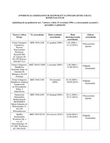 EWIDENCJA UDZIELONYCH ZEZWOLEŃ NA ŚWIADCZENIE USŁUG KOMUNALNYCH (udzielonych na podstawie art. 7 ustawy z dnia 13 września 1996 r. o utrzymaniu czystości i porządku w gminach) Nazwa i Adres Firmy Nr zezwolenia Data wydania zezwolenia Data obowiązywania zezwolenia Zakres zezwolenia Firma Transport CięŜarowy, Wywóz Nieczystości Płynnych Ryszard Miś ul. Lipowa 58 64-150 Wijewo 604-807-513 BPR 7054-2/08 31 grudnia 2008 r. 1.01.2009 r. 31.12.2018 r. •Nieczystości płynne Firma Usługowo- BRŚ 7054/2/2009 1 września 2009 r. Handlowa Dominik Zając ul. Szkolna 46 Błotnica, 64-234 Przemęt 1.09.2009 r. 31.08.2019 r. •Odpady komunalne Firma Usługowo Handlowa Andrzej Frankowski ul. Powstańców Wlkp. 5 Zaborówiec BRŚ 7054-3/09 28 wrzesień 2009r. 01.10.2009 r. – 30.09.2019 r. •Odpady komunalne Hurtownia Materiałów Budowlanych BUDOMEX Maria Sobecka ul. Wolsztyńska 11, 64-140 Włoszakowice BRŚ 7054-4/09 23 listopad 2009 r. 24.11.2009 r. 25.11.2014 r. •Nieczystości płynne Spółka Komunalna Wschowa Sp. z o.o. ul. Daszyńskiego 10 67-400 Wschowa 65/ 540-26-05 BRŚ 7054-02/10 24 czerwca 2010 r. 24.06.2010 r. 23.06.2020 r. •Odpady komunalne Spółka Komunalna Wschowa Sp. z o.o. ul. Daszyńskiego 10 67-400 Wschowa BRŚ 7054-5/10 1 lipca 2010 r. 01.07.2010 r. 30.06.2020 r. •Nieczystości płynne TEW Gospodarowanie odpadami ul. Przyszłości 7b, 67-100 Nowa Sól 068/387-32-85 BRŚ 7054-6/10 01 lipca 2010 r. 01.07.2010 r. – 30.06.2014 r. •Odpady komunalne Firma Usługowo Handlowa Andrzej Frankowski ul. Powstańców Wlkp. 5 Zaborówiec 065/549-44-65 600-457-393 BRŚ 7054-7/10 12 października 2010 r. 12.10.2010 r. – 11.10.2014 r. •Nieczystości płynne 11 marca 2011 r. 14.03.2011 r. – 14.03.2014 r. •Nieczystości płynne Usługi – BAZAR BRŚ 6223.2.2011 Iwona Kozłowska Bazar, Nowe Strącze 23, 67-410 Sława 603-864-218