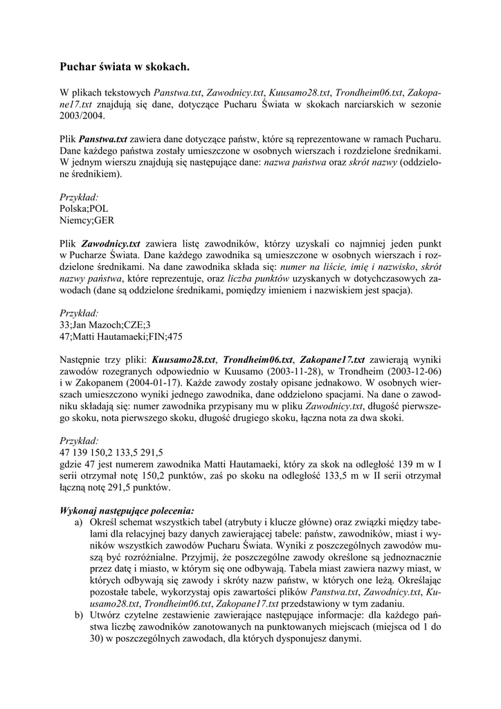 Puchar świata w skokach. W plikach tekstowych Panstwa.txt, Zawodnicy.txt, Kuusamo28.txt, Trondheim06.txt, Zakopane17.txt znajdują się dane, dotyczące Pucharu Świata w skokach narciarskich w sezonie 2003/2004. Plik Panstwa.txt zawiera dane dotyczące państw, które są reprezentowane w ramach Pucharu. Dane kaŜdego państwa zostały umieszczone w osobnych wierszach i rozdzielone średnikami. W jednym wierszu znajdują się następujące dane: nazwa państwa oraz skrót nazwy (oddzielone średnikiem). Przykład: Polska;POL Niemcy;GER Plik Zawodnicy.txt zawiera listę zawodników, którzy uzyskali co najmniej jeden punkt w Pucharze Świata. Dane kaŜdego zawodnika są umieszczone w osobnych wierszach i rozdzielone średnikami. Na dane zawodnika składa się: numer na liście, imię i nazwisko, skrót nazwy państwa, które reprezentuje, oraz liczba punktów uzyskanych w dotychczasowych zawodach (dane są oddzielone średnikami, pomiędzy imieniem i nazwiskiem jest spacja). Przykład: 33;Jan Mazoch;CZE;3 47;Matti Hautamaeki;FIN;475 Następnie trzy pliki: Kuusamo28.txt, Trondheim06.txt, Zakopane17.txt zawierają wyniki zawodów rozegranych odpowiednio w Kuusamo (2003-11-28), w Trondheim (2003-12-06) i w Zakopanem (2004-01-17). KaŜde zawody zostały opisane jednakowo. W osobnych wierszach umieszczono wyniki jednego zawodnika, dane oddzielono spacjami. Na dane o zawodniku składają się: numer zawodnika przypisany mu w pliku Zawodnicy.txt, długość pierwszego skoku, nota pierwszego skoku, długość drugiego skoku, łączna nota za dwa skoki. Przykład: 47 139 150,2 133,5 291,5 gdzie 47 jest numerem zawodnika Matti Hautamaeki, który za skok na odległość 139 m w I serii otrzymał notę 150,2 punktów, zaś po skoku na odległość 133,5 m w II serii otrzymał łączną notę 291,5 punktów. Wykonaj następujące polecenia: a) Określ schemat wszystkich tabel (atrybuty i klucze główne) oraz związki między tabelami dla relacyjnej bazy danych zawierającej tabele: państw, zawodników, miast i wyników wszystkich zawodów Pucharu Świata. Wyniki z poszczególnych zawodów muszą być rozróŜnialne. Przyjmij, Ŝe poszczególne zawody określone są jednoznacznie przez datę i miasto, w którym się one odbywają. Tabela miast zawiera nazwy miast, w których odbywają się zawody i skróty nazw państw, w których one leŜą. Określając pozostałe tabele, wykorzystaj opis zawartości plików Panstwa.txt, Zawodnicy.txt, Kuusamo28.txt, Trondheim06.txt, Zakopane17.txt przedstawiony w tym zadaniu. b) Utwórz czytelne zestawienie zawierające następujące informacje: dla kaŜdego państwa liczbę zawodników zanotowanych na punktowanych miejscach (miejsca od 1 do 30) w poszczególnych zawodach, dla których dysponujesz danymi. c) Sporządź zestawienie 30 pierwszych zawodników w kolejności zajętych miejsc na zawodach w Zakopanem. Takie samo zestawienie sporządź równieŜ dla zawodów w Kuusamo. O miejscu zawodnika decyduje łączna nota uzyskana za dwa skoki. Wynikowe zestawienie ma zawierać dla kaŜdego zawodnika: zajęte miejsce (numer miejsca), imię i nazwisko zawodnika, skrót nazwy państwa, które reprezentuje, długość pierwszego i drugiego skoku oraz łączną notę za oba skoki. d) Utwórz informację o wynikach Adama Małysza na zawodach w Zakopanem, Kuusamo i Trondheim. Odpowiedź dla jednych zawodów składa się z: nazwy miasta w którym odbyły się zawody, odległości uzyskanej w pierwszej i drugiej serii skoków, uzyskanej noty, zajętego miejsca. ODPOWIEDZI: a) TABELE – wersja I: Państwa (nazwa, skrótPaństwa); Miasta (miasto, skrótPaństwa); Zawodnicy ( numerZawodnika, imięinazwisko, skrótPaństwa, punkty) Wyniki ( data, miasto, numerZawodnika, skok1, nota1, skok2,notaŁączna) TABELE – wersja II: Państwa (nazwa, skrótPaństwa); Miasta (miasto, skrótPaństwa); Zawodnicy( numerZawodnika, imięinazwisko, skrótPaństwa, punkty) Kuusamo28(numerZawodnika, skok1, nota1, skok2, notaŁączna), Trondheim06(numerZawodnika, skok1, nota1, skok2, notaŁączna), Zakopane17(numerZawodnika, skok1, nota1, skok2, notaŁączna) ZWIĄZKI MIĘDZY TABELAMI – wersja I: Państwa.skrótPaństwa 1:N Zawodnicy.sktótPaństwa (kluczgłówny: Państwa.skrótPaństwa) Zawodnicy.NumerZawodnika 1:N Wyniki.NumerZawodnika (kluczgłówny: Wyniki.NumerZawodnika) Państwa.skrótPaństwa 1:N Miasta.skrótPaństwa (klucz: skrótPaństwa) ZWIĄZKI MIĘDZY TABELAMI – wersja II: Państwa.skrótPaństwa 1:N Zawodnicy.skrótPaństwa (kluczgłówny: Państwa.skrótPaństwa) Zawodnicy.NumerZawodnika 1:1 Kuusamo28.NumerZawodnika (kluczgłówny: Kuusamo28.NumerZawodnika) Zawodnicy.NumerZawodnika 1:1 Trondheim06.NumerZawodnika (kluczgłówny: Trondheim06.NumerZawodnika) Zawodnicy.NumerZawodnika 1:1 Zakopane17.NumerZawodnika (kluczgłówny: Zakopane17.NumerZawodnika) Państwa.skrótPaństwa 1:N Miasta.skrótPaństwa (klucz: skrótPaństwa) b) POL FIN NOR Ger SUI AUT CZE JPN USA SLO FRA SWE RUS EST SVK KAZ KOR Zakopane 4 4 6 6 0 7 0 0 0 3 0 0 0 0 0 0 0 Kuusamo 1 7 4 3 1 5 2 3 1 3 0 0 0 0 0 0 0 c) Kuusamo: 1. "Matti Hautamaeki";"FIN";139,00;133,50;291,50 2. "Adam Malysz";"POL";132,00;134,00;277,30 3. "Veli-Matti Lindstroem";"FIN";122,00;135,50;261,00 4. "Tommy Ingebrigtsen";"NOR";131,00;124,50;257,40 5. "Sven Hannawald";"GER";126,50;124,00;246,90 6. "Andreas Goldberger";"AUT";121,00;127,00;244,90 7. "Bjoern Einar Romoeren";"NOR";131,00;115,50;242,20 8. "Peter Zonta";"SLO";124,00;123,00;241,10 9. "Thomas Morgenstern";"AUT";125,00;121,00;239,80 10. "Roar Ljoekelsoey";"NOR";133,50;111,00;238,60 11. "Hiroki Yamada";"JPN";116,00;127,50;233,30 12. "Noriaki Kasai";"JPN";130,50;110,00;228,40 13. "Clint Jones";"USA";121,50;115,00;222,20 14. "Andreas Kofler";"AUT";116,50;120,50;221,10 15. "Martin Hoellwarth";"AUT";116,00;117,50;215,30 16. "Rok Benkovic";"SLO";115,50;119,00;214,60 17. "Tami Kiuru";"FIN";130,00;100,00;209,00 18. "Akseli Kokkonen";"FIN";110,00;123,00;207,90 19. "Jakub Janda";"CZE";112,5