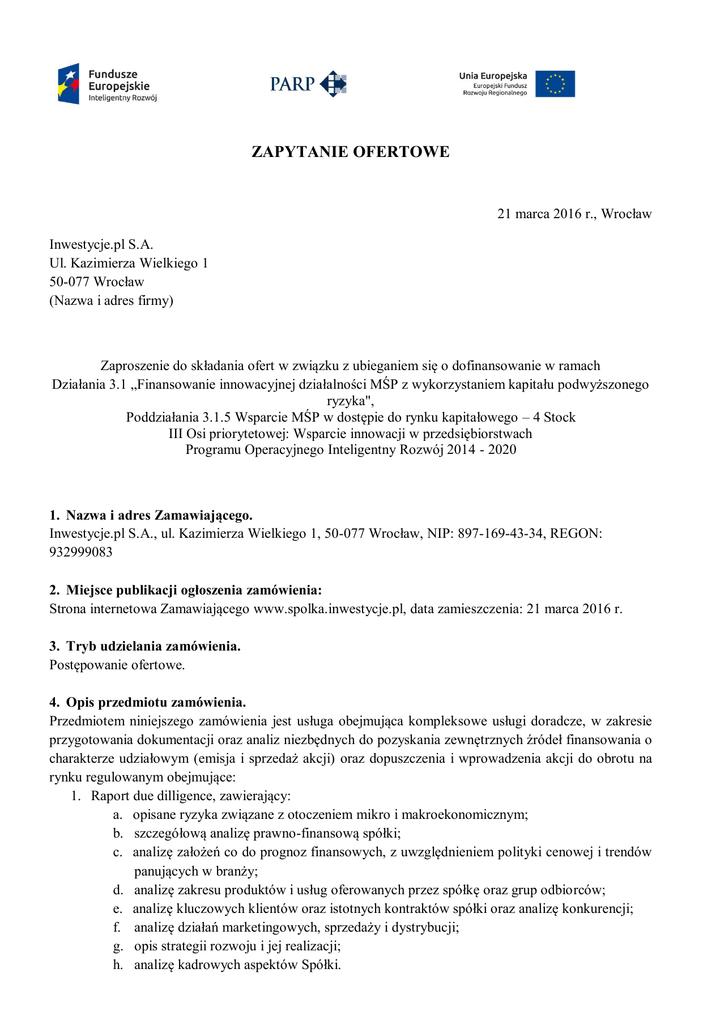 ZAPYTANIE OFERTOWE 21 marca 2016 r., Wrocław Inwestycje.pl S.A. Ul. Kazimierza Wielkiego 1 50-077 Wrocław (Nazwa i adres firmy) Zaproszenie do składania ofert w związku z ubieganiem się o dofinansowanie w ramach Działania 3.1 „Finansowanie innowacyjnej działalności MŚP z wykorzystaniem kapitału podwyższonego ryzyka", Poddziałania 3.1.5 Wsparcie MŚP w dostępie do rynku kapitałowego – 4 Stock III Osi priorytetowej: Wsparcie innowacji w przedsiębiorstwach Programu Operacyjnego Inteligentny Rozwój 2014 - 2020 1. Nazwa i adres Zamawiającego. Inwestycje.pl S.A., ul. Kazimierza Wielkiego 1, 50-077 Wrocław, NIP: 897-169-43-34, REGON: 932999083 2. Miejsce publikacji ogłoszenia zamówienia: Strona internetowa Zamawiającego www.spolka.inwestycje.pl, data zamieszczenia: 21 marca 2016 r. 3. Tryb udzielania zamówienia. Postępowanie ofertowe. 4. Opis przedmiotu zamówienia. Przedmiotem niniejszego zamówienia jest usługa obejmująca kompleksowe usługi doradcze, w zakresie przygotowania dokumentacji oraz analiz niezbędnych do pozyskania zewnętrznych źródeł finansowania o charakterze udziałowym (emisja i sprzedaż akcji) oraz dopuszczenia i wprowadzenia akcji do obrotu na rynku regulowanym obejmujące: 1. Raport due dilligence, zawierający: a. opisane ryzyka związane z otoczeniem mikro i makroekonomicznym; b. szczegółową analizę prawno-finansową spółki; c. analizę założeń co do prognoz finansowych, z uwzględnieniem polityki cenowej i trendów panujących w branży; d. analizę zakresu produktów i usług oferowanych przez spółkę oraz grup odbiorców; e. analizę kluczowych klientów oraz istotnych kontraktów spółki oraz analizę konkurencji; f. analizę działań marketingowych, sprzedaży i dystrybucji; g. opis strategii rozwoju i jej realizacji; h. analizę kadrowych aspektów Spółki. 2. Wycenę spółki, dokonaną trzema niezależnymi metodami: a. metoda dochodowa; b. metoda bazująca na kosztach i majątku przedsiębiorstwa; c. metoda porównań rynkowych. 3. Teaser inwestycyjny; zawierający: a. informacje o działalności Spółki (w tym opis modelu biznesowego); b. informacje o potencjale rynkowym związanym z usługą planowaną do wdrożenia w związku z pozyskiwanym kapitałem; c. opis przewagi konkurencyjnej; d. informacje o zespole zarządzającym. 4. Prezentację inwestorską, zawierającą: a. ogólny opis Spółki i jej działalności; b. profil biznesowy i otoczenie rynkowe; c. wybrane dane finansowe; d. wstępny harmonogram oferty i opis mechanizmów transakcji; e. wstępne parametry inwestycji; f. dane kontaktowe. 5. Procedura obiegu informacji poufnych spełniająca poniższe wymagania: W ramach wydatku zostaną opracowane wewnętrzne regulaminy, dostosowane do specyfiki działalności Wnioskodawcy oraz spółek z Grupy Kapitałowej w zakresie ochrony informacji poufnych, obiegu tych informacji oraz ścieżka przekazywania do publicznej wiadomości. W ramach wydatku niezbędne będzie przenalizowanie obecnie stosowanych „zwyczajów” w zakresie obiegu informacji oraz opracowanie nowych wytycznych dostosowanych do stanu obecnego w sposób niezakłócający dotychczasową pracę Wnioskodawcy i spółek z Grupy Kapitałowej. Opracowany dokument stanowić będzie zestaw regulaminów, wytycznych w zakres obiegu informacji poufnych zgodny z najwyższymi standardami spółek giełdowych oraz obowiązujących przepisów prawa. 6. Polityka informacyjna Spółki, spełniająca poniższe wymagania: a. określenie celu polityki informacyjnej, b. określenie interesariuszy oraz ich potrzeb w zakresie pozyskiwania informacji na temat działalności Spółki, c. zasady prezentacji informacji wobec poszczególnych interesariuszy w kontekście obowiązków informacyjnych wynikających z przepisów prawa, d. określenie i analiza aktów prawnych i regulacji mających wpływ na politykę informacyjną (m.in. KSH, ustawa o ofercie ustawa o obrocie, rozporządzenia ministra finansów w sprawie informacji bieżących (…), regulamin giełdy i wiele innych), e. analiza komunikacji wewnętrznej Spółki, f. analiza i określenie ról poszczególnych jednostek administracyjnej Spółki w zakresie komunikacji zewnętrznej, g. analiza wykorzystania infrastruktury informatycznej w zakresie przekazywania i obiegu informacji, h. bezpieczeństwo obiegu informacji oraz zasad przekazywania informacji do publicznej wiadomości. 5. Wymagania wobec Wykonawcy Kryteria formalne: Nie dotyczy Kryteria merytoryczne: Dodatkowej ocenie podlegać będzie spełnienie następujących wymagań dotyczących posiadanego doświadczenia i kompetencji: liczba klientów, dla których oferent świadczył usługi w ramach Poddziałania 3.3.2 POIG „Wsparcie dla MSP”, liczba osób wpisanych na listę maklerów papierów wartościowych prowadzoną przez Komisję Nadzoru Finansowego, z którymi oferent współpracuje na podstawie umowy o pracę, umowy cywilno-prawnej lub innej umowy o współpracy na dzień opublikowania zapytania ofertowego. 6. Termin wykonania zamówienia Nie później niż 36 miesięcy od daty zawarcia umowy na realizację usługi. Szczegółowy termin wykonania zamówienia zostanie określony w zawartej umowie z Wykonawcą. 7. Osoby uprawnione do porozumiewania się z Wykonawcami ; Anna Sołowska-Łabaz – Prezes Zarządu 8. Miejsce i termin złożenia oferty oraz okres jej ważności. Ofertę należy złożyć (osobiście, za pośrednictwem poczty lub kuriera, w siedzibie Zamawiającego lub w postaci elektronicznej na adres: [email protected]) w nieprzekraczalnym terminie 7 dni kalendarzowych od daty upublicznienia zapytania ofertowego (termin biegnie od dnia następnego po dniu upublicznienia zapytania ofertowego i kończy się z upływem ostatniego dnia)., tj. do 28.03.2016 r. Termin ważności oferty minimum do 31.12.2017 r. 9. Termin rozstrzygnięcia zapytania ofertowego. Rozstrzygnięcie zapytania ofertowego nastąpi w dniu następnym po ostatecznym te