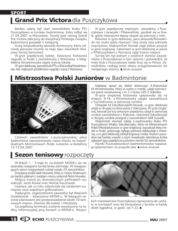SPORT Grand Prix Victora dla Puszczykowa Bardzo udany był start zawodników klubu PTS Puszczykowo w turnieju badmintona, który odbył się 21.04.2007 w Warszawie. Turniej pod nazwą Grand Prix Victora zaliczany do klasyfikacji Polskiego Związku Badmintona posiadał V kategorię. Dużą niespodziankę sprawiły dziewczyny, które odniosły pierwsze triumfy na tego typu zawodach (Krajowy Turniej Seniorów). W grze pojedynczej kobiet, Katarzyna Kistowska wygrała w finale z zawodniczką z Warszawy, a Magdalena Wrześniewska zajęła trzecią lokatę. W grze deblowej, zawodniczki PTS-u Kistowska/Wrześniewska, bez większych problemów wygrały z parą z Warszawy. W grze pojedynczej mężczyzn, zawodnicy z Puszczykowa J.Janaszek i P.Niewoliński, spotkali się w finale, gdzie nieznaczne lepszy okazał się pierwszy z nich. Również w grze deblowej, para Janaszek/Niewoliński nie miała sobie równych i bez straty seta odniosła zwycięstwo. Maksymilian Nowak zajął dalsze pozycje w grze singlowej, natomiast w grze deblowej w parze z P.Pieluszyńskim z Poznania zajął trzecie miejsce. Turniej ten był jednym z ostatnich startów zawodników z Puszczykowa w tym sezonie i potwierdził, że mały klub z Puszczykowa nadal liczy się w Polsce. Zawodników czekają teraz obozy przygotowawcze do następnego sezonu. Jakub Janaszek Mistrzostwa Polski Juniorów w Badmintonie Czterech zawodników z puszczykowskiej sekcji badmintona reprezentowało nasze miasto na Indywidualnych Mistrzostwach Polski Juniorów w Kobylnicy 13-15.04.2007. Najlepiej spisał się debel dziewczyn K.Kistowska/ M.Wrześniewska, który w walce o medal, uległ nieznacznie parze rozstawionej z nr 2 z klubu UKS 2 Sobótka. W grze singlowej Kistowska uplasowała się na miejscu 9-16, a Wrześniewska uległa zawodniczce z Suchedniowa w pierwszej rundzie. Chłopaki M.Szkudlarczyk/M.Nowak, w grze deblowej ulegli w drugiej rundzie parze z Warszawy. W grze singlowej, Nowak po trzy setowym pojedynku uległ w pierwszej rundzie zawodnikowi z Krakowa, natomiast Szkudlarczyk w drugiej rundzie przegrał z zawodnikiem SKB Suwałki. Wspomnieć również należy o wychowanku klubu PTS Puszczykowo Wojtku Szkudlarczyku, który na Mistrzostwach Polski Młodzieżowców w grze singlowej, wywalczył złoty medal w finale, pokonując byłego partnera deblowego Ł.Morenia, a w grze deblowej zdobył brązowy medal. Poziom zawodów był bardzo wysoki o czym świadczyła rekordowa liczba zgłoszeń (gra pojedyńcza juniorów niemal 50 zawodników). Wyniki Puszczykowskich badmintonistów napawają optymizmem na przyszłe lata. Jakub Janaszek Sezon tenisowy rozpoczęty W dniach 1 – 5 maja br. na kortach MOSiR-u po raz szesnasty rozegrano turniej tenisa ziemnego. W inaugurujących sezon rozgrywkach udział wzięło 23 zawodników. Zwycięzcą został Jarek Nowacki, który w meczu finałowym, po bardzo pięknym i zaciętym meczu pokonał Piotra Nowaka. Miejsca trzecie po dramatycznych półfinałach wywalczyli: Jacek Kowal oraz Henryk Kaczmarek. Impreza, jak co roku zakończyła się rozdaniem pucharów oraz wspólnym grillowaniem. Tradycyjnie, organizatorem zawodów był Wojciech Grześkowiak – dzierżawca MOSiR-u. W bieżącym sezonie planowane jest przeprowadzenie około 10 tenisowych imprez, również dla kobiet i młodzieży. Szczegółowy terminarz zostanie wywieszony na tablicy informacyjnej przy kortach w MOSiR-e. Wszyst- 18 ECHO PUSZCZYKOWA kich mieszkańców Puszczykowa zapraszamy do udziału w turniejach oraz do korzystania z kortów w każdy dzień tygodnia, w godz. od 7-22. MAJ 2007