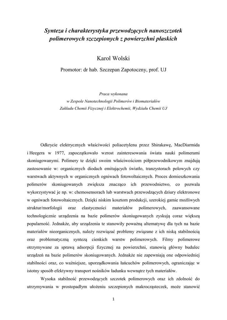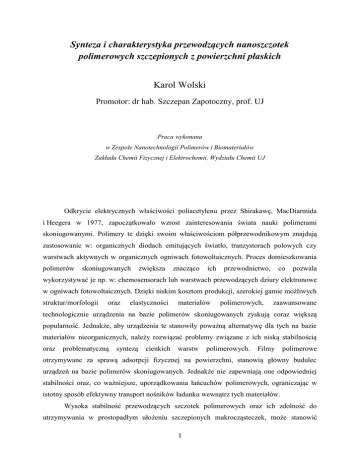 Synteza i charakterystyka przewodzących nanoszczotek polimerowych szczepionych z powierzchni płaskich Karol Wolski Promotor: dr hab. Szczepan Zapotoczny, prof. UJ Praca wykonana w Zespole Nanotechnologii Polimerów i Biomateriałów Zakładu Chemii Fizycznej i Elektrochemii, Wydziału Chemii UJ Odkrycie elektrycznych właściwości poliacetylenu przez Shirakawę, MacDiarmida i Heegera w 1977, zapoczątkowało wzrost zainteresowania świata nauki polimerami skoniugowanymi. Polimery te dzięki swoim właściwościom półprzewodnikowym znajdują zastosowanie w: organicznych diodach emitujących światło, tranzystorach polowych czy warstwach aktywnych w organicznych ogniwach fotowoltaicznych. Proces domieszkowania polimerów skoniugowanych zwiększa znacząco ich przewodnictwo, co pozwala wykorzystywać je np. w: chemosensorach lub warstwach przewodzących dziury elektronowe w ogniwach fotowoltaicznych. Dzięki niskim kosztom produkcji, szerokiej gamie możliwych struktur/morfologii oraz elastyczności materiałów polimerowych, zaawansowane technologicznie urządzenia na bazie polimerów skoniugowanych zyskują coraz większą popularność. Jednakże, aby urządzenia te stanowiły poważną alternatywę dla tych na bazie materiałów nieorganicznych, należy rozwiązać problemy związane z ich niską stabilnością oraz problematyczną syntezą cienkich warstw polimerowych. Filmy polimerowe otrzymywane za sprawą adsorpcji fizycznej na powierzchni, stanowią główny budulec urządzeń na bazie polimerów skoniugowanych. Jednakże nie zapewniają one odpowiedniej stabilności oraz, co ważniejsze, uporządkowania łańcuchów polimerowych, ograniczając w istotny sposób efektywny transport nośników ładunku wewnątrz tych materiałów. Wysoka stabilność przewodzących szczotek polimerowych oraz ich zdolność do utrzymywania w prostopadłym ułożeniu szczepionych makrocząsteczek, może stanowić 1 rozwiązanie wyżej wymienionych problemów. Dobrze uporządkowane, rozciągnięte, skoniugowane łańcuchy polimerowe mogą działać jako swego rodzaju platformy z przytwierdzonymi molekularnymi drutami, wykazującymi kierunkowe przewodnictwo prądu. Jednakże synteza tego rodzaju struktur jest wciąż dość problematyczna, z powodu braku prostych, uniwersalnych i kontrolowanych metod polimeryzacji inicjowanych bezpośrednio z powierzchni szczepienia. W odpowiedzi na te zapotrzebowania, głównym celem mojej pracy doktorskiej była synteza i charakterystyka różnych typów przewodzących szczotek polimerowych szczepionych na płaskich podłożach. Jako, że synteza skoniugowanych szczotek polimerowych za pomocą polimeryzacji łańcuchowych inicjowanych bezpośrednio od powierzchni jest trudna do zrealizowania, zdecydowano się wykorzystać do tego celu polimeryzację matrycową. W typowym procesie syntezy, za pomocą powierzchniowo-inicjowanych kontrolowanych polimeryzacji rodnikowych (SI-CRP) otrzymywano szczepione z powierzchni multimonomery z grupami bocznymi, które w kolejnym etapie poddawano polimeryzacji matrycowej z wytworzeniem skoniugowanych i podobnych strukturalnie do drabiny szczepionych łańcuchów polimerowych. Poliacetylen jest najprostszym polimerem skoniugowanym, który wykazuje najwyższe przewodnictwo i niestety najniższą stabilność ze wszystkich polimerów skoniugowanych. Co więcej, problemy związane z jego przetwórstwem, praktycznie uniemożliwiły wykorzystanie tego polimeru do komercyjnych zastosowań. W odpowiedzi na te problemy opracowano nową metodę syntezy stabilnych szczotek na bazie poliacetylenu (rysunek 1 A). W pierwszym etapie, w wyniku powierzchniowo-inicjowanej polimeryzacji za pośrednictwem fotoinifertera (SI-PIMP) dwufunkcyjnego monomeru (metakrylanu 3-trimetylosilylo-2-propynylu, TPM) z powierzchni złota, zmodyfikowanego mieszanymi monowarstwami fotoinicjatora, otrzymano szczotki PTPM o różnych gęstościach szczepienia. W następnym etapie, grupy acetylenowe w otrzymanych multimonomerach zostały odbezpieczone, a następnie spolimeryzowane za pomocą polimeryzacji matrycowej w obecności katalizatora rodowego. W rezultacie otrzymano drabinkowe skoniugowane szczotki PTPM, które następnie domieszkowano za pomocą jodu. Przewodnictwo szczotek zmierzono za pomocą mikroskopu sił atomowych (AFM), który pracował w trybie przewodzącym dedykowanym do pomiarów miękkiej materii. Świeżo zdomieszkowane szczotki PTPM wykazywały przewodnictwo na poziomie 10-1-100 S/m. Po sześciu miesiącach przechowywania próbek na powietrzu i ponownym procesie domieszkowania, wartość ich przewodnictwa spadła średnio ok. jeden rząd wielkości (rysunek 1 B). Pomiary te wskazały na wysoką stabilność otrzymanych 2 warstw, znacznie lepszą niż dla zwykłych warstw z poliacetylenu, który ulega degradacji w ciągu kilku godzin. Co więcej wykazano, że stabilność łańcuchów polimerów była największa dla szczotek PTPM o najwyższej gęstości szczepienia, w których łańcuchy polimerowe są silnie rozciągnięte. Rysunek 1. Schematyczny rysunek przewodzących szczotek na bazie poliacetylenu (A) wraz z histogramami (B) przedstawiającymi rozkład zmierzonych nachyleń krzywych prądowo napięciowych (dI/dU) dla świeżo domieszkowanych szczotek oraz próbek po sześciomiesięcznym okresie przechowywania na powietrzu. Druga część pracy dotyczyła syntezy wielofunkcyjnych szczotek na bazie poliacetylenu, wykazujących zarówno przewodnictwo elektryczne jak i jonowe. Tak więc, na powierzchni tlenku indu domieszkowanego tlenkiem cyny (ITO) w wyniku zastosowania różnych warunków SI-PIMP, otrzymano szczotki z poli(2-metyloizopropionianu 5-[2(trimetylosilylo)etynylo]pirydyn-2-ylu) (PMTEP) o różnej grubości. W kolejnym etapie, grupy acetylenowe w otrzymanych multimonomerach odbezpieczono, a następnie spolimeryzowano. Polimeryzacja matrycowa bocznych grup acetylenowych została wywołana prostą reakcją czwartorzędowania atomu azo
