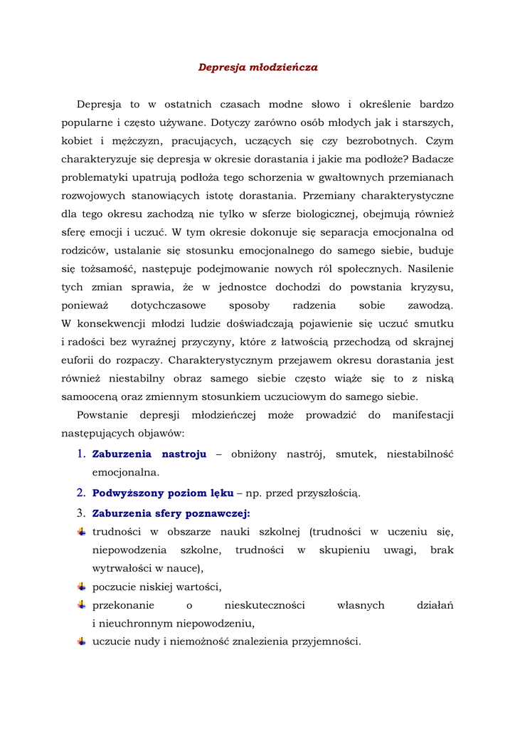 Depresja młodzieńcza Depresja to w ostatnich czasach modne słowo i określenie bardzo popularne i często używane. Dotyczy zarówno osób młodych jak i starszych, kobiet i mężczyzn, pracujących, uczących się czy bezrobotnych. Czym charakteryzuje się depresja w okresie dorastania i jakie ma podłoże? Badacze problematyki upatrują podłoża tego schorzenia w gwałtownych przemianach rozwojowych stanowiących istotę dorastania. Przemiany charakterystyczne dla tego okresu zachodzą nie tylko w sferze biologicznej, obejmują również sferę emocji i uczuć. W tym okresie dokonuje się separacja emocjonalna od rodziców, ustalanie się stosunku emocjonalnego do samego siebie, buduje się tożsamość, następuje podejmowanie nowych ról społecznych. Nasilenie tych zmian sprawia, że w jednostce dochodzi do powstania kryzysu, ponieważ dotychczasowe sposoby radzenia sobie zawodzą. W konsekwencji młodzi ludzie doświadczają pojawienie się uczuć smutku i radości bez wyraźnej przyczyny, które z łatwością przechodzą od skrajnej euforii do rozpaczy. Charakterystycznym przejawem okresu dorastania jest również niestabilny obraz samego siebie często wiąże się to z niską samooceną oraz zmiennym stosunkiem uczuciowym do samego siebie. Powstanie depresji młodzieńczej może prowadzić do manifestacji następujących objawów: 1. Zaburzenia nastroju – obniżony nastrój, smutek, niestabilność emocjonalna. 2. Podwyższony poziom lęku – np. przed przyszłością. 3. Zaburzenia sfery poznawczej: trudności w obszarze nauki szkolnej (trudności w uczeniu się, niepowodzenia szkolne, trudności w skupieniu uwagi, brak wytrwałości w nauce), poczucie niskiej wartości, przekonanie o nieskuteczności własnych i nieuchronnym niepowodzeniu, uczucie nudy i niemożność znalezienia przyjemności. działań 4. Zaburzenia aktywności, które mogą być przejawiane przez: wybuchy gniewu i agresji, trudności w podjęciu działania i szybkie męczenie się, trudności w rannym wstawaniu, lepsze funkcjonowanie w godzinach wieczornych, zaniedbywanie wyglądu. 5. Zaburzenia zachowania: trudności w realizacji czynności, których oczekuje się od osoby dorastającej, np. chodzenie do szkoły, wywiązywanie się z obowiązków domowych, zachowania łamiące normy i zakazy społeczne, np. eksperymentowanie ze środkami psychoaktywnymi, podejmowanie aktywności seksualnej, zachowania autodestrukcyjne, np. samookaleczenia, zachowania samobójcze. 6. Dolegliwości somatyczne – zgłaszanie objawów nie mających potwierdzenia w badaniu lekarskim. Leczenie depresji młodzieńczej Nie należy lekceważyć objawów depresji. Ważne by sprawdzić możliwości pomocy osobie dorastającej u specjalisty - psychologa lub psychiatry. Podstawową metodą leczenia depresji młodzieńczej jest psychoterapia indywidualna lub grupowa. Głównym zadaniem psychoterapeuty w kontakcie indywidualnym jest udzielenie pomocy w zakresie: wykrycie przyczyn rozbieżności pomiędzy ja idealnym, a ja rzeczywistym, urealnienie stosunku do samego siebie, zaakceptowanie siebie, wzmocnienie realnych możliwości, zamiana nieadekwatnych celów na realne. Psychoterapia grupowa jest w przypadku leczenia depresji młodzieńczej bardzo przydatna ze względu na możliwość uzyskania informacji zwrotnych bezpośrednio od rówieśników, daje możliwość wzajemnej pomocy i dostarcza wzmocnienia poczucia własnych kompetencji. Przy niepowodzeniach w terapii należy rozważyć skorzystanie z pomocy lekarza psychiatry dzieci i młodzieży w celu rozważenia konieczności rozpoczęcia leczenia farmakologicznego. Opracowała psycholog szkolny, Karolina Artowicz - Latocha