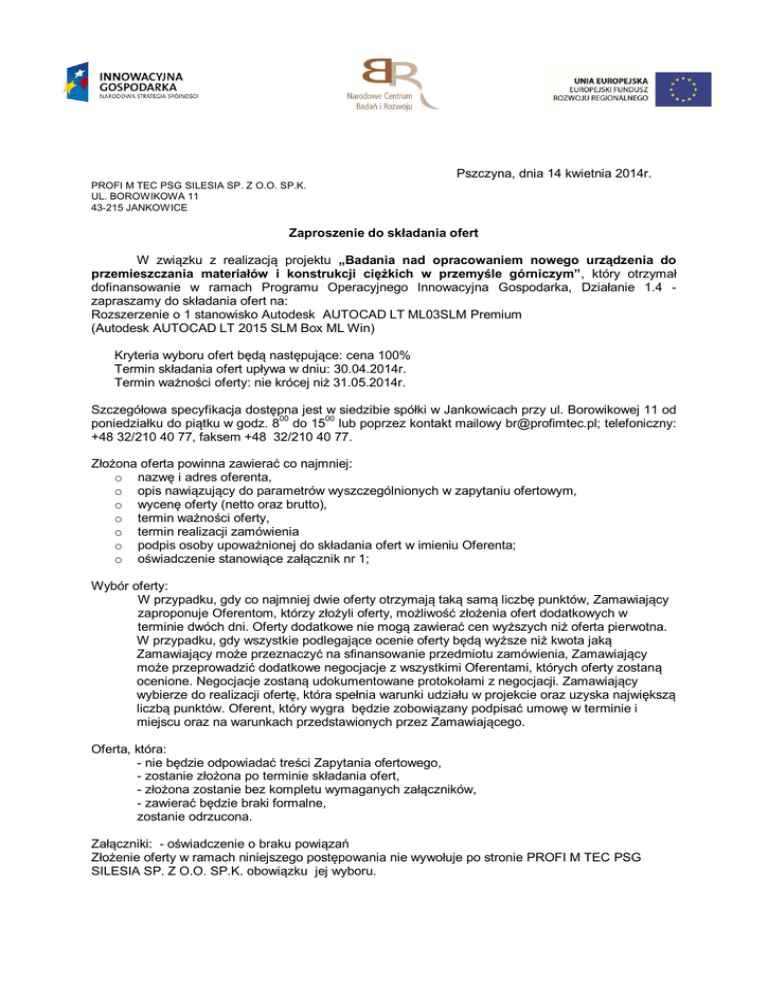 Pszczyna, dnia 14 kwietnia 2014r. PROFI M TEC PSG SILESIA SP. Z O.O. SP.K. UL. BOROWIKOWA 11 43-215 JANKOWICE Zaproszenie do składania ofert W związku z realizacją projektu „Badania nad opracowaniem nowego urządzenia do przemieszczania materiałów i konstrukcji ciężkich w przemyśle górniczym”, który otrzymał dofinansowanie w ramach Programu Operacyjnego Innowacyjna Gospodarka, Działanie 1.4 zapraszamy do składania ofert na: Rozszerzenie o 1 stanowisko Autodesk AUTOCAD LT ML03SLM Premium (Autodesk AUTOCAD LT 2015 SLM Box ML Win) Kryteria wyboru ofert będą następujące: cena 100% Termin składania ofert upływa w dniu: 30.04.2014r. Termin ważności oferty: nie krócej niż 31.05.2014r. Szczegółowa specyfikacja dostępna jest w siedzibie spółki w Jankowicach przy ul. Borowikowej 11 od poniedziałku do piątku w godz. 800 do 1500 lub poprzez kontakt mailowy [email protected]; telefoniczny: +48 32/210 40 77, faksem +48 32/210 40 77. Złożona oferta powinna zawierać co najmniej: o nazwę i adres oferenta, o opis nawiązujący do parametrów wyszczególnionych w zapytaniu ofertowym, o wycenę oferty (netto oraz brutto), o termin ważności oferty, o termin realizacji zamówienia o podpis osoby upoważnionej do składania ofert w imieniu Oferenta; o oświadczenie stanowiące załącznik nr 1; Wybór oferty: W przypadku, gdy co najmniej dwie oferty otrzymają taką samą liczbę punktów, Zamawiający zaproponuje Oferentom, którzy złożyli oferty, możliwość złożenia ofert dodatkowych w terminie dwóch dni. Oferty dodatkowe nie mogą zawierać cen wyższych niż oferta pierwotna. W przypadku, gdy wszystkie podlegające ocenie oferty będą wyższe niż kwota jaką Zamawiający może przeznaczyć na sfinansowanie przedmiotu zamówienia, Zamawiający może przeprowadzić dodatkowe negocjacje z wszystkimi Oferentami, których oferty zostaną ocenione. Negocjacje zostaną udokumentowane protokołami z negocjacji. Zamawiający wybierze do realizacji ofertę, która spełnia warunki udziału w projekcie oraz uzyska największą liczbą punktów. Oferent, który wygra będzie zobowiązany podpisać umowę w terminie i miejscu oraz na warunkach przedstawionych przez Zamawiającego. Oferta, która: - nie będzie odpowiadać treści Zapytania ofertowego, - zostanie złożona po terminie składania ofert, - złożona zostanie bez kompletu wymaganych załączników, - zawierać będzie braki formalne, zostanie odrzucona. Załączniki: - oświadczenie o braku powiązań Złożenie oferty w ramach niniejszego postępowania nie wywołuje po stronie PROFI M TEC PSG SILESIA SP. Z O.O. SP.K. obowiązku jej wyboru.