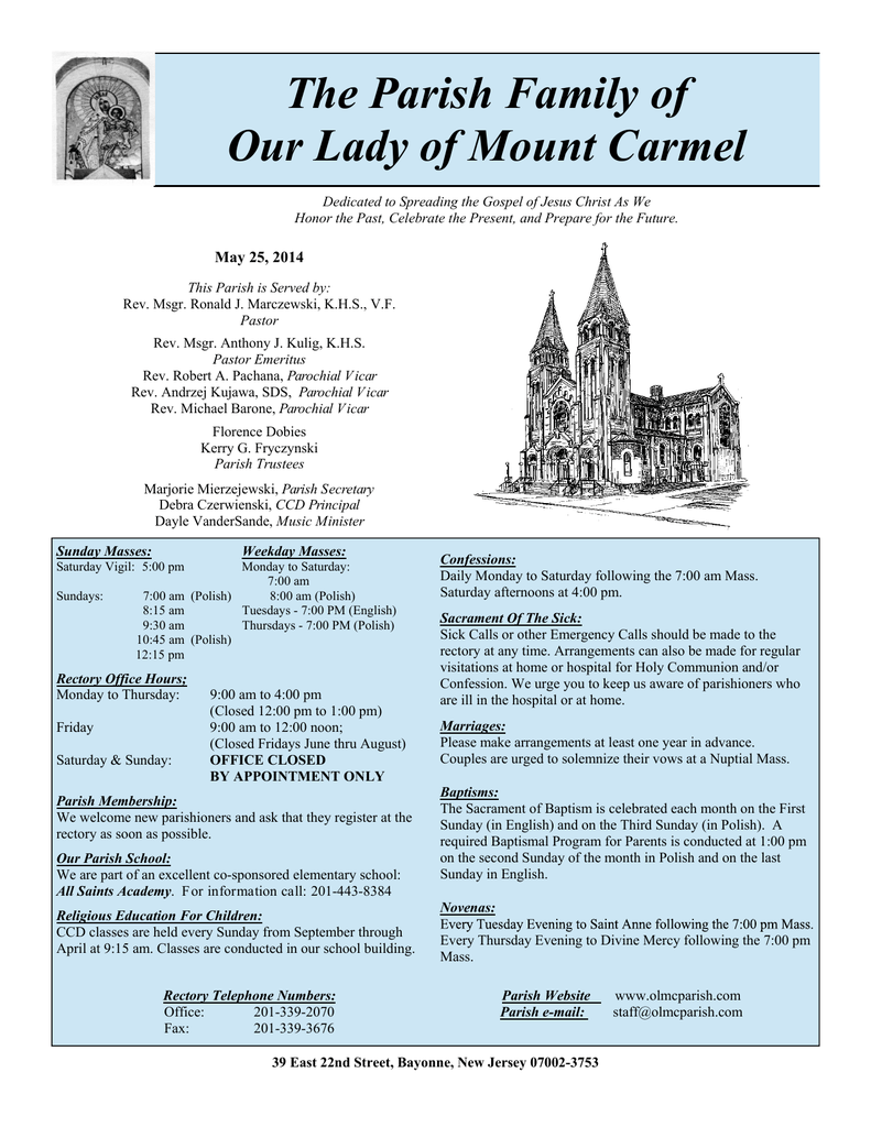 The Parish Family of Our Lady of Mount Carmel Dedicated to Spreading the Gospel of Jesus Christ As We Honor the Past, Celebrate the Present, and Prepare for the Future. May 25, 2014 This Parish is Served by: Rev. Msgr. Ronald J. Marczewski, K.H.S., V.F. Pastor Rev. Msgr. Anthony J. Kulig, K.H.S. Pastor Emeritus Rev. Robert A. Pachana, Parochial V icar Rev. Andrzej Kujawa, SDS, Parochial V icar Rev. Michael Barone, Parochial V icar Florence Dobies Kerry G. Fryczynski Parish Trustees Marjorie Mierzejewski, Parish Secretary Debra Czerwienski, CCD Principal Dayle VanderSande, Music Minister Sunday Masses: Weekday Masses: Saturday Vigil: 5:00 pm Sundays: Monday to Saturday: 7:00 am 7:00 am (Polish) 8:00 am (Polish) 8:15 am Tuesdays - 7:00 PM (English) 9:30 am Thursdays - 7:00 PM (Polish) 10:45 am (Polish) 12:15 pm Rectory Office Hours; Monday to Thursday: Friday Saturday & Sunday: 9:00 am to 4:00 pm (Closed 12:00 pm to 1:00 pm) 9:00 am to 12:00 noon; (Closed Fridays June thru August) OFFICE CLOSED BY APPOINTMENT ONLY Parish Membership: We welcome new parishioners and ask that they register at the rectory as soon as possible. Our Parish School: We are part of an excellent co-sponsored elementary school: All Saints Academy. F or information call: 201-443-8384 Religious Education For Children: CCD classes are held every Sunday from September through April at 9:15 am. Classes are conducted in our school building. Rectory Telephone Numbers: Office: 201-339-2070 Fax: 201-339-3676 Confessions: Daily Monday to Saturday following the 7:00 am Mass. Saturday afternoons at 4:00 pm. Sacrament Of The Sick: Sick Calls or other Emergency Calls should be made to the rectory at any time. Arrangements can also be made for regular visitations at home or hospital for Holy Communion and/or Confession. We urge you to keep us aware of parishioners who are ill in the hospital or at home. Marriages: Please make arrangements at least one year in advance. Couples are urged to solemnize their vows at a Nuptial Mass. Baptisms: The Sacrament of Baptism is celebrated each month on the First Sunday (in English) and on the Third Sunday (in Polish). A required Baptismal Program for Parents is conducted at 1:00 pm on the second Sunday of the month in Polish and on the last Sunday in English. Novenas: Every Thursday Evening to Divine Mercy following the 7:00 pm Mass. Parish Website Parish e-mail: 39 East 22nd Street, Bayonne, New Jersey 07002-3753 www.olmcparish.com [email protected] Sixth Sunday of Easter May 25, 2014 “I will ask the Father, and he will give you . . . the Spirit of truth.” — John 14:16–17 5:00 PM +Nellie Susek (Family) SUNDAY, May 25, 25014, NIEDZIELA 7:00 AM +Henryk Stasiorek (Irena & Bogdan Skrodzcy z rodziną) 8:15 AM - Msgr. Ronald Marczewski, 40th Ordination Anniversary (Claire & Steve) 9:30 AM - American Polish Veterans 10:45 AM +Raymond & Władysława Gromadzki & + +Krystyna & Stanley Zalewski (Robert Gromadzki Family) 12:15 PM +Regina Bonczyk (Margaret) MONDAY, May 26, 2014, PONIEDZIAŁEK 7:00 AM +Thomas M. Fienan (Czerwienski Family) 8:00 AM +Stephanie Kafarski (Lorraine Blicharz) TUESDAY, May 27, 2014, WTOREK 7:00 AM +Michael Rosciszewski (Dad) 8:00 AM +Bruno Olszewski (Niece, Margie Gunsiorowski) 7:00 PM +Vincent F. Downes (Steve & Claire) WEDNESDAY, May 28, 2014, ŚRODA 7:00 AM - Our Lady of Mt. Carmel (Edeline Belizaire) 8:00 AM +Dr. Edmund Orleanski & Family (Eleanor Dziedzic) 7:00 PM (Eng.) + Joseph Kolakowski (Son & Family) THURSDAY, May 29, 2014, CZWARTEK 7:00 AM +Zofia & Józef Szczesniak (syn z rodziną) 8:00 AM +Gertrude Zalubski (Barbara Godfrey) 12:00 PM (Eng.) +Gertrude Zalubski (Jim Gordon & Bart Brazinski) 7:00 PM +William A. Kmec (Karen & Joseph Makowski) FRIDAY, May 30, 2014, PIĄTEK 7:00 AM +Hedy Czajkowski (Lorraine, Joanne & Geri) 8:00 AM +Stephanie Kafarski (Edward Blicharz & Family) SATURDAY, May 31, 2014, SOBOTA 7:00 AM +Charlie Sgro, Jr. (A Friend) 8:00 AM +Marianna Huta (Gacki Family) 5:00 PM +Genevieve & Michael Uzdavines (Son & Family) SUNDAY, June 1, 2014, NIEDZIELA 7:00 AM +Józef Wieczorek (Grace Krukowski) 8:15 AM +Peter Josefowicz (Chris Durak & Family) 9:30 AM +Frank & Mary Jankowski (Family) 10:45 AM +Zofia & Aleksander Szarnecki (Family) 12:15 PM - ASCA Graduates (Parents) Spiritual Offerings May 25-31, 2014 CHURCH SANCTUARY LAMP Ordination Anniversary Blessings for Msgr. Ron (Altar Society) ALTAR BREAD & WINE +Charles Miros (Wife & Children) INFANT OF PRAGUE CANDLE Special Intention SACRED HEART CANDLE Special Intention for Jack (Aunt E.K.) DIVINE MERCY CANDLE Ordination Anniversary Blessings for Msgr. Ron (Marge) BLESSED MOTHER CANDLE Ordination Anniversary Blessings for Msgr. Ron (Pat Suckiel) O.L. OF CZESTOCHOWA CANDLE Blessings for Karen (Regina & Helen) ST. ANNE CANDLE +Gertrude Zalubski (Friends) ST. ANTHONY CANDLE Special Intention ST. FRANCIS CANDLE Special Intention of the Oranchak & Miskura Families ST. JOHN PAUL, II, POPE, CANDLE Ordination Anniversary Blessings for Msgr. Ron (St. John Paul II Society) ST. JOSEPH CANDLE +Joseph Dziedzic (Children) ST. JUDE CANDLE +Jean & Edward Wojtkowski (Son, John) ST. STANISLAUS CANDLE Health & Blessings for Msgr. Ron (Julie Smoktunowicz) ST. THÉRÈSE CANDLE Birthday Blessings for Jeanine Skowronski Our Grateful Tithe to God: May 18, 2014 Regular: $ 6,268.00 This Week Saturday-Sunday, May 24-25, 2014: Father’s Day Envelopes Monday, May 26, 2014: Memorial Day - Rectory Office Closed Tuesday, May 27, 2014: Mt. Carmel Seniors - 12:00 PM Cub Scouts - 7:00 PM Thursday, May 29, 2014: Holy Day of Obligation Ascension of the Lord Offering Boy Scouts - 7:30 PM Saturday-Sunday, May 31-June 1, 2014: Maintenance Collection Save the Date!! Sunday, July 13 The Youth group will be sponsoring a “Americana Picnic” Old fashioned American type picnic with simple foods and fun activities. Proceeds will help support our young people in attending the next World Youth Day. More details to follow. “It is the Veteran…” It 