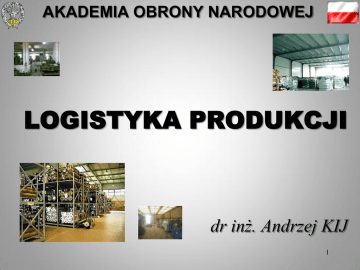 AKADEMIA OBRONY NARODOWEJ LOGISTYKA PRODUKCJI dr inż. Andrzej KIJ 1 AKADEMIA OBRONY NARODOWEJ KLIK 2 AKADEMIA OBRONY NARODOWEJ !12aon3s@ 3 AKADEMIA OBRONY NARODOWEJ Literatura podstawowa i uzupełniająca Lp. Autor, tytuł, wydawnictwo, strony 1. Fertsch M. Cyplik P. Hadaś Ł, Logistyka produkcji teoria i praktyka, ILiM, Poznań 2010. 2. (red.) Fertsch M., Logistyka produkcji, Instytut Logistyki i Magazynowania, Poznań 2010 3. Pasternak K., Zarys zarządzania produkcją, PWE, Warszawa 2005 4. Krawczyk S., Zarządzanie procesami logistycznymi, PWE, Warszawa 2001 5. Skowronek Cz., Sarjusz-Wolski Z., Logistyka w przedsiębiorstwie, PWE, Warszawa 2008 6. Ficoń K., Procesy logistyczne w przedsiębiorstwie, Impuls Plus Colsulting, Gdynia 2001 7. Dwiliński L., Zarys logistyki przedsiębiorstwa, Oficyna Wydawnicza Politechniki Warszawskiej, Warszawa 2006 8. (red.) Kosieradzka A., Podstawy zarządzania produkcją. Ćwiczenia, Oficyna Wydawnicza Politechniki Warszawskiej, Warszawa 2008 4 AKADEMIA OBRONY NARODOWEJ ZAKRES TEMATYCZNY PRZEDMIOTU Miejsce logistyki we współczesnym zarządzaniu produkcją Istota i zakres logistyki produkcji Istota funkcjonowania przedsiębiorstwa produkcyjnego Strategie logistyczne w przedsiębiorstwie produkcyjnym Analiza strategii produkcyjnych przedsiębiorstw Miejsce problemów logistycznych w strukturze organizacyjnej przedsiębiorstwa produkcyjnego Sterowanie przepływami produkcji w różnych typach produkcji Planowanie produkcji według cyklu produkcyjnego Modele przepływów produkcji Zasady i metody planowania potrzeb materiałowych Planowanie potrzeb materiałowych Sterowanie produkcją z wykorzystaniem kart kanban Współczesne wyzwania logistyki produkcji Zintegrowany system wspomagania produkcji CIM Reengineering w przedsiębiorstwach produkcyjnych WYKŁADY ĆWICZENIA 10 10 RAZEM SAMOKSZTAŁCENIE 10 30 5 AKADEMIA OBRONY NARODOWEJ Obróbka skrawaniem - toczenie 6 AKADEMIA OBRONY NARODOWEJ Obróbka skrawaniem - frezowanie 7 AKADEMIA OBRONY NARODOWEJ Odlewnictwo 8 AKADEMIA OBRONY NARODOWEJ Spawalnictwo 9 AKADEMIA OBRONY NARODOWEJ TOKARKI 10 AKADEMIA OBRONY NARODOWEJ CENTRUM OBRÓBCZE 11 AKADEMIA OBRONY NARODOWEJ GILOTYNA KRAWĘDZIARKA PRASA 12 AKADEMIA OBRONY NARODOWEJ PÓŁAUTOMAT SPAWALNICZY 13 AKADEMIA OBRONY NARODOWEJ PRACOWNIK PRZY OBRABIARCE NUMERYCZNEJ 14 AKADEMIA OBRONY NARODOWEJ TEMAT: Istota logistyki produkcji w przedsiębiorstwie 15 AKADEMIA OBRONY NARODOWEJ CEL MISJA WIZJA PRZEDSIĘBIORSTWA STRATEGIA PRZEDSIĘBIORSTWA STRATEGIA FINANSOWA Identyfikacja portfela Ocena portfela zleceń i inwestycji zleceń i inwestycji STRATEGIA MARKETINGOWA Identyfikacja programów Ocena programów marketingowych marketingowych STRATEGIA LOGISTYCZNA Identyfikacja systemów Ocena systemów logistycznych logistycznych STRATEGIA PRODUKCYJNA Identyfikacja technologii Ocena technologii16 produkcji produkcji AKADEMIA OBRONY NARODOWEJ DEFINIOWANIE PRZEDSIĘBIORSTWA Modele przedsiębiorstwa (I) 1. MODEL EKONOMICZNY (Teoria ekonomii) przedsiębiorstwo to byt ekonomiczny opisywany w kategoriach efektywności użycia zasobów - różnicy między efektami i nakładami różnice w podejściu do przedsiębiorstwa na gruncie poszczególnych kierunków i prądów w ekonomii - ekonomia klasyczna, ujęcie szumpeterowskie, (neo)instytucjonalne i in. 2. MODEL FINANSOWY(Analiza finansowa przedsiębiorstwa) przedsiębiorstwo to system zasobów przekształcanych w strumienie finansowe kapitał przedsiębiorstwa traktowany jest jako wartość, a nie jako zestaw materialnych czynników produkcji cel firmy - maksymalizacja jej wartości w dłuższym okresie czasu o określonej wartości, 17 AKADEMIA OBRONY NARODOWEJ DEFINIOWANIE PRZEDSIĘBIORSTWA Modele przedsiębiorstwa (II) 3. MODEL PRODUKCYJNY -Technologiczny (Nauki techniczne) • przedsiębiorstwo to układ techniczny przetwarzający energię i materię w produkt o założonych parametrach użytkowych • przedsiębiorstwo nie wytwarza wartości dodanej lecz musi najpierw wyprodukować dobra lub usługi 4. MODEL ORGANIZACYJNY (Organizacja i zarządzanie) • przedsiębiorstwo to jednostka zorganizowana - szczególny przypadek instytucji podlegającej zasadom racjonalnej organizacji • występują PROCESY DECYZYJNE - kluczowa przesłanka uznania modelu organizacyjnego za wiodący w formułowaniu interdyscyplinarnych podstaw nauki o przedsiębiorstwie 18 AKADEMIA OBRONY NARODOWEJ DEFINIOWANIE PRZEDSIĘBIORSTWA Modele przedsiębiorstwa (III) 5. MODEL CYBERNETYCZNY (Cybernetyka, logistyka) • przedsiębiorstwo to układ złożony, podobny do żywego organizmu, kierujący się kryterium najdłuższego zachowania przy życiu • traktowane jako system względnie odosobniony w otoczeniu, posiadający szereg wewnętrznych, oddziaływujących na siebie podsystemów 6. MODEL SOCJOPSYCHOLOGICZNY - Behawioralny (Socjologia, psychologia) • przedsiębiorstwo to system społeczny - jednostki, grupy, ich zachowania, motywacje, wzajemne relacje itp. • głównym aktywem przedsiębiorstwa są LUDZIE 19 AKADEMIA OBRONY NARODOWEJ DEFINIOWANIE PRZEDSIĘBIORSTWA Modele przedsiębiorstwa (IV) 7. MODEL PRAWNY (Prawo cywilne, prawo handlowe) • przedsiębiorstwo to szczególny podmiot praw i obowiązków • forma i ustrój przedsiębiorstwa są zawsze określone w danym systemie prawnym 8. MODEL (ASPEKT) ETYCZNY (Etyka biznesu, socjologia kultury) • analiza zachowań w przedsiębiorstwie pod kątem obowiązujących w społeczeństwie norm moralnych i wzorców akceptowanych zachowań 20 AKADEMIA OBRONY NARODOWEJ PRODUKCJA-definicja • Jest to użytkowanie różnego rodzaju surowców, materiałów, wyposażenia technicznego oraz usług dla wytwarzania produktów zaspakajających potrzeby i wymagania nabywców. [1] • Koncepcja produkcji (w orientacji przedsiębiorstwa na rynek) jest jedną z najstarszych. Według tej koncepcji konsumenci będą faworyzować te produkty, które są szeroko dostępne i mają niską cenę. Kierownicy organizacji zo