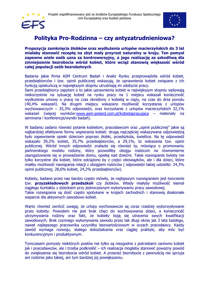 Projekt współfinansowany jest ze środków Europejskiego Funduszu Społecznego Unii Europejskiej oraz budŜet państwa Polityka Pro-Rodzinna – czy antyzatrudnieniowa? Propozycja zamknięcia Ŝłobków oraz wydłuŜenia urlopów macierzyńskich do 3 lat miałaby stanowić receptę na zbyt mały przyrost naturalny w kraju. Ten pomysł zapewne wiele osób uzna za kontrowersyjny, a jego realizację za szkodliwą dla zmniejszenie bezrobocia wśród kobiet, które wciąŜ stanowią większość wśród całej populacji osób bezrobotnych. Badania jakie firma ASM Centrum Badań i Analiz Rynku przeprowadziła wśród kobiet, przedsiębiorców i tzw. opinii publicznej wskazują, Ŝe uprawnienia kobiet związane z ich funkcją opiekuńczą w największym stopniu utrudniają im zdobycie pracy. Sami przedsiębiorcy zapytani o to jakie uprawnienia kobiet w największym stopniu wpływają niekorzystnie na sytuację kobiet na rynku pracy na 1 miejscu wskazali konieczność wydłuŜenia umowy o pracę na czas określony z kobietą w ciąŜy, na czas do dnia porodu (40,4% wskazań). Na drugim miejscu wskazano moŜliwość korzystania z urlopów wychowawczych – 35,3% odpowiedzi, oraz korzystanie z urlopów macierzyńskich 32,1% wskazań (więcej wyników:www.asm-poland.com.pl/kobietapracujaca – materiały na seminaria i konferencje/wyniki badań). W badaniu zadano równieŜ pytanie kobietom, pracodawcom oraz „opinii publicznej” jakie są najbardziej efektywne formy wspierania kobiet: drugą najczęściej wskazywana odpowiedzią było zapewnienie opieki dzieciom poprzez Ŝłobki, przedszkola, świetlice. Na tę odpowiedź wskazało 39,2% kobiet, 35,7% przedsiębiorców, a 29,1%, to wskazania tzw. opinii publicznej. Wśród innych odpowiedzi znalazła się równieŜ ta, mówiąca o promowaniu partnerskiego modelu rodziny, który pozwoliłby obojgu rodzicom na równomierne zaangaŜowanie się w prowadzenie domu, opiekę nad dziećmi. Takie rozwiązanie byłoby nie tylko korzystne dla kobiet, które odciąŜono by z części obowiązków, ale i dla dzieci, które miałby moŜliwość nawiązania relacji z obojgiem rodziców ( odpowiedzi takiej udzieliło: 24,3% opinii publicznej; 28,6% kobiet, 24,2% przedsiębiorców). Kobiety, badane przez nas bardzo często mówiły, Ŝe najlepszym rozwiązaniem jest tworzenie tzw. przyzakładowych przedszkoli czy Ŝłobków. Wtedy miałyby moŜliwość niemal ciągłego kontaktu z dzieckiem przy jednoczesnym wykonywaniu pracy zawodowej. Takie rozwiązania są dość często spotykane w krajach zachodnich i stanowią doskonałe wsparcie dla aktywnych zawodowo kobiet. Warto równieŜ zwrócić uwagę, Ŝe urlopy wychowawcze są coraz rzadziej wykorzystywane przez kobiety. Powodem nie jest brak chęci do wychowywania dzieci, a konieczność utrzymywania rodziny oraz fakt, Ŝe kobiety boją się utracenia swych kwalifikacji zawodowych. Brak czynnego wykonywania zawodu przez tak długi okres jak 3 lata kaŜdego, nawet najlepszego pracownika uczyniłby bezwartościowym w oczach pracodawcy. KaŜdy zawód wymaga rozwoju, stałego dokształcania oraz ciągłej praktyki, aby móc być konkurencyjnym i produktywnym. Tymczasem pomysły niektórych posłów nie tylko są niezgodne z potrzebami zarówno kobiet jak i pracodawców, ale i trzeba podkreślić – ich realizacja mogłaby stanowić powaŜny powód do zwiększenia się bezrobocia wśród kobiet. A przecieŜ bezrobocie z pewnością nie sprzyja ani rodzinie jako takiej, ani tym bardziej jej powiększaniu. Projekt współfinansowany jest ze środków Europejskiego Funduszu Społecznego Unii Europejskiej oraz budŜet państwa Badania sytuacji kobiet na rynku pracy przeprowadzone zostały przez ASM Centrum Badań i Analiz Rynku w ramach projektu System Aktywizacji Zawodowej Kobiet - „Kobieta Pracująca…”, który współfinansowany jest ze środków Europejskiego Funduszu Społecznego Unii Europejskiej. W ogólnopolskim badaniu wzięło udział: 1850 kobiet; 1619 pracodawców, 1200 reprezentantów opinii publicznej. Badania zostały pogłębione o regionalne badania (łódzkie, pomorskie, wielkopolskie, małopolskie) kobiet i przedsiębiorców przeprowadzone metodą FGI w 20 dziesięcioosobowych grupach. Źródło: ASM Centrum Badań i Analiz Rynku Sp. z o.o. Kontakt: Agnieszka Majsiej, tel. 024 355 77 32 e-mail: [email protected]
