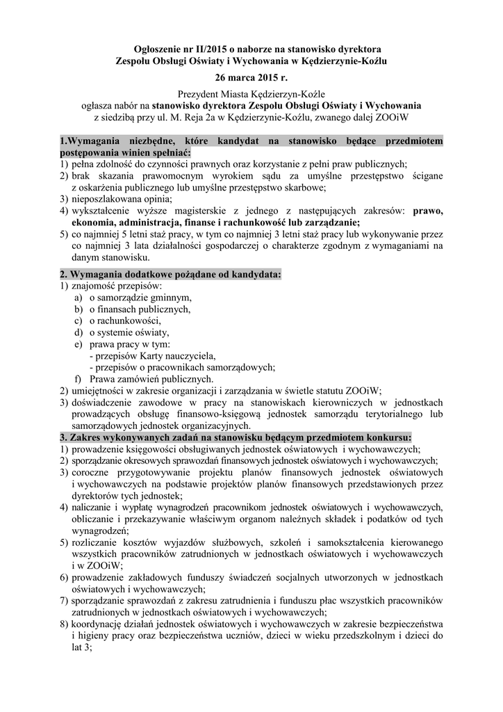 Ogłoszenie nr II/2015 o naborze na stanowisko dyrektora Zespołu Obsługi Oświaty i Wychowania w Kędzierzynie-Koźlu 26 marca 2015 r. Prezydent Miasta Kędzierzyn-Koźle ogłasza nabór na stanowisko dyrektora Zespołu Obsługi Oświaty i Wychowania z siedzibą przy ul. M. Reja 2a w Kędzierzynie-Koźlu, zwanego dalej ZOOiW 1.Wymagania niezbędne, które kandydat na stanowisko będące przedmiotem postępowania winien spełniać: 1) pełna zdolność do czynności prawnych oraz korzystanie z pełni praw publicznych; 2) brak skazania prawomocnym wyrokiem sądu za umyślne przestępstwo ścigane z oskarżenia publicznego lub umyślne przestępstwo skarbowe; 3) nieposzlakowana opinia; 4) wykształcenie wyższe magisterskie z jednego z następujących zakresów: prawo, ekonomia, administracja, finanse i rachunkowość lub zarządzanie; 5) co najmniej 5 letni staż pracy, w tym co najmniej 3 letni staż pracy lub wykonywanie przez co najmniej 3 lata działalności gospodarczej o charakterze zgodnym z wymaganiami na danym stanowisku. 2. Wymagania dodatkowe pożądane od kandydata: 1) znajomość przepisów: a) o samorządzie gminnym, b) o finansach publicznych, c) o rachunkowości, d) o systemie oświaty, e) prawa pracy w tym: - przepisów Karty nauczyciela, - przepisów o pracownikach samorządowych; f) Prawa zamówień publicznych. 2) umiejętności w zakresie organizacji i zarządzania w świetle statutu ZOOiW; 3) doświadczenie zawodowe w pracy na stanowiskach kierowniczych w jednostkach prowadzących obsługę finansowo-księgową jednostek samorządu terytorialnego lub samorządowych jednostek organizacyjnych. 3. Zakres wykonywanych zadań na stanowisku będącym przedmiotem konkursu: 1) prowadzenie księgowości obsługiwanych jednostek oświatowych i wychowawczych; 2) sporządzanie okresowych sprawozdań finansowych jednostek oświatowych i wychowawczych; 3) coroczne przygotowywanie projektu planów finansowych jednostek oświatowych i wychowawczych na podstawie projektów planów finansowych przedstawionych przez dyrektorów tych jednostek; 4) naliczanie i wypłatę wynagrodzeń pracownikom jednostek oświatowych i wychowawczych, obliczanie i przekazywanie właściwym organom należnych składek i podatków od tych wynagrodzeń; 5) rozliczanie kosztów wyjazdów służbowych, szkoleń i samokształcenia kierowanego wszystkich pracowników zatrudnionych w jednostkach oświatowych i wychowawczych i w ZOOiW; 6) prowadzenie zakładowych funduszy świadczeń socjalnych utworzonych w jednostkach oświatowych i wychowawczych; 7) sporządzanie sprawozdań z zakresu zatrudnienia i funduszu płac wszystkich pracowników zatrudnionych w jednostkach oświatowych i wychowawczych; 8) koordynację działań jednostek oświatowych i wychowawczych w zakresie bezpieczeństwa i higieny pracy oraz bezpieczeństwa uczniów, dzieci w wieku przedszkolnym i dzieci do lat 3; 9) koordynację działań jednostek oświatowych i wychowawczych w zakresie gospodarowania powierzonym im mieniem gminnym, w tym działań w zakresie: a) utrzymania budynków powierzonych tym jednostkom, w tym inwestycji, remontów i przeglądów technicznych, b) bezpieczeństwa przeciwpożarowego; 10) koordynację działań jednostek oświatowych i wychowawczych w zakresie postępowań o udzielenie wspólnych zamówień publicznych, w tym gromadzenie i opracowywanie danych niezbędnych do sporządzenia specyfikacji istotnych warunków zamówienia; 11) udzielanie pomocy prawnej i organizacyjnej dyrektorom jednostek oświatowych i wychowawczych. 4. Informacja o warunkach pracy na stanowisku będącym przedmiotem postępowania: 1) miejsce pracy: Zespół Obsługi Oświaty i Wychowania w Kędzierzynie-Koźlu; 2) obowiązująca norma czasu pracy wynosi 8 godziny na dobę i 40 godzin na tydzień w miesięcznym okresie rozliczeniowym; 3) zastrzega się wolę zatrudnienia wybranego kandydata na okres próbny nie przekraczający 3 miesięcy w celu praktycznego sprawdzenia umiejętności i doświadczenia zawodowego pracownika; 4) jeżeli wybrany kandydat podejmie po raz pierwszy pracę na stanowisku urzędniczym, zostanie skierowany do służby przygotowawczej kończącej się egzaminem; na umotywowany wniosek osoby kierującej komórką organizacyjną, Prezydent Miasta może zwolnić wybranego kandydata z obowiązku odbywania służby przygotowawczej, z zastrzeżeniem konieczności poddania takiego kandydata egzaminowi. 5. Dokumenty wymagane w ofertach pracy składanych przez kandydatów: 1) życiorys zawodowy zawierający wykaz wszystkich dotychczasowych miejsc pracy kandydata z wyszczególnieniem stażu pracy w tych miejscach oraz przebieg nauki z wyszczególnieniem wszystkich ukończonych szkół i uczelni; 2) list motywacyjny; 3) kopia lub odpis dokumentów potwierdzających: a) wykształcenie (dyplom ukończenia szkoły wyższej), b) staż pracy (np. świadectw pracy), c) posiadane kwalifikacje i umiejętności (dyplomów, zaświadczeń itp.), d) niepełnosprawność, w przypadku kandydatów, którzy zamierzają skorzystać z uprawnienia do pierwszeństwa do zatrudnienia na stanowiskach urzędniczych, z wyłączeniem kierowniczych stanowisk urzędniczych; 4) oświadczenie o niekaralności za umyślne przestępstwa ścigane z oskarżenia publicznego lub umyślne przestępstwa skarbowe (wybrany kandydat zobowiązany będzie do przedłożenia zaświadczenia o niekaralności wydanego przez Krajowy Rejestr Karny); 5) oświadczenie o posiadaniu przez kandydata pełni praw publicznych. pobierz druk oświadczeń » Załączone: list motywacyjny i życiorys powinny być opatrzone następującą klauzulą: „Wyrażam zgodę na: 1) przetwarzanie moich danych osobowych zawartych w ofercie pracy, 2) przeprowadzenie wywiadu środowiskowego w dotychczasowych miejscach mojej pracy i nauki w celu potwierdzenia spełniania warunku posiadania przeze mnie nieposzlakowanej opinii, dla potrzeb procesu naboru na stanowisko Dyrektora Zespołu Obsługi Oświaty 