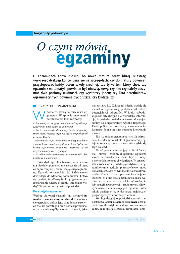 horyzonty polonistyki O czym mówià egzaminy O egzaminach znów g∏oÊno, bo nowa matura coraz bli˝ej. Niestety, wi´kszoÊç dyskusji koncentruje si´ na szczegó∏ach: czy do matury powinien przyst´powaç ka˝dy uczeƒ szko∏y Êredniej, czy tylko ten, który chce; czy egzamin z matematyki powinien byç obowiàzkowy, czy nie; czy nale˝y utrzymaç dwa poziomy trudnoÊci, czy wystarczy jeden; czy lista przedmiotów egzaminacyjnych powinna byç d∏u˝sza, czy krótsza itd. n KRZYSZTOF KONARZEWSKI W powietrzu krà˝à najrozmaitsze argumenty. W sprawie matematyki pods∏ucha∏em takà rozmow´: – Matematyka to j´zyk wspó∏czesnej cywilizacji. Ka˝dy musi udowodniç, ˝e go posiad∏. – Kucie matematyki do matury to dla humanisty strata czasu. Przecie˝ nigdy nie b´dzie si´ pos∏ugiwa∏ wzorami Viete’a. – Matematyka to po j´zyku polskim drugi przedmiot o najwi´kszym przydziale godzin. JeÊli nie b´dzie ob∏o˝ony egzaminem, uczniowie przestanà si´ go uczyç, a nauczyciele – wymagaç. – W takim razie powinniÊmy te˝ wprowadziç obowiàzkowà matur´ z wf. Takie dyskusje, choç barwne, Êwiat∏a wnoszà niewiele, poniewa˝ nie zaczynajà od tego, co najwa˝niejsze – czemu majà s∏u˝yç egzaminy. Egzamin to narz´dzie i jak ka˝de narz´dzie odsy∏a do w∏aÊciwej sobie funkcji. ¸atwo si´ zgodziç, ˝e g∏ównà funkcjà egzaminu jest dostarczanie wiedzy o uczniu. Ale jakiej wiedzy? W gr´ wchodzà dwie odpowiedzi. Dwa poj´cia egzaminu Wed∏ug pierwszej egzamin ma stworzyç inwentarz zasobów umys∏u i charakteru ucznia, wyczerpujàco opisaç jego silne i s∏abe strony – co wie, ile potrafi, jak radzi sobie z problemami, czy umie wspó∏pracowaç z innymi, jakie 4 324 ma postawy itd. Zakres tej wiedzy wydaje si´ niemal nieograniczony, podobnie jak zakres potencjalnych adresatów. W kraju rozbudowujàcym si∏y zbrojne nie zdziwi∏aby informacja, ˝e posiadacz Êwiadectwa maturalnego jest zdolny do d∏ugotrwa∏ego wysi∏ku fizycznego. Partie polityczne powita∏yby z uznaniem informacj´, ˝e ma on silnà potrzeb´ kierowania innymi. Tak rozumiany egzamin odrywa si´ od procesu kszta∏cenia w szkole. Egzaminatorzy pytajà ucznia, czy umie to a to, a nie – gdzie si´ tego nauczy∏. Uczeƒ powiada, ˝e zna j´zyk chiƒski. Âwietnie – mówià – zrobimy ci egzamin i wpiszemy wynik na Êwiadectwie. JeÊli b´dzie dobry, z pewnoÊcià pomo˝e ci w karierze. W ten sposób szko∏a staje si´ instytucjà certyfikacji, a egzaminowanie zyskuje pierwszeƒstwo przed kszta∏ceniem. Stoi za tym ideologia oÊwiatowa, wedle której szko∏a jest pierwszà instytucjà selekcyjnà. Ma ona dzieliç uczniowskà mas´ wed∏ug przydatnoÊci do dalszych form kszta∏cenia lub pozycji zawodowych i spo∏ecznych. G∏ównym narz´dziem selekcji jest egzamin, tote˝ szko∏a zabiega o to, by dostarcza∏ najbardziej prognostycznych informacji o uczniu. Wed∏ug drugiej odpowiedzi egzamin ma dostarczyç opisu osiàgni´ç szkolnych ucznia, czyli tego, ile wzià∏ on z ca∏ego procesu kszta∏cenia. Taki opis jest cz´Êcià inwentarza, ogra- polonistyka Panto horyzonty polonistyki ciech Ma∏ecki obiecywa∏ stworzenie totalnego niczonà jednak do treÊci programu szkolnego. certyfikatu jakoÊci absolwenta. Nowe ÊwiaEgzaminator powiada: uczyliÊmy ci´ tego a tedectwo mia∏o informowaç nie tylko o przego; teraz zobaczymy, ile zdo∏a∏eÊ sobie z tego sz∏ych osiàgni´ciach posiadacza, ale i o jego przyswoiç. Znasz chiƒski? To nas nie interesumo˝liwoÊciach na przysz∏oÊç, i dzi´ki temu je, bo chiƒskiego nie by∏o w programie. Czego staç si´ „przepustkà” do mniej lub bardziej nie uczyliÊmy, tego nie wymagamy. Za tym staatrakcyjnych pozycji spo∏ecznych. nowiskiem stoi ideologia transmisji kulturoPrace zespo∏u wkrótce utkn´∏y w martwym wej. Wedle niej szko∏a ma wprowadziç w kulpunkcie, poniewa˝ resort ca∏à uwag´ skupi∏ na tur´, czyli ucywilizowaç, dziki lud. Najlepiej egzaminach na ni˝szych szczeblach kszta∏cewszystkich w maksymalnym stopniu. Zró˝ninia. Kontekst tych wysi∏ków jest dobrze znany. cowanie uczniów uwa˝a si´ za niepo˝àdane, Reforma z 1999 r. da∏a nauczycielom swobod´ choçby nawet mia∏o byç nieuniknione. doboru programów i podr´czników szkolnych. Wybór, przed którym stoi ka˝dy konstrukTo pociàga∏o za sobà rozluênienie kontroli nad tor egzaminu, wydaje si´ fundamentalny. Miprocesem kszta∏cenia. Postanowiono je skommo to niewiele mówi o nim literatura pedagopensowaç zaostrzeniem kontroli wyników. giczna. Najbli˝szy idei opisu osiàgni´ç szkolW tym celu w 2000 r. powo∏ano nych wydaje si´ ruch na rzecz pomiaru odniepaƒstwowe komisje egzaminacyjsionego do kryterium (Bolene – centralnà i osiem okr´gos∏aw Niemierko nazywa go tradycji e ci un gr a N wych. Ich g∏ównym zadaniem by∏o sprawdzajàcym). Kryterium in przeprowadzanie powszechnych wià˝àcej egzam wykonania zadaƒ egzaminacyji obowiàzkowych egzaminów tez programem nych musi byç wyprowadzone olity stowych przy koƒcu szko∏y podz programu kszta∏cenia, tote˝ kszta∏cenia jedn y stawowej i gimnazjum. Na grunwynik egzaminu daje si´ zinteregzamin testow cie ideologii „wi´cej wolnoÊci pretowaç jako odsetek udost´ppozostaje i odpowiedzialnoÊci” ten ruch nionych uczniowi treÊci, które w oczywistej ci wydawa∏ si´ s∏uszny. Ale praktyoÊ znalaz∏y si´ w jego g∏owie. sprzeczn ka rysowa∏a si´ mgliÊcie. em m W Polsce Ludowej generaliz z plural . Rzecz w tym, ˝e na gruncie ym nie obowiàzywa∏o poj´cie egzaow program tradycji wià˝àcej egzamin minu jako opisu osiàgni´ç szkolz programem kszta∏cenia jednych. Egzamin koƒcowy (matunolity egzamin testowy pozostaje w oczywistej ra) i egzaminy wst´pne (do szko∏y Êredniej sprzecznoÊci z pluralizmem programowym. i wy˝szej) nie mog∏y ani na jot´ wykraczaç poJeÊli w ka˝dym oddziale klasowym uczniowie za program nauc