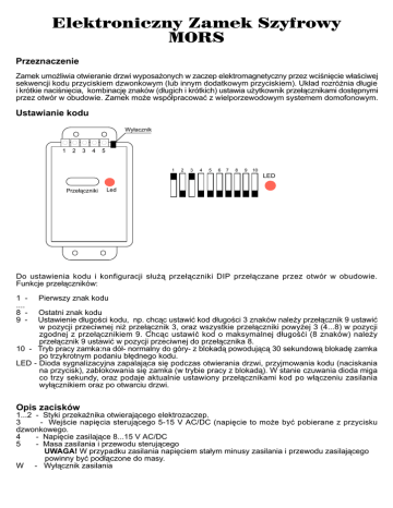 Elektroniczny Zamek Szyfrowy MORS Przeznaczenie Zamek umo¿liwia otwieranie drzwi wyposa¿onych w zaczep elektromagnetyczny przez wciniêcie w³aciwej sekwencji kodu przyciskiem dzwonkowym (lub innym dodatkowym przyciskiem). Uk³ad rozró¿nia d³ugie i krótkie naciniêcia, kombinacjê znaków (d³ugich i krótkich) ustawia u¿ytkownik prze³¹cznikami dostêpnymi przez otwór w obudowie. Zamek mo¿e wspó³pracowaæ z wielporzewodowym systemem domofonowym. Ustawianie kodu Wy³acznik 1 2 3 4 5 1 Prze³¹czniki 2 3 4 5 6 7 8 9 10 LED Led Do ustawienia kodu i konfiguracji s³u¿¹ prze³¹czniki DIP prze³¹czane przez otwór w obudowie. Funkcje prze³¹czników: 1 .... 8 9 - Pierwszy znak kodu Ostatni znak kodu Ustawienie d³ugoci kodu, np. chc¹c ustawiæ kod d³ugoci 3 znaków nale¿y prze³¹cznik 9 ustawiæ w pozycji przeciwnej ni¿ prze³¹cznik 3, oraz wszystkie prze³¹czniki powy¿ej 3 (4...8) w pozycji zgodnej z prze³¹cznikiem 9. Chc¹c ustawiæ kod o maksymalnej d³ugoæi (8 znaków) nale¿y prze³¹cznik 9 ustawiæ w pozycji przeciwnej do prze³¹cznika 8. 10 - Tryb pracy zamka:na dó³- normalny do góry- z blokad¹ powoduj¹c¹ 30 sekundow¹ blokadê zamka po trzykrotnym podaniu b³êdnego kodu. LED - Dioda sygnalizacyjna zapalaj¹ca siê podczas otwierania drzwi, przyjmowania kodu (naciskania na przycisk), zablokowania siê zamka (w trybie pracy z blokad¹). W stanie czuwania dioda miga co trzy sekundy, oraz podaje aktualnie ustawiony prze³¹cznikami kod po w³¹czeniu zasilania wy³¹cznikiem oraz po otwarciu drzwi. Opis zacisków 1...2 - Styki przekanika otwieraj¹cego elektrozaczep. 3 - Wejcie napiêcia steruj¹cego 5-15 V AC/DC (napiêcie to mo¿e byæ pobierane z przycisku dzwonkowego. 4 - Napiêcie zasilaj¹ce 8...15 V AC/DC 5 - Masa zasilania i przewodu steruj¹cego UWAGA! W przypadku zasilania napiêciem sta³ym minusy zasilania i przewodu zasilaj¹cego powinny byæ pod³¹czone do masy. W - Wy³¹cznik zasilania Sposób pod³¹czenia PRZEKANIK 1 2 STEROWANIE 3 ZASILANIE + MORS 4 MASA 5 w RYS 1. Sposób pod³¹czenia dowolnego urz¹dzenia do styków przekanika zamka szyfrowego MORS UNIFON LF-3 LX-3 LT-3 LR-3 1 1 3 3 TR MORS UNIFON LF-3 LX-3 LT-3 LR-3 1 1 3 3 7 ~220 V S1 S2 4 a MORS ~220 V V Vs Modu³ MS-1 TR b S1 S2 4 V Vs Modu³ MS-1 RYS 2. Sposób pod³¹czenia do unifonu pracuj¹cego w instalacji domofonowej w systemie 5+n (rys. a) i 6+n (rys. b) UNIFON LF-3 LX-3 LT-3 LR-3 1 1 3 3 MORS 1.2 Kaseta rozmówna LASKOMEX 1.0 1.1 1.0 4 V Kaseta elektroniki LASKOMEX RYS 3. Sposób pod³¹czenia zamka szyfrowego MORS do instalacji domofonowej z kaset¹ LASKOMEX Jako przycisk kluczuj¹cy wykorzystany zosta³ przycisk w kasecie rozmównej. Mo¿liwe s¹ dwa warianty wykorzystanie przycisku: sygnalizacj¹, lub bez sygnalizacji w unifonie. Wykonuj¹c po³¹czenie takie jak z zaciskiem 1.1 w kasecie rozmównej podanie kodu bêdzie sygnalizowane w unifonie (sygnalizowane jest ka¿de wciniêcie przycisku wywo³ania). Wykonuj¹c po³¹czenie takie jak z zaciskiem 1.2 wprowadzanie kodu nie bêdzie sygnalizowane. UWAGA! W instalacji domofonowej zaciski 1.1 i 1.2 mog¹ byæ wykorzystane. Kluczowanie mo¿na wtedy zrealizowaæ na dowolnym, nie wykorzystanym zacisku 1.n. ul. Nowa 20, 90-031 £ód, tel. (0-42) 672 44 00, fax 672 44 45 e-mail: [email protected], http://www.laskomex.com.pl