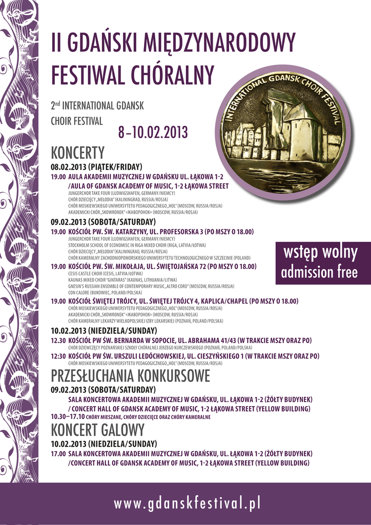 II GDAŃSKI MIĘDZYNARODOWY FESTIWAL CHÓRALNY 2nd INTERNATIONAL GDANSK CHOIR FESTIVAL koncerty 8–10.02.2013 08.02.2013 (Piątek/Friday) 19.00AULA AKADEMII MUZYCZNEJ w GDAŃSKU ul. Łąkowa 1-2 / Aula of Gdansk Academy of Music, 1-2 Łąkowa Street JungerChor Take Four (Ludwigshafen, Germany / Niemcy) Chór dziecięcy „Melodia” (Kaliningrad, Russia / Rosja) Сhór Moskiewskiego Uniwersytetu Pedagogicznego „Hol” (Moscow, Russia / Rosja) Akademicki chór „Skowronek” «Жаворонок» (Moscow, Russia / Rosja) 09.02.2013 (Sobota / Saturday) 19.00Kościół pw. Św. Katarzyny, ul. Profesorska 3 (po Mszy o 18.00) JungerChor Take Four (Ludwigshafen, Germany / Niemcy) Stockholm School of Economisc in Riga Mixed Choir (Riga, Latvia / Łotwa) Chór dziecięcy „Melodia”(Kaliningrad, Russia / Rosja) Chór Kameralny Zachodniopomorskiego Uniwersytetu Technologicznego w Szczecinie (Poland) 19.00Kościół pw. Św. Mikołaja, ul. Świętojańska 72 (po Mszy o 18.00) Cesis Castle Choir (Cesis, Latvia / Łotwa) Kaunas mixed choir “Gintaras” (Kaunas, Lithuania / Litwa) Gnesin’s Russian Ensemble of contemporary music „Altro coro” (Moscow, Russia / Rosja) Con Calore (Bukowiec, Poland / Polska) wstęp wolny admission free 19.00Kościół Świętej Trójcy, ul. Świętej Trójcy 4, Kaplica / Chapel (po Mszy o 18.00) Сhór Moskiewskiego Uniwersytetu Pedagogicznego „Hol” (Moscow, Russia / Rosja) Akademicki chór „Skowronek” «Жаворонок» (Moscow, Russia / Rosja) Chór Kameralny Lekarzy Wielkopolskiej Izby Lekarskiej (Poznań, Poland / Polska) 10.02.2013 (Niedziela / Sunday) 12.30Kościół pw Św. Bernarda w Sopocie, ul. Abrahama 41/43 (w trakcie Mszy oraz po) Chór Dziewczęcy Poznańskiej Szkoły Chóralnej Jerzego Kurczewskiego (Poznań, Poland / Polska) 12:30Kościół pw Św. Urszuli Ledóchowskiej, ul. Cieszyńskiego 1 (w trakcie Mszy oraz po) Chór Moskiewskiego Uniwersytetu Pedagogicznego „Hol” (Moscow, Russia / Rosja) przesłuchania konkursowe 09.02.2013 (Sobota / Saturday) SALA KONCERTOWA AKADEMII MUZYCZNEJ w Gdańsku, ul. Łąkowa 1-2 (żółty budynek) / Concert Hall of Gdansk Academy of Music, 1-2 Łąkowa Street (yellow building) 10.30–17.10 chóry mieszane, chóry dziecięce oraz chóry kameralne koncert galowy 10.02.2013 (Niedziela / Sunday) 17.00 SALA KONCERTOWA AKADEMII MUZYCZNEJ w Gdańsku, ul. Łąkowa 1-2 (żółty budynek) / Concert Hall of Gdansk Academy of Music, 1-2 Łąkowa Street (yellow building) w w w. g d a n s k f e s t i v a l . p l