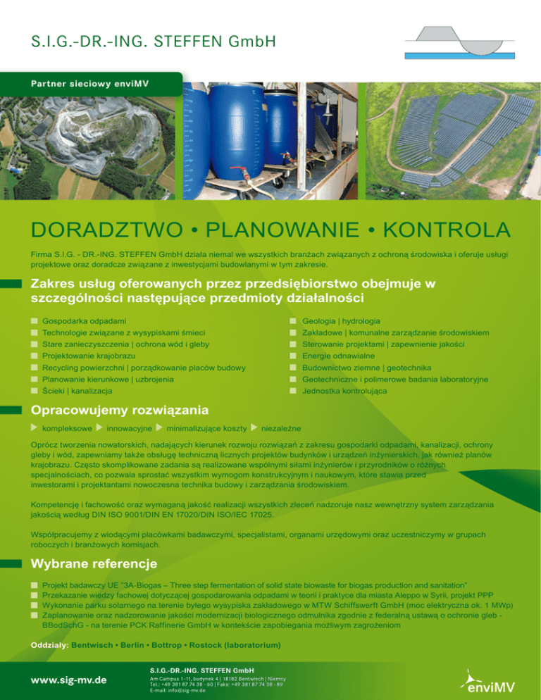 S.I.G.-DR.-ING. STEFFEN GmbH Partner sieciowy enviMV DORADZTWO • PLANOWANIE • KONTROLA Firma S.I.G. - DR.-ING. STEFFEN GmbH działa niemal we wszystkich branżach związanych z ochroną środowiska i oferuje usługi projektowe oraz doradcze związane z inwestycjami budowlanymi w tym zakresie. Zakres usług oferowanych przez przedsiębiorstwo obejmuje w szczególności następujące przedmioty działalności Gospodarka odpadami Geologia | hydrologia Technologie związane z wysypiskami śmieci Zakładowe | komunalne zarządzanie środowiskiem Stare zanieczyszczenia | ochrona wód i gleby Sterowanie projektami | zapewnienie jakości Projektowanie krajobrazu Energie odnawialne Recycling powierzchni | porządkowanie placów budowy Budownictwo ziemne | geotechnika Planowanie kierunkowe | uzbrojenia Geotechniczne i polimerowe badania laboratoryjne Ścieki | kanalizacja Jednostka kontrolująca Opracowujemy rozwiązania kompleksowe innowacyjne minimalizujące koszty niezależne Oprócz tworzenia nowatorskich, nadających kierunek rozwoju rozwiązań z zakresu gospodarki odpadami, kanalizacji, ochrony gleby i wód, zapewniamy także obsługę techniczną licznych projektów budynków i urządzeń inżynierskich, jak również planów krajobrazu. Często skomplikowane zadania są realizowane wspólnymi siłami inżynierów i przyrodników o różnych specjalnościach, co pozwala sprostać wszystkim wymogom konstrukcyjnym i naukowym, które stawia przed inwestorami i projektantami nowoczesna technika budowy i zarządzania środowiskiem. Kompetencję i fachowość oraz wymaganą jakość realizacji wszystkich zleceń nadzoruje nasz wewnętrzny system zarządzania jakością według DIN ISO 9001/DIN EN 17020/DIN ISO/IEC 17025. Współpracujemy z wiodącymi placówkami badawczymi, specjalistami, organami urzędowymi oraz uczestniczymy w grupach roboczych i branżowych komisjach. Wybrane referencje Projekt badawczy UE ”3A-Biogas – Three step fermentation of solid state biowaste for biogas production and sanitation” Przekazanie wiedzy fachowej dotyczącej gospodarowania odpadami w teorii i praktyce dla miasta Aleppo w Syrii, projekt PPP Wykonanie parku solarnego na terenie byłego wysypiska zakładowego w MTW Schiffswerft GmbH (moc elektryczna ok. 1 MWp) Zaplanowanie oraz nadzorowanie jakości modernizacji biologicznego odmulnika zgodnie z federalną ustawą o ochronie gleb - BBodSchG - na terenie PCK Raffinerie GmbH w kontekście zapobiegania możliwym zagrożeniom Oddziały: Bentwisch • Berlin • Bottrop • Rostock (laboratorium) www.sig-mv.de S.I.G.-DR.-ING. STEFFEN GmbH Am Campus 1 -11, budynek 4 | 18182 Bentwisch | Niemcy Tel.: +49 381 87 74 38 - 60 | Faks: +49 381 87 74 38 - 89 E-mail: [email protected] S.I.G.-DR.-ING. STEFFEN GmbH Netzwerkpartner von enviMV BERATUNG • PLANUNG • KONTROLLE Die S.I.G. - DR.-ING. STEFFEN GmbH ist in nahezu allen Branchen des Umweltschutzes und den dabei anfallenden Bauvorhaben planend und beratend tätig. Das Leistungsspektrum des Unternehmens umfasst insbesondere folgende Tätigkeitsfelder Abfallwirtschaft Deponietechnik Altlasten | Boden- | Gewässerschutz Landschaftsplanung Flächenrecycling | Baufreimachung Bauleit- | Erschließungsplanungen Abwasser | Kanalisationen Geologie | Hydrogeologie betriebliches | kommunales Umweltmanagement Projektsteuerung | Qualitätssicherung regenerative Energien Grundbau | Geotechnik geotechnische und polymere Laborprüfungen Inspektionsstelle Wir entwickeln Lösungen gesamtheitlich innovativ kostenorientierend unabhängig Neben richtungsweisenden Entwicklungen auf dem Gebiet der Abfallwirtschaft, der Abwassertechnik, des Boden- und Gewässerschutzes wurden zahlreiche Planungen für Ingenieurbauwerke und Anlagen sowie landschaftsplanerische Maßnahmen fachtechnisch betreut. Die zum Teil komplexen Aufgaben werden interdisziplinär von Ingenieuren und Naturwissenschaftlern unterschiedlicher Fachrichtungen gelöst, so dass allen konstruktiven und wissenschaftlichen Anforderungen der modernen Bau- und Umwelttechnik Rechnung getragen werden kann. Um sämtliche Aufträge sowohl fachkompetent als auch in angemessener Qualität zu erfüllen, verfügen wir über ein internes Qualitätsmanagementsystem gemäß DIN ISO 9001/DIN EN 17020/DIN ISO/IEC 17025. Das Unternehmen pflegt die Zusammenarbeit mit führenden Forschungseinrichtungen, Fachkollegen, Behörden und die Mitarbeit in einschlägigen Arbeitskreisen und Ausschüssen. Ausgewählte Referenzen EU-Forschungsprojekt ”3A-Biogas – Three step fermentation of solid state biowaste for biogas production and sanitation” Vermittlung von theoretischem und praktischem Fachwissen in der Abfallwirtschaft für die Stadt Aleppo in Syrien, PPP-Projekt Errichtung eines Solarparks auf der ehemaligen Betriebsdeponie der MTW Schiffswerft GmbH (elektrische Leistung ca. 1 MWp) Planung und Qualitätsüberwachung der Sanierung der Bioschlammbecken gemäß BBodSchG auf dem Gelände der PCK Raffinerie GmbH vor dem Hintergrund der Gefahrenabwehr Standorte: Bentwisch • Berlin • Bottrop • Rostock (Labor) www.sig-mv.de S.I.G.-DR.-ING. STEFFEN GmbH Am Campus 1 -11, Haus 4 | 18182 Bentwisch | Deutschland Tel.: +49 381 87 74 38 - 60 | Fax: +49 381 87 74 38 - 89 E-Mail: [email protected]