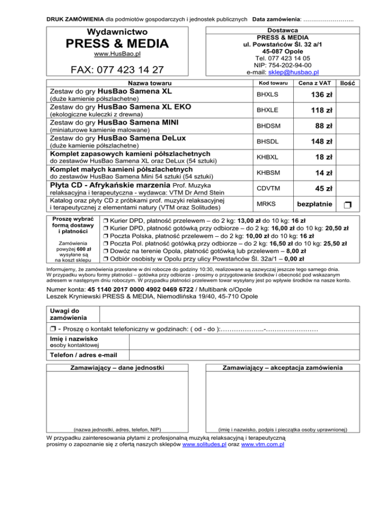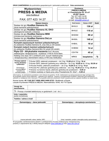 DRUK ZAMÓWIENIA dla podmiotów gospodarczych i jednostek publicznych Data zamówienia: …………………….. Dostawca PRESS & MEDIA ul. Powstańców Śl. 32 a/1 45-087 Opole Tel. 077 423 14 05 NIP: 754-202-94-00 e-mail: [email protected] Wydawnictwo PRESS & MEDIA www.HusBao.pl FAX: 077 423 14 27 Nazwa towaru Kod towaru Zestaw do gry HusBao Samena XL (duże kamienie półszlachetne) Zestaw do gry HusBao Samena XL EKO (ekologiczne kuleczki z drewna) Zestaw do gry HusBao Samena MINI (miniaturowe kamienie malowane) Zestaw do gry HusBao Samena DeLux (duże kamienie półszlachetne) Komplet zapasowych kamieni półszlachetnych do zestawów HusBao Samena XL oraz DeLux (54 sztuki) Komplet małych kamieni półszlachetnych do zestawów HusBao Samena Mini 54 sztuki (54 sztuki) Płyta CD - Afrykańskie marzenia Prof. Muzyka relaksacyjna i terapeutyczna - wydawca: VTM Dr Arnd Stein Katalog oraz płyty CD z próbkami prof. muzyki relaksacyjnej i terapeutycznej z elementami natury (VTM oraz Solitudes) Proszę wybrać formą dostawy i płatności Zamówienia powyżej 600 zł wysyłane są na koszt sklepu Cena z VAT BHXLS 136 zł BHXLE 118 zł BHDSM 88 zł BHSDL 148 zł KHBXL 18 zł KHBSM 14 zł CDVTM 45 zł MRKS Ilość bezpłatnie ❐ ❐ Kurier DPD, płatność przelewem – do 2 kg: 13,00 zł do 10 kg: 16 zł ❐ Kurier DPD, płatność gotówką przy odbiorze – do 2 kg: 16,00 zł do 10 kg: 20,50 zł ❐ Poczta Polska, płatność przelewem – do 2 kg: 10,00 zł do 10 kg: 16 zł ❐ Poczta Pol. płatność gotówką przy odbiorze – do 2 kg: 16,50 zł do 10 kg: 25,50 zł ❐ Dowóz na terenie Opola, płatność gotówką lub przelewem – 8,00 zł ❐ Odbiór osobisty w Opolu przy ulicy Powstańców Śl. 32a/1 – 0,00 zł Informujemy, że zamówienia przesłane w dni robocze do godziny 10:30, realizowane są zazwyczaj jeszcze tego samego dnia. W przypadku wyboru formy płatności – gotówka przy odbiorze - prosimy o przygotowanie środków i obecność pod wskazanym adresem w następnym dniu roboczym. W przypadku płatności przelewem towar wysyłany jest po wpływie środków na nasze konto. Numer konta: 45 1140 2017 0000 4902 0469 6722 / Multibank o/Opole Leszek Kryniewski PRESS & MEDIA, Niemodlińska 19/40, 45-710 Opole Uwagi do zamówienia ❐ - Proszę o kontakt telefoniczny w godzinach: ( od - do ):………………..-…………………… Imię i nazwisko osoby kontaktowej Telefon / adres e-mail Zamawiający – dane jednostki Zamawiający – akceptacja zamówienia (nazwa jednostki, adres, telefon, NIP) (imię i nazwisko, podpis i pieczątka osoby uprawnionej) W przypadku zainteresowania płytami z profesjonalną muzyką relaksacyjną i terapeutyczną prosimy o zapoznanie się z ofertą naszych sklepów www.solitudes.pl oraz www.vtm.com.pl
