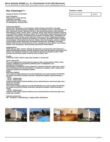 Biuro Podróży WIGRA s.c. ul. Człuchowska 25 01-360 Warszawa Tel. 22 665 06 06, 22 664 94 86, www.wigra.com.pl, e-mail: [email protected] Roc Flamingo*** Hiszpania 06.03-13.03.2016 Termin i cena 06.03-13.03.2016 2199 zł Kraj: Hiszpania Miejscowość: Costa del Sol Transport: Samolot Data ważności: 2016-03-06 Nr katalogowy: Wczasy/2015 Informacje Ogólne: Witamy Roc Flamingo w Torremolinos. Hotel położony jest 850 m od plaży piaszczysta. Miasta położone najbliżej hotelu to Malaga (16 km) i Benalmadena (8 km). Pozostałe miasta: Marbella (46 km). Dla Państwa komfortu hotel posiada klimatyzację, lobby, winda, salon i recepcję. Dzieci mają własny program animacji oraz możliwość zabawy na placu zabaw. W 11-piętrowym hotelu personel mówi po angielsku i hiszpańsku. Do dyspozycji jest basen ze słodką wodą . Znajdujący się przy basenie bar oferuje swoim gościom relaks przy drinku. Bezpłatne parasole słoneczne i leżaki do opalania są dostępne na basenie. W pobliżu hotelu znajdują się dyskoteka, informacja turystyczna, sklepy, bary/restauracje, centrum miasta, supermarket, postój taksówek i przystanek autobusowy. Odległość od hotelu: lotnisko AGP (8 km), Puerto Marina (3 km) i Aqualand (1 km). Oferta rozrywkowa hotelu: sala telewizyjna. Hotel posiada parking dla samochodów. Udogodnienia: Hotel oferuje sejfy i kantor. Dostęp do Internetu w terminalach internetowych i bezprzewodowego poprzez hotspot. Rodzinny hotel oferuje zajęcia animacyjne dla dzieci, aby zapewnić rodzicom i najmłodszym gościom przyjemny pobyt. Hotel posiada salę konferencyjną. Godziny pracy recepcji: 24h. Posiłki: Śniadanie: bufet. Goście mogą zjeść posiłek w restauracji. Sport i Rozrywka: W ramach aktywności hotel oferuje program zajęć animacyjnych, bilard i tenis stołowy. Najbliższe pole golfowe położone jest w odległości 5 km. Dodatkowe Informacje: Akceptujemy następujące formy płatności: American Express, karta Visa i karta Eurocard/MasterCard. Za korzystanie z niektórych urządzeń, ofert i aktywności mogą być pobierane dodatkowe opłaty. Bagaż Warszawa Modlin, Cena zawiera bagaż podręczny 10 kg (55x40x20) oraz małą torebkę (35x20x20) Do każdej rezerwacji istnieje możliwość dokupienia bagażu rejestrowanego o wadze; - 15 kg – 150zł/osobę - 20 kg – 250zł/osobę Uwaga! Jeżeli bagaż zostanie dodany już po potwierdzeniu rezerwacji jego cena może ulec zmianie. Warszawa Chopin Cena zawiera bagaż podręczny 10 kg (55x40x20) oraz małą torebkę (35x20x20) Do każdej rezerwacji istnieje możliwość dokupienia bagażu rejestrowanego o wadze - 20 kg – 130zł/osobę Uwaga! Jeżeli bagaż zostanie dodany już po potwierdzeniu rezerwacji jego cena może ulec zmianie. Rodzaje wyżywienia HB - śniadania i obiadokolacje, napoje płatne dodatkowo 1/1 Powered by TCPDF (www.tcpdf.org)