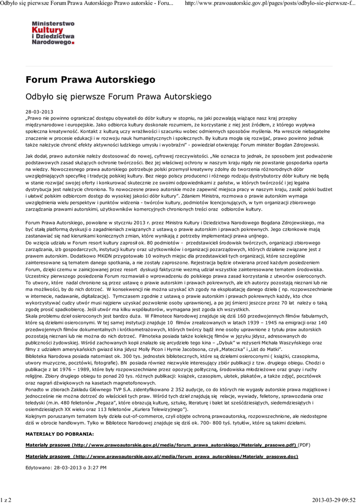 Odbyło się pierwsze Forum Prawa Autorskiego Prawo autorskie - Foru... http://www.prawoautorskie.gov.pl/pages/posts/odbylo-sie-pierwsze-f... Forum Prawa Autorskiego Odbyło się pierwsze Forum Prawa Autorskiego 28-03-2013 „Prawo nie powinno ograniczać dostępu obywateli do dóbr kultury w stopniu, na jaki pozwalają wiążące nasz kraj przepisy międzynarodowe i europejskie. Jako odbiorca kultury doskonale rozumiem, że korzystanie z niej jest źródłem, z którego wypływa społeczna kreatywność. Kontakt z kulturą uczy wrażliwości i szacunku wobec odmiennych sposobów myślenia. Ma wreszcie niebagatelne znaczenie w procesie edukacji i w rozwoju nauk humanistycznych i społecznych. By kultura mogła się rozwijać, prawo powinno jednak także należycie chronić efekty aktywności ludzkiego umysłu i wyobraźni” - powiedział otwierając Forum minister Bogdan Zdrojewski. Jak dodał, prawo autorskie należy dostosować do nowej, cyfrowej rzeczywistości. „Nie oznacza to jednak, że sposobem jest podważenie podstawowych zasad służących ochronie twórczości. Bez jej właściwej ochrony w naszym kraju nigdy nie powstanie gospodarka oparta na wiedzy. Nowoczesnego prawa autorskiego potrzebuje polski przemysł kreatywny zdolny do tworzenia różnorodnych dóbr uwzględniających specyfikę i tradycję polskiej kultury. Bez niego polscy producenci i różnego rodzaju dystrybutorzy dóbr kultury nie będą w stanie rozwijać swojej oferty i konkurować skutecznie ze swoimi odpowiednikami z państw, w których twórczość i jej legalna dystrybucja jest należycie chroniona. To nowoczesne prawo autorskie może zapewnić miejsca pracy w naszym kraju, zasilić polski budżet i ułatwić polskim odbiorcom dostęp do wysokiej jakości dóbr kultury”. Zdaniem Ministra, rozmowa o prawie autorskim wymaga uwzględnienia wielu perspektyw i punktów widzenia - twórców kultury, podmiotów licencjonujących, w tym organizacji zbiorowego zarządzania prawami autorskimi, użytkowników komercyjnych chronionych treści oraz odbiorców kultury. Forum Prawa Autorskiego, powołane w styczniu 2013 r. przez Ministra Kultury i Dziedzictwa Narodowego Bogdana Zdrojewskiego, ma być stałą platformą dyskusji o zagadnieniach związanych z ustawą o prawie autorskim i prawach pokrewnych. Jego członkowie mają zastanawiać się nad kierunkami koniecznych zmian, które wynikają z potrzeby implementacji prawa unijnego. Do wzięcia udziału w Forum resort kultury zaprosił ok. 80 podmiotów - przedstawicieli środowisk twórczych, organizacji zbiorowego zarządzania, izb gospodarczych, instytucji kultury oraz użytkowników i organizacji pozarządowych, których działanie związane jest z prawem autorskim. Dodatkowo MKiDN przygotowało 10 wolnych miejsc dla przedstawicieli tych organizacji, które szczególnie zainteresowane są tematem danego spotkania, a nie zostały zaproszone. Rejestracja będzie otwierana przed każdym posiedzeniem Forum, dzięki czemu w zainicjowanej przez resort dyskusji faktycznie wezmą udział wszystkie zainteresowane tematem środowiska. Uczestnicy pierwszego posiedzenia Forum rozmawiali o wprowadzeniu do polskiego prawa zasad korzystania z utworów osieroconych. To utwory, które nadal chronione są przez ustawę o prawie autorskim i prawach pokrewnych, ale ich autorzy pozostają nieznani lub nie ma możliwości, by do nich dotrzeć. W konsekwencji nie można uzyskać ich zgody na eksploatację danego dzieła ( np. rozpowszechnianie w internecie, nadawanie, digitalizację). Tymczasem zgodnie z ustawą o prawie autorskim i prawach pokrewnych każdy, kto chce wykorzystywać cudzy utwór musi najpierw uzyskać pozwolenie osoby uprawnionej, a po jej śmierci jeszcze przez 70 lat należy o taką zgodę prosić spadkobiercę. Jeśli utwór ma kilku współautorów, wymagana jest zgoda ich wszystkich. Skala problemu dzieł osieroconych jest bardzo duża. W Filmotece Narodowej znajduje się dziś 160 przedwojennych filmów fabularnych, które są dziełami osieroconymi. W tej samej instytucji znajduje 10 filmów zrealizowanych w latach 1939 – 1945 na emigracji oraz 140 przedwojennych filmów dokumentalnych i krótkometrażowych, których twórcy bądź inne osoby uprawnione z tytułu praw autorskich pozostają nieznani lub nie można do nich dotrzeć. Filmoteka posiada także kolekcję filmów w języku jidysz, adresowanych do publiczności żydowskiej. Wśród zachowanych kopii znalazło się arcydzieło tego kina – „Dybuk” w reżyserii Michała Waszyńskiego oraz filmy z udziałem amerykańskich gwiazd kina jidysz Molly Picon i Hymie Jacobsona, czyli „Mateczka” i „List do Matki”. Biblioteka Narodowa posiada natomiast ok. 300 tys. jednostek bibliotecznych, które są dziełami osieroconymi ( książki, czasopisma, utwory muzyczne, pocztówki, fotografie). BN posiada również niezwykle interesujący zbiór publikacji z tzw. drugiego obiegu. Chodzi o publikacje z lat 1976 – 1989, które były rozpowszechniane przez opozycję polityczną, środowiska młodzieżowe oraz grupy i ruchy religijne. Zbiory drugiego obiegu to ponad 20 tys. różnych publikacji: książek, czasopism, ulotek, plakatów, a także zdjęć, pocztówek oraz nagrań dźwiękowych na kasetach magnetofonowych. Ponadto w zbiorach Zakładu Głównego TVP S.A. zidentyfikowano 2 352 audycje, co do których nie wygasły autorskie prawa majątkowe i jednocześnie nie można dotrzeć do właścicieli tych praw. Wśród tych dzieł znajdują się relacje, wywiady, felietony, sprawozdania oraz teledyski (m.in. 480 felietonów „Pegaza”, które obrazują kulturę, sztukę, literaturę i balet lat sześćdziesiątych, siedemdziesiątych i osiemdziesiątych XX wieku oraz 113 felietonów „Kuriera Telewizyjnego”). Kolejnym poruszanym tematem były dzieła out-of-commerce, czyli objęte ochroną prawoautorską, rozpowszechnione, ale niedostępne dziś w obrocie handlowym. Tylko w Bibliotece Narodowej 