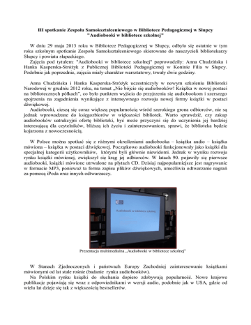 III spotkanie Zespołu Samokształceniowego w Bibliotece Pedagogicznej w Słupcy "Audiobooki w bibliotece szkolnej" W dniu 29 maja 2013 roku w Bibliotece Pedagogicznej w Słupcy, odbyło się ostatnie w tym roku szkolnym spotkanie Zespołu Samokształceniowego skierowane do nauczycieli bibliotekarzy Słupcy i powiatu słupeckiego. Zajęcia pod tytułem: "Audiobooki w bibliotece szkolnej" poprowadziły: Anna Chudzińska i Hanka Kasperska-Stróżyk z Publicznej Biblioteki Pedagogicznej w Koninie Filia w Słupcy. Podobnie jak poprzednie, zajęcia miały charakter warsztatowy, trwały dwie godziny. Anna Chudzińska i Hanka Kasperska-Stróżyk uczestniczyły w nowym szkoleniu Biblioteki Narodowej w grudniu 2012 roku, na temat „Nie bójcie się audiobooków! Książka w nowej postaci na bibliotecznych półkach”, co było punktem wyjścia do przyjrzenia się audiobookom i szerszego spojrzenia na zagadnienia wynikające z intensywnego rozwoju nowej formy książki w postaci dźwiękowej. Audiobooki, cieszą się coraz większą popularnością wśród szerokiego grona odbiorców, nie są jednak wprowadzane do księgozbiorów w większości bibliotek. Warto sprawdzić, czy zakup audiobooków uatrakcyjni ofertę biblioteki, być może przyczyni się do uczynienia jej bardziej interesującą dla czytelników, bliższą ich życiu i zainteresowaniom, sprawi, że biblioteka będzie kojarzona z nowoczesnością. W Polsce można spotkać się z różnymi określeniami audiobooka – książka audio – książka mówiona – książka w postaci dźwiękowej. Początkowo audiobooki funkcjonowały jako książki dla specjalnej kategorii użytkowników, którymi byli głównie niewidomi. Jednak w wyniku rozwoju rynku książki mówionej, zwiększył się krąg jej odbiorców. W latach 90. pojawiły się pierwsze audiobooki, książki mówione utrwalone na płytach CD. Dzisiaj najpopularniejsze jest nagrywanie w formacie MP3, ponieważ ta forma zapisu plików dźwiękowych, umożliwia odtwarzanie nagrań za pomocą iPoda oraz innych odtwarzaczy. Prezentacja multimedialna „Audiobooki w bibliotece szkolnej” W Stanach Zjednoczonych i państwach Europy Zachodniej zainteresowanie książkami mówionymi od lat stale rośnie (badanie rynku audiobooków). Na Polskim rynku książki do słuchania dopiero zdobywają popularność. Nowe krajowe publikacje pojawiają się wraz z odpowiednikami w wersji audio, podobnie jak w USA, gdzie od wielu lat dzieje się tak z większością bestsellerów. Zgodnie z zapowiadanym programem omówiono następujące zagadnienia: Rynek audiobooków w Polsce: terminologia, podstawowe pojęcia, używane określenia, ustawa o podatku od towarów i usług VAT – audiobook to książka, książka mówiona a książka drukowana, mity na temat książek do słuchania, promocja audiobooków. Mediateki w Polsce – przykłady wypożyczalni książki audio: Mediateka Wrocław / 2004, Planeta 11 – Multimedialna Biblioteka Młodych – Olsztyn / 2004, Mediateka Start-Meta – Warszawa Bielany / 2010, Biblioteka Manhattan – Gdańsk Wrzeszcz / 2012, Biblioteka Multimedialna „Biblio” – Lublin / 2012, Arteteka – Gmach Małopolskiego Ogrodu Sztuki w Krakowie / 2013, Gromadzenie książek audio w bibliotece szkolnej. Odbiorcy. Udostępnianie audiobooków a prawo autorskie. Możliwości wykorzystania audiobooków w pracy z dziećmi i młodzieżą. „Słuchanie książek z dziećmi” w Bibliotece Pedagogicznej w Słupcy. Ostatnie spotkanie w roku szkolnym 2012/2013 Zespołu samokształceniowego nauczycieli bibliotekarzy z rejonu słupeckiego Uzupełnieniem zajęć o audiobookach była przygotowana przez prowadzące i przedstawiona prezentacja multimedialna ilustrująca omawiane zagadnienia. Anna Chudzińska i Hanka Kasperska-Stróżyk opowiedziały o przeprowadzonych w Bibliotece Pedagogicznej w Słupcy zajęciach dla przedszkolaków z wykorzystaniem książek audio, jako propozycji formy pracy z młodszymi dziećmi. Dzięki pomysłowi połączenia czytania poprzez słuchanie audiobooków z wizualizacją treści (pokazywane były prezentacje bajek i wierszy przygotowane przez prowadzące) zaprezentowano, jak w ciekawy i nowoczesny sposób można zachęcać dzieci do czytania. Przeprowadzenie w takiej formie zajęć uświadamia dzieciom, że czytanie książek jest wielką przyjemnością. Wszystkie przedszkolaki aktywnie uczestniczyły w zajęciach, odgadywały zagadki dotyczące znajomości utworów literatury dziecięcej (tytuły bajek i ich bohaterów). Wycieczka do biblioteki była dla dzieci również atrakcją. . Słuchanie książek z dziećmi w Bibliotece Pedagogicznej, które odbyło się 14 maja 2013 roku Nauczyciele bibliotekarze uczestniczący w spotkaniu zespołu samokształceniowego otrzymali tematyczne zestawienie bibliograficzne „Audiobooki. Mediateki” (wybór literatury dostępnej w zbiorach Publicznej Biblioteki Pedagogicznej w Koninie Filia w Słupcy). Zestawienie bibliograficzne jest zamieszczone na stronie internetowej naszej placówki. Oprac. Hanka Kasperska-Stróżyk