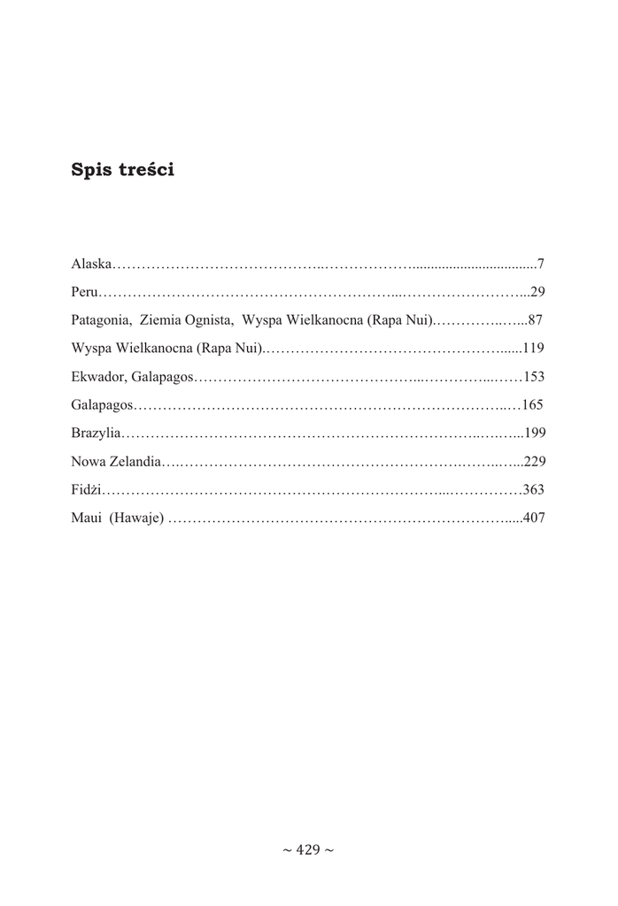 Spis treci Alaska……………………………………..………………..................................7 Peru……………………………………………………...……………………...29 Patagonia, Ziemia Ognista, Wyspa Wielkanocna (Rapa Nui).…………..…...87 Wyspa Wielkanocna (Rapa Nui).…………………………………………......119 Ekwador, Galapagos………………………………………...…………...……153 Galapagos…………………………………………………………………..…165 Brazylia………………………………………………………………..….…...199 Nowa Zelandia….………………………………………………….……..…...229 Fidi……………………………………………………………...……………363 Maui (Hawaje) …………………………………………………………….....407 ̱Ͷʹͻ̱