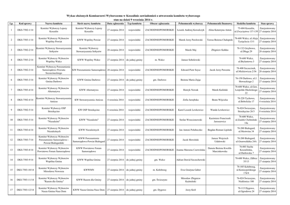 Wykaz złożonych Komisarzowi Wyborczemu w Koszalinie