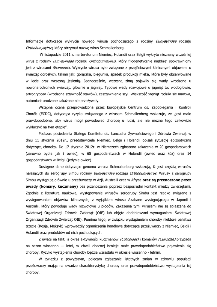 Informacje dotyczące wykrycia nowego wirusa pochodzącego z rodziny Bunyayiridae rodzaju Orthobunyayirus, który otrzymał nazwę wirus Schmallenberg. W listopadzie 2011 r. na terytorium Niemiec, Holandii oraz Belgii wykryto nieznany wcześniej wirus z rodziny Bunyayiridae rodzaju Orthobunyayirus, który filogenetycznie najbliżej spokrewniony jest z wirusami Shamonda. Wykrycie wirusa było związane z przejściowymi klinicznymi objawami u zwierząt dorosłych, takimi jak: gorączka, biegunka, spadek produkcji mleka, które były obserwowane w lecie oraz wczesną jesienią. Jednocześnie, wczesną zimą pojawiły się wady wrodzone u nowonarodzonych zwierząt, głównie u jagniąt. Typowe wady rozwojowe u jagniąt to: wodogłowie, artrogrypoza (wrodzona sztywność stawów), zesztywnienie szyi. Większość jagniąt rodziła się martwa, natomiast urodzone zakażone nie przeżywały. Wstępna ocena przeprowadzona przez Europejskie Centrum ds. Zapobiegania i Kontroli Chorób (ECDC), dotycząca ryzyka związanego z wirusem Schmallenberg wskazuje, że „jest mało prawdopodobne, aby wirus mógł powodować chorobę u ludzi, ale nie można tego całkowicie wykluczyć na tym etapie”. Podczas posiedzenia Stałego Komitetu ds. Łańcucha Żywnościowego i Zdrowia Zwierząt w dniu 11 stycznia 2012r., przedstawiciele Niemiec, Belgii i Holandii opisali sytuację epizootyczną dotyczącą choroby. Do 17 stycznia 2012r. w Niemczech zgłoszono zakażenia w 20 gospodarstwach (zarówno bydła jak i owiec), w 65 gospodarstwach w Holandii (owiec oraz kóz) oraz 14 gospodarstwach w Belgii (jedynie owiec). Dostępne dane dotyczące genomu wirusa Schmallenberg wskazują, iż jest częścią wirusów należących do serogrupy Simbu rodziny Bunyayiridae rodzaju Orthobunyayirus. Wirusy z serogrupy Simbu występują głównie u przeżuwaczy w Azji, Australii oraz w Afryce oraz są przenoszone przez owady (komary, kuczmany) bez przenoszenia poprzez bezpośredni kontakt miedzy zwierzętami. Zgodnie z literaturą naukową, występowanie wirusów serogrupy Simbu jest rzadko związane z występowaniem objawów klinicznych, z wyjątkiem wirusa Akabane występującego w Japonii i Australii, który powoduje wady rozwojowe u płodów. Zakażenia tymi wirusami nie są zgłaszane do Światowej Organizacji Zdrowia Zwierząt (OIE) lub objęte dodatkowymi wymaganiami Światowej Organizacji Zdrowia Zwierząt OIE). Pomimo tego, w związku wystąpieniem choroby niektóre państwa trzecie (Rosja, Meksyk) wprowadziły ograniczenia handlowe dotyczące przeżuwaczy z Niemiec, Belgii i Holandii oraz produktów od nich pochodzących. Z uwagi na fakt, iż okres aktywności kuczmanów (Culicoides) i komarów (Culicidae) przypada na sezon wiosenno — letni, w chwili obecnej istnieje małe prawdopodobieństwo pojawienia się choroby. Ryzyko wystąpienia choroby będzie wzrastało w okresie wiosenno - letnim. W związku z powyższym, polecam zgłaszanie istotnych zmian w zdrowiu populacji przeżuwaczy mając na uwadze charakterystykę choroby oraz prawdopodobieństwo wystąpienia tej choroby. Ponadto, polecam przekazanie informacji o chorobie lekarzom wolnej praktyki oraz rolnikom. Jednocześnie informuję, iż na stronie internetowej Państwowego Instytutu Weterynaryjnego Państwowego Instytutu Badawczego w Puławach pojawiła się nowa zakładka pt. „Zagrożenia epidemiczne”, w której umieszczono informacje o wirusie Schmallenberg. W chwili obecnej opracowana jest wstępnie metoda wykrywania wirusa RT - PCR, którą stosuje się głównie do badania obecności wirusa u płodów (z uwagi na krótki czas wiremii, która u dorosłych zwierząt trwa 2-4 dni). Trwają badania nad opracowaniem metod serologicznych do wykrywania zakażenia. Opracowywane testy seroneutralizacji i immunofluorescencji przeznaczone będą głównie do badań pojedynczych próbek, natomiast test ELI SA (w chwili obecnej będący w fazie opracowywania) zalecany będzie do prowadzenia badań przesiewowych. O dalszym rozwoju sytuacji epizootycznej będą Państwo informowani na bieżąco w zależności od oceny ryzyka zagrożenia wystąpienia choroby oraz stopnia niebezpieczeństwa dla zdrowia publicznego i hodowli zwierząt.